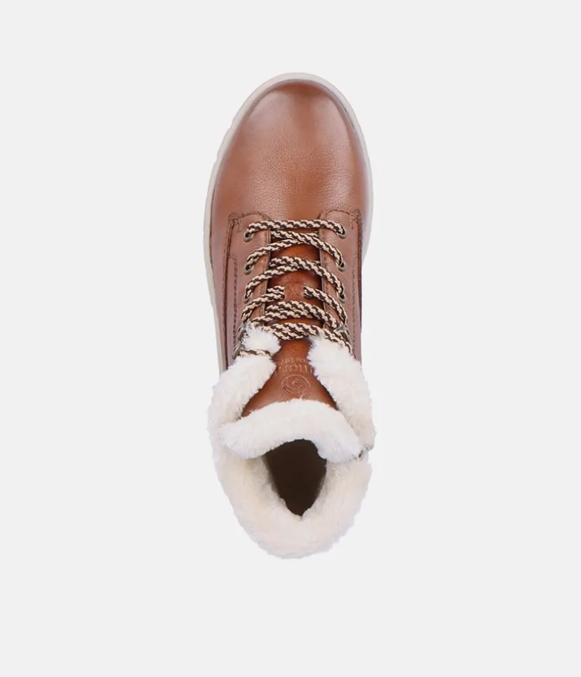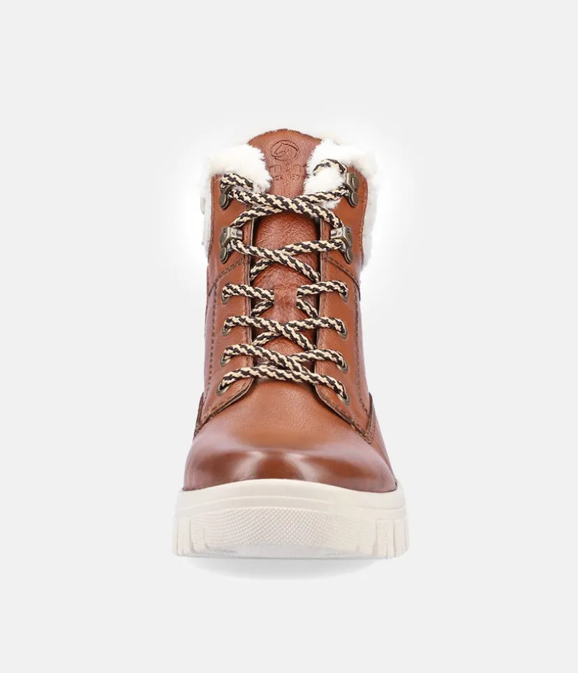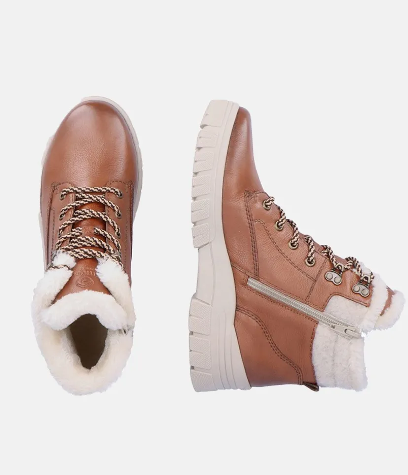 Remonte Tex Brown Ankle Boots with wool trim. These lovely boots from Remonte have leather uppers with a Remonte Tex functional layer making them water resistant while still being breathable, with a zip fastening allowing for easy on and off and removable memory foam soft insoles. The Lugg sole design adds a trendy yet practical touch. Why not wear with leggings and a cozy oversized sweater for a cosy outfit this season.