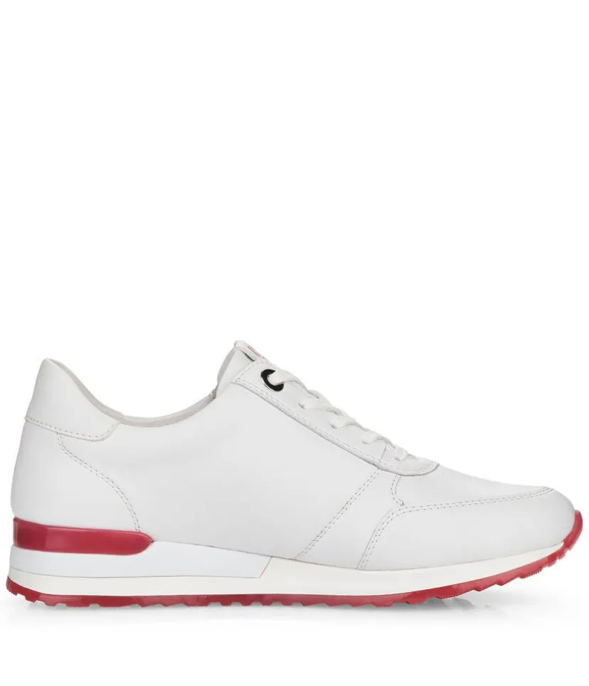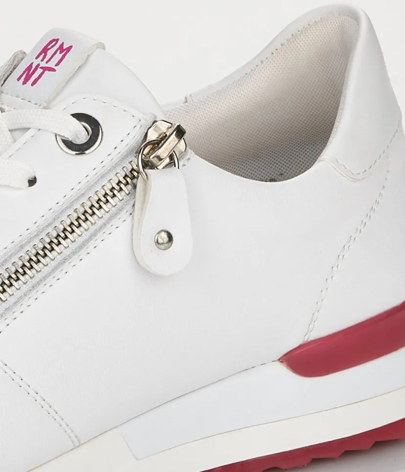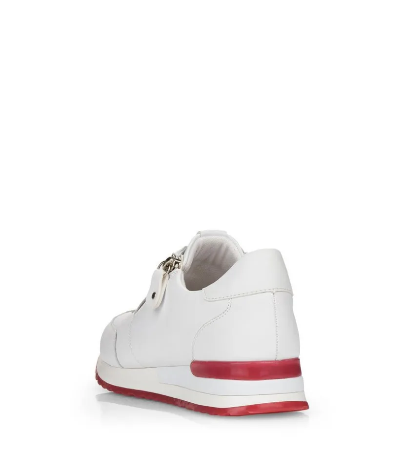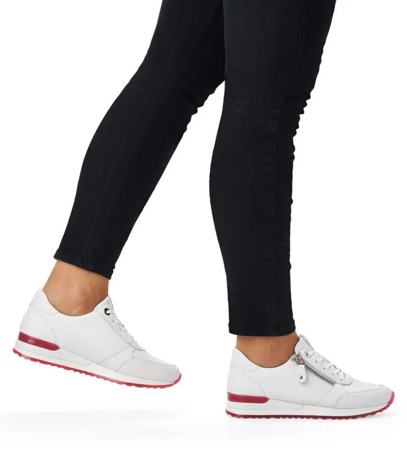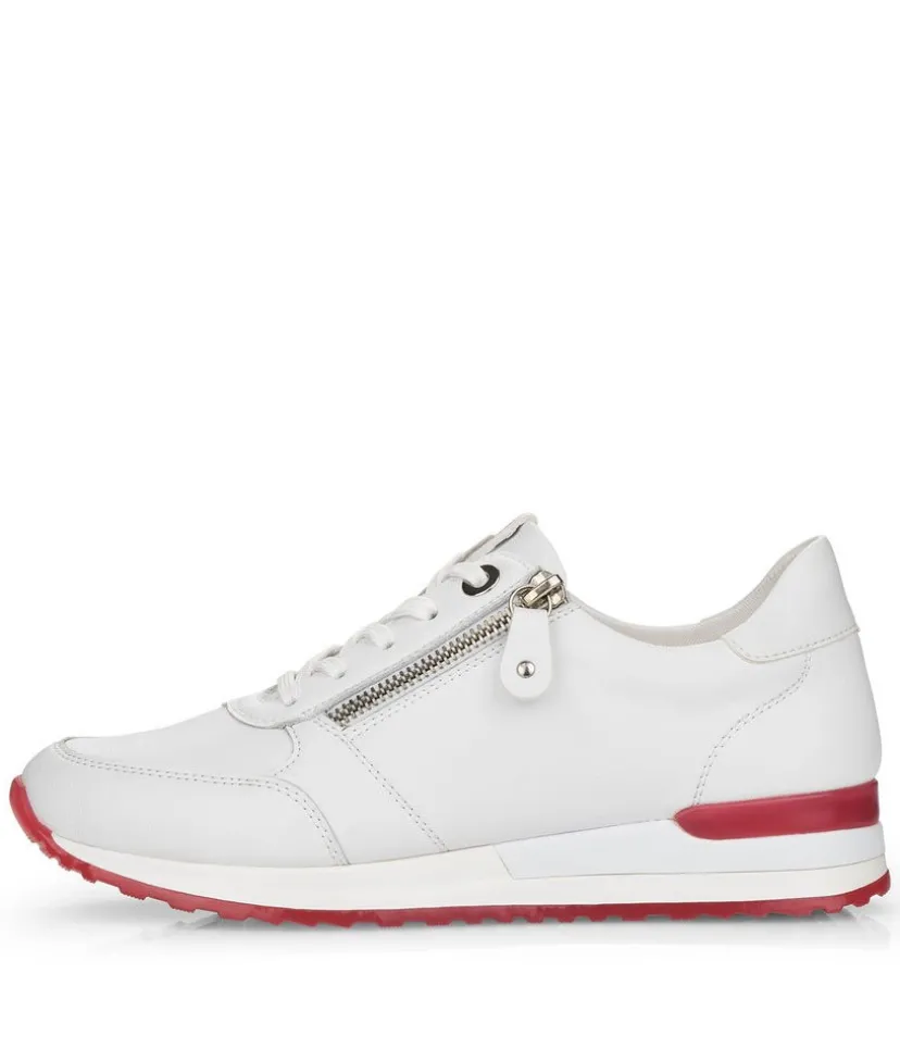 This is a Fashionable sneaker from Remonte with Leather upper and contrasting Red trim detail on the upper and sole. The padded soft insole ensures a comfortable fit and the lace up front allows the sneaker to be adjusted to your perfect fit while the side zip allows for easy on and off.