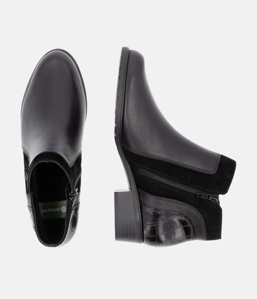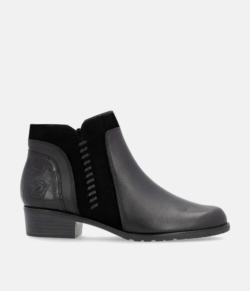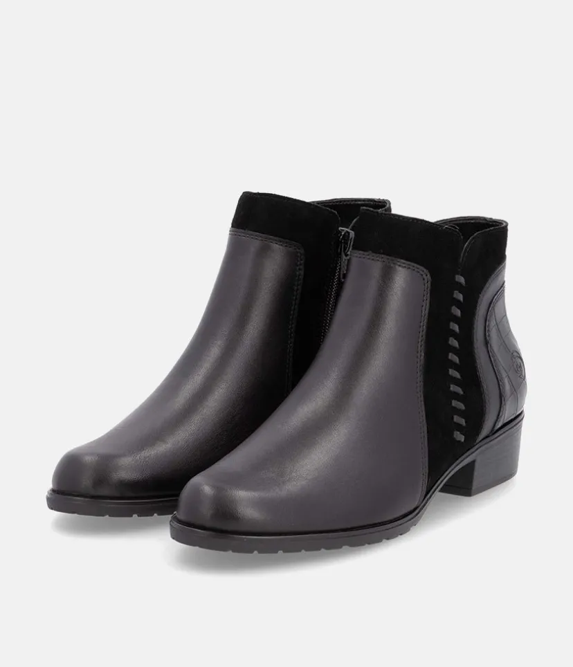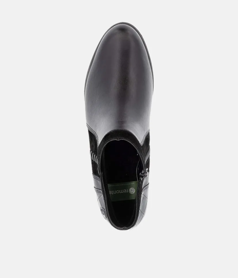 This is a great new style ankle boot from Remonte this season in classic Black leather with contrasting suede and textured panelling to complete this western inspired look. With an inside zip for easy access and a soft textile lining.