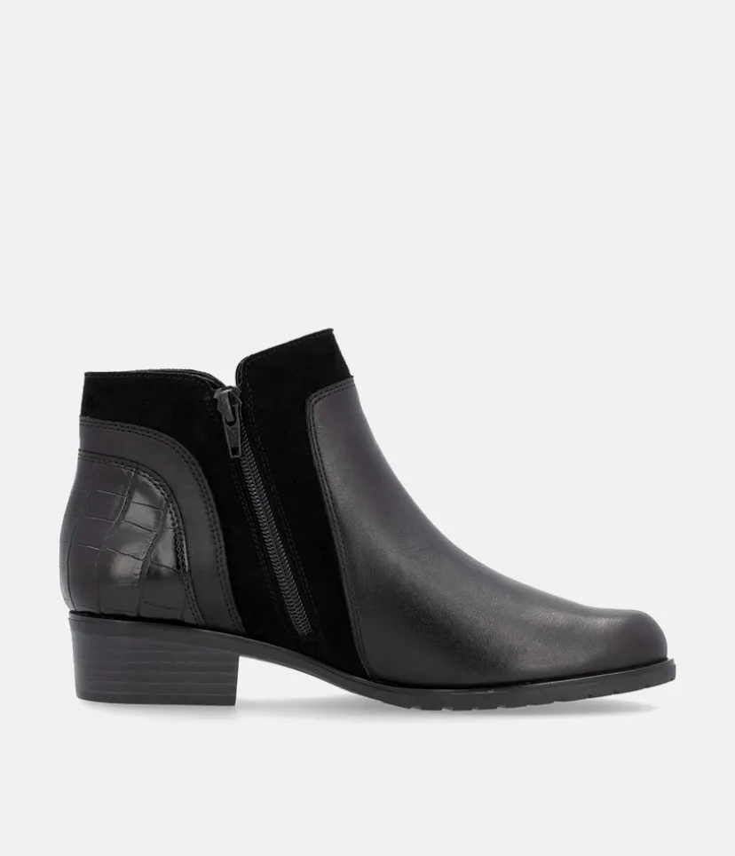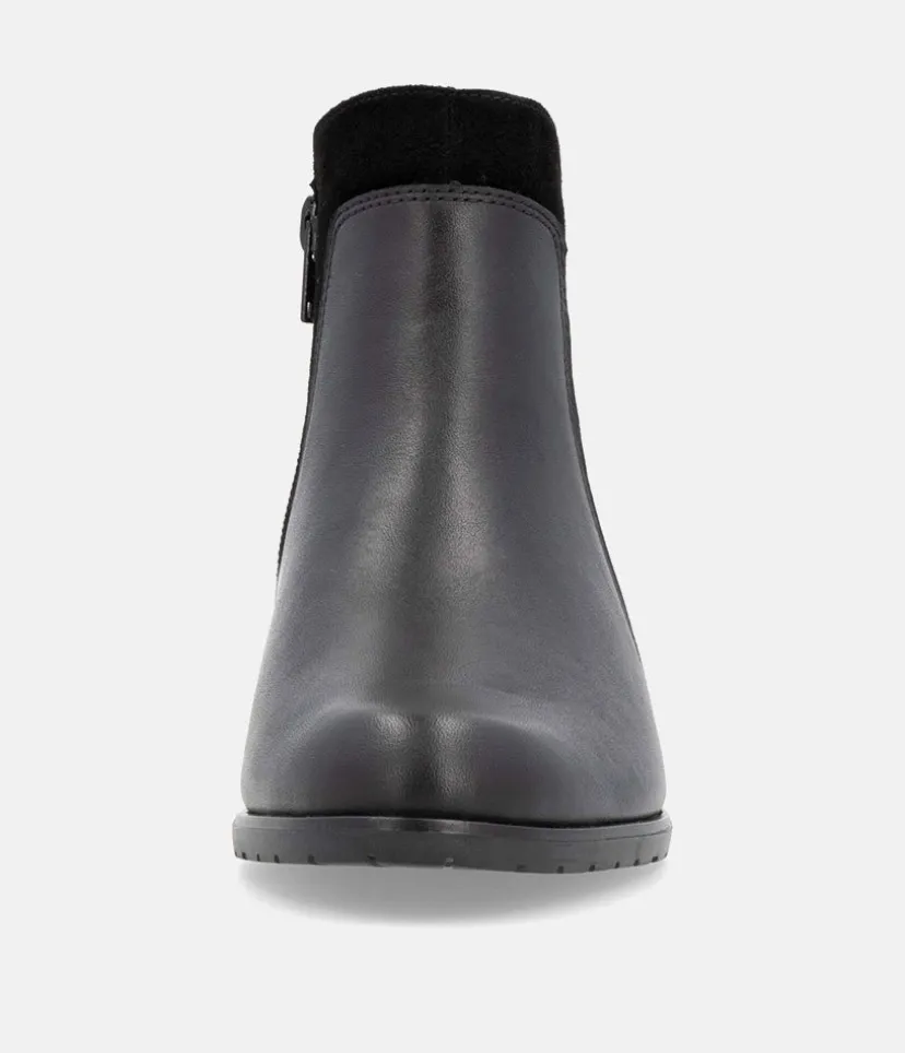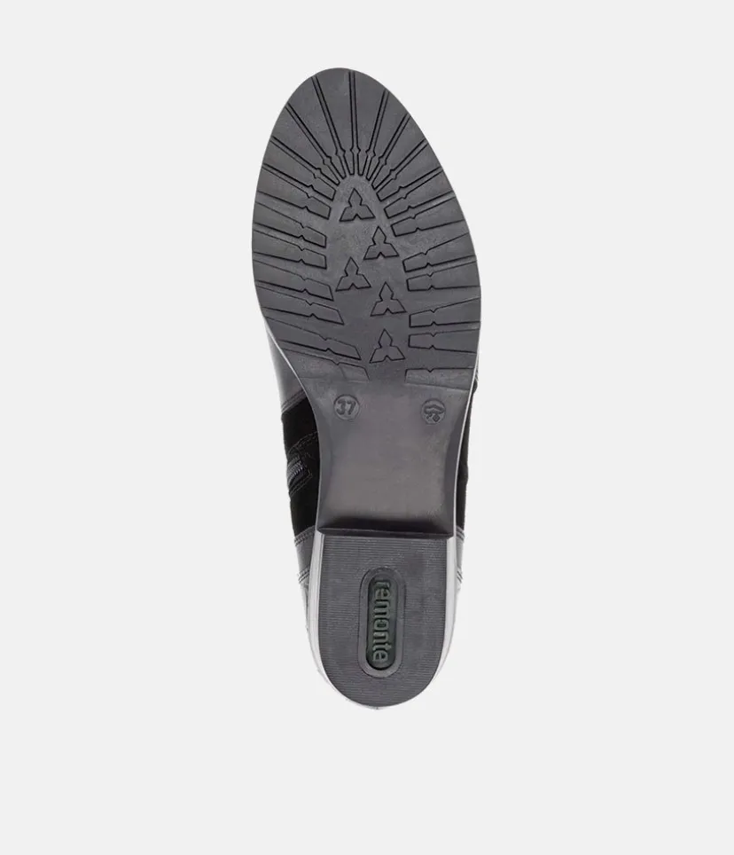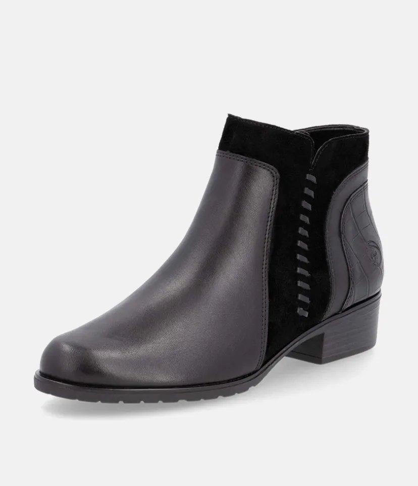 This is a great new style ankle boot from Remonte this season in classic Black leather with contrasting suede and textured panelling to complete this western inspired look. With an inside zip for easy access and a soft textile lining.