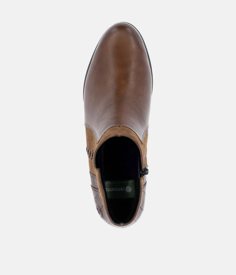 This is a great new style ankle boot from Remonte this season in a classic Chestnut Brown leather with contrasting suede and textured panelling to complete this western inspired look. With an inside zip for easy access and a soft textile lining.