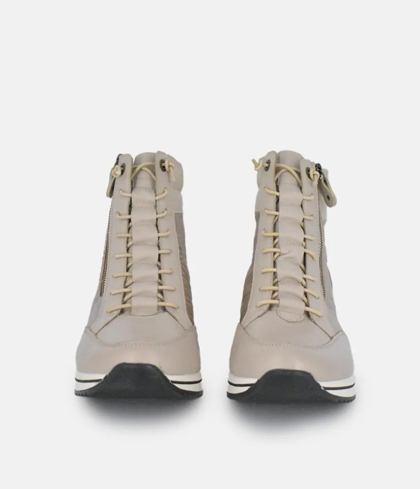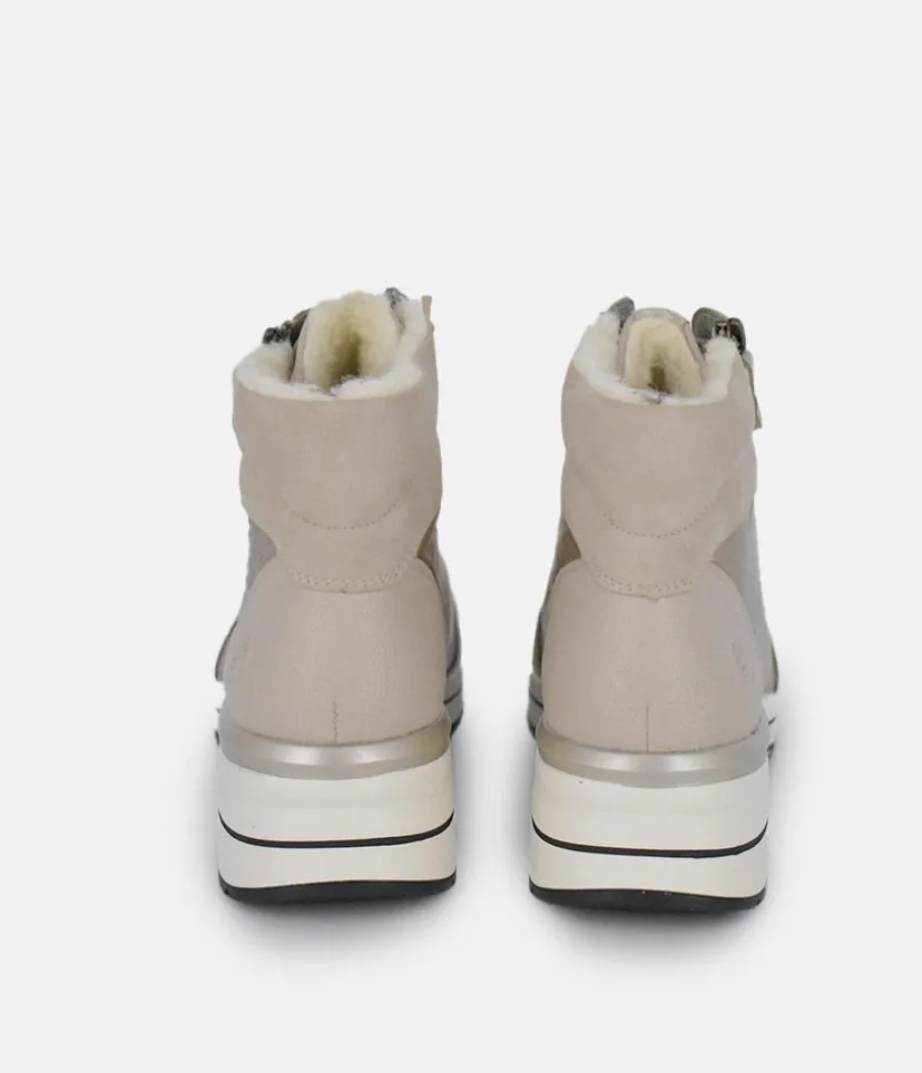 A stylish yet practical ladies high sided trainer bootie from Remonte, featuring a mix of Cream suede and synthetic leather uppers with a stylish pattern the side. Fastened with laces and a handy side zip for quick and easy on and off. Lined with a super soft textile, complete with a cushioned removable insole.