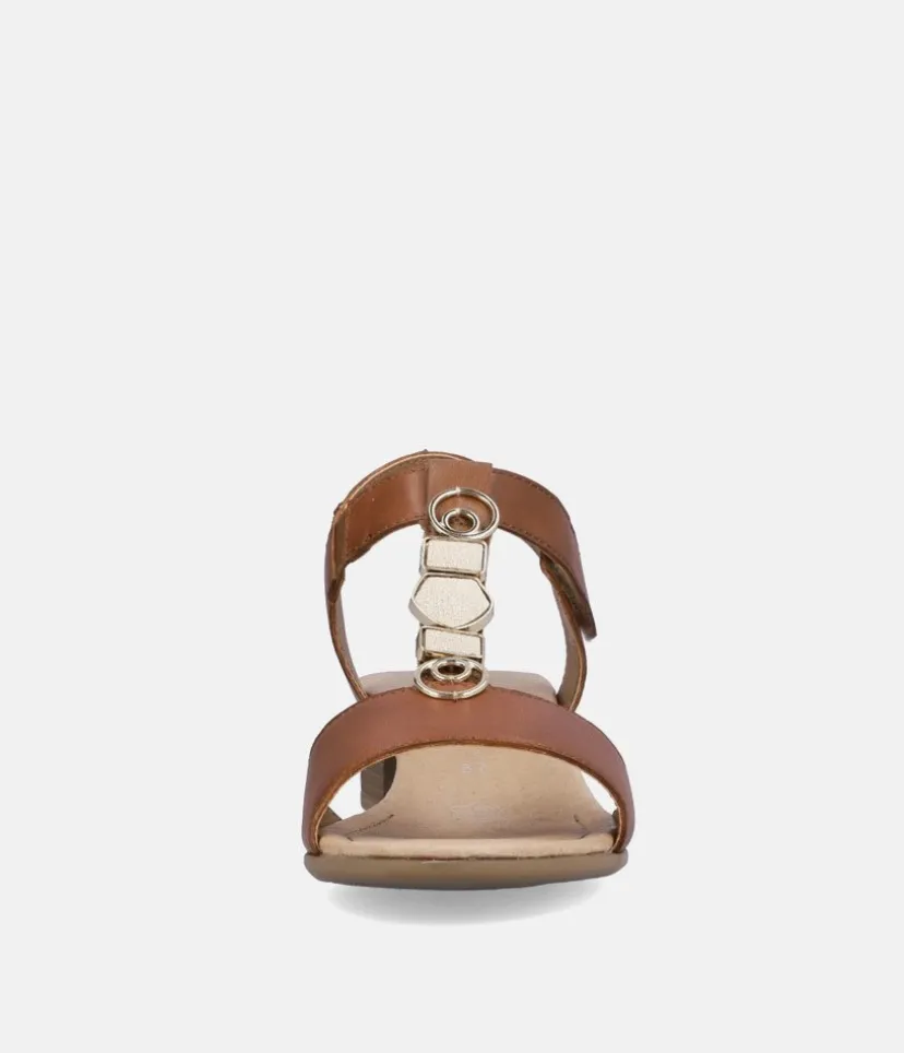 This is an ideal summer sandal featuring pretty embellishements on the t-bar and the small block heel is perfect for going from day to night. Crafted with tan leather uppers in an open toe and slingback style, you can dress up or down easily with this sandal from Remonte. This sandal is complete with a velcro strap for a secure and adjustable fit and is perfect for everyday wear with it’s soft leather upper. The elasticated materials add extra comfort and are ideal for easy on and off.