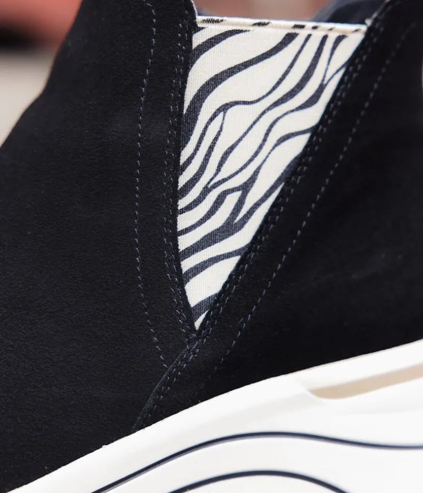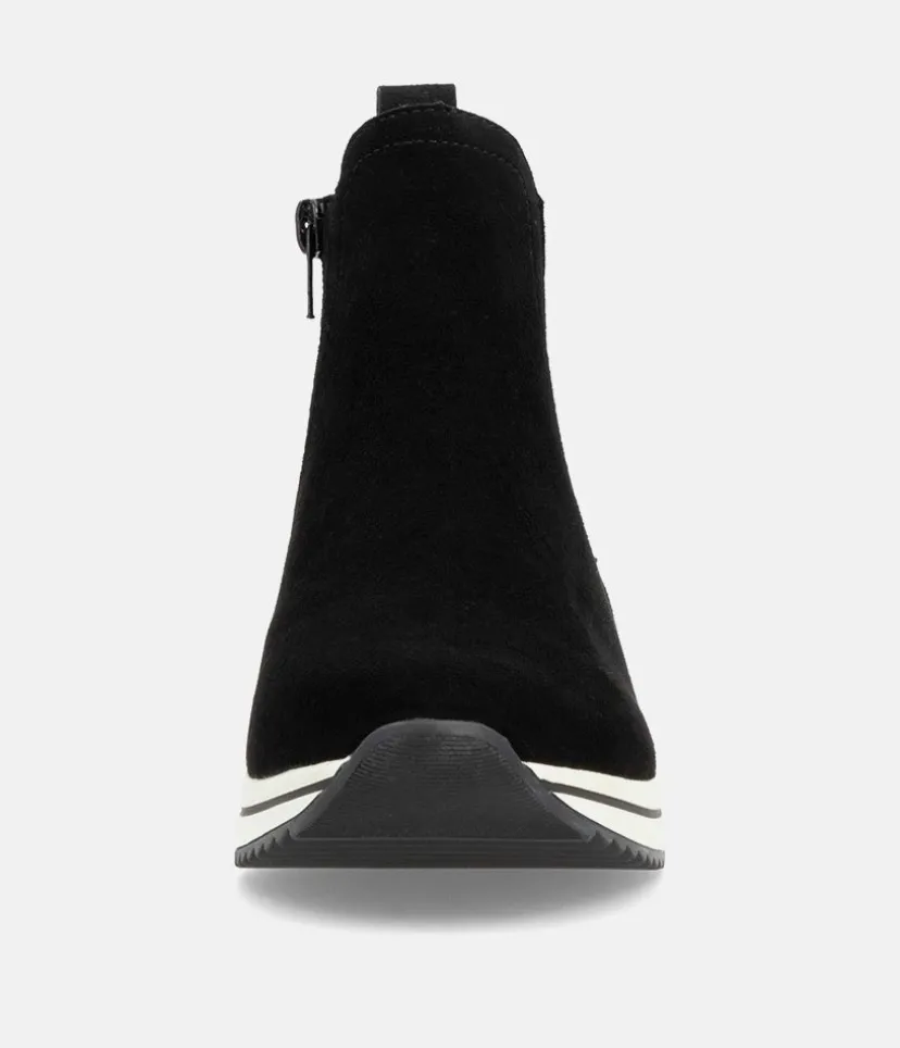 A Super comfortable and stylish ankle boot from Remonte featuring a combination upper in mix of Black Suede and eyecatching, Zebra Pattern and patterned Sole. Finished with a wedge heel for added height without losing on comfort. Complete with a soft lining with a cushioned Remonte Soft removable insole.
