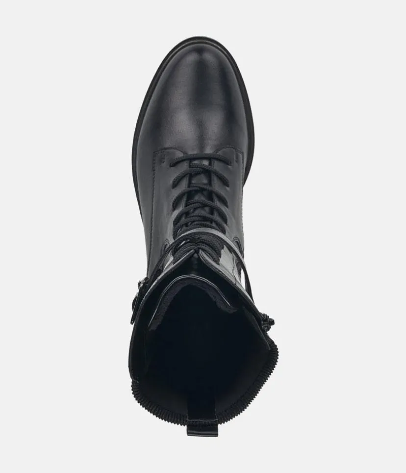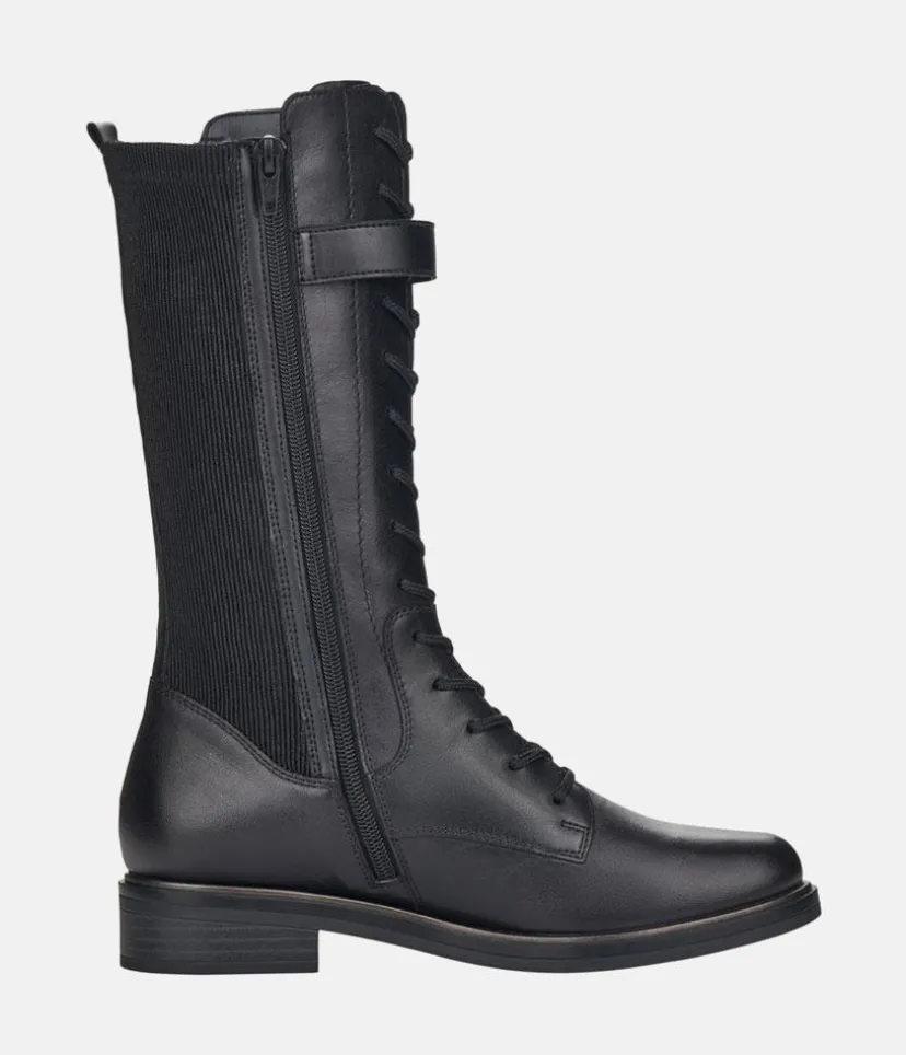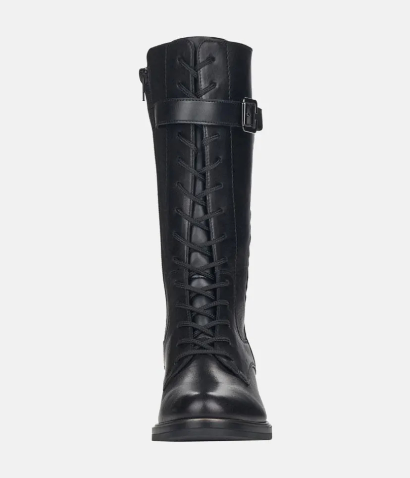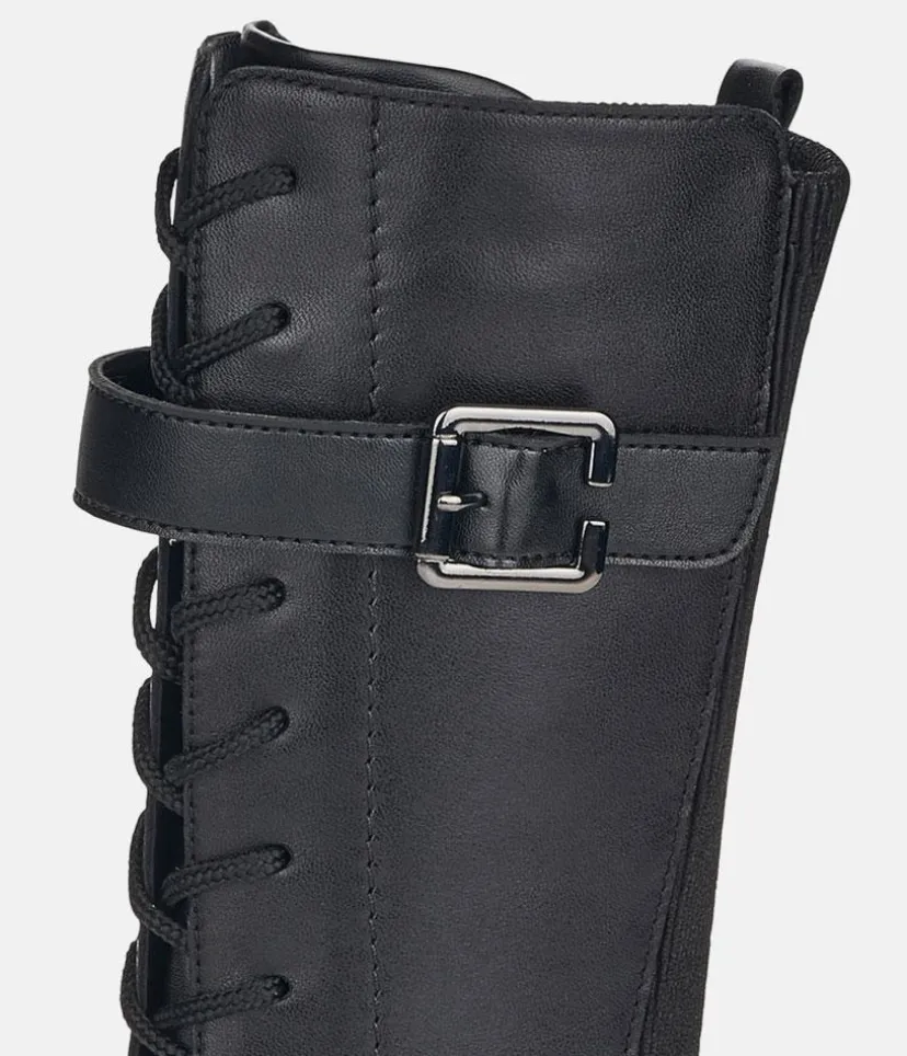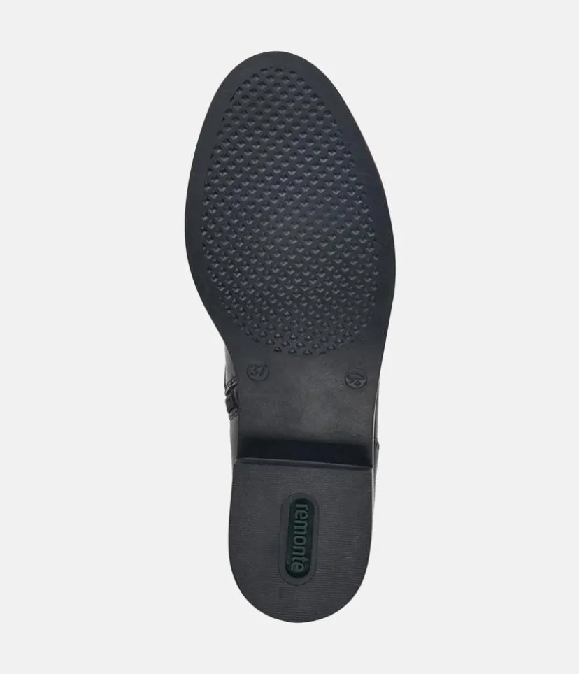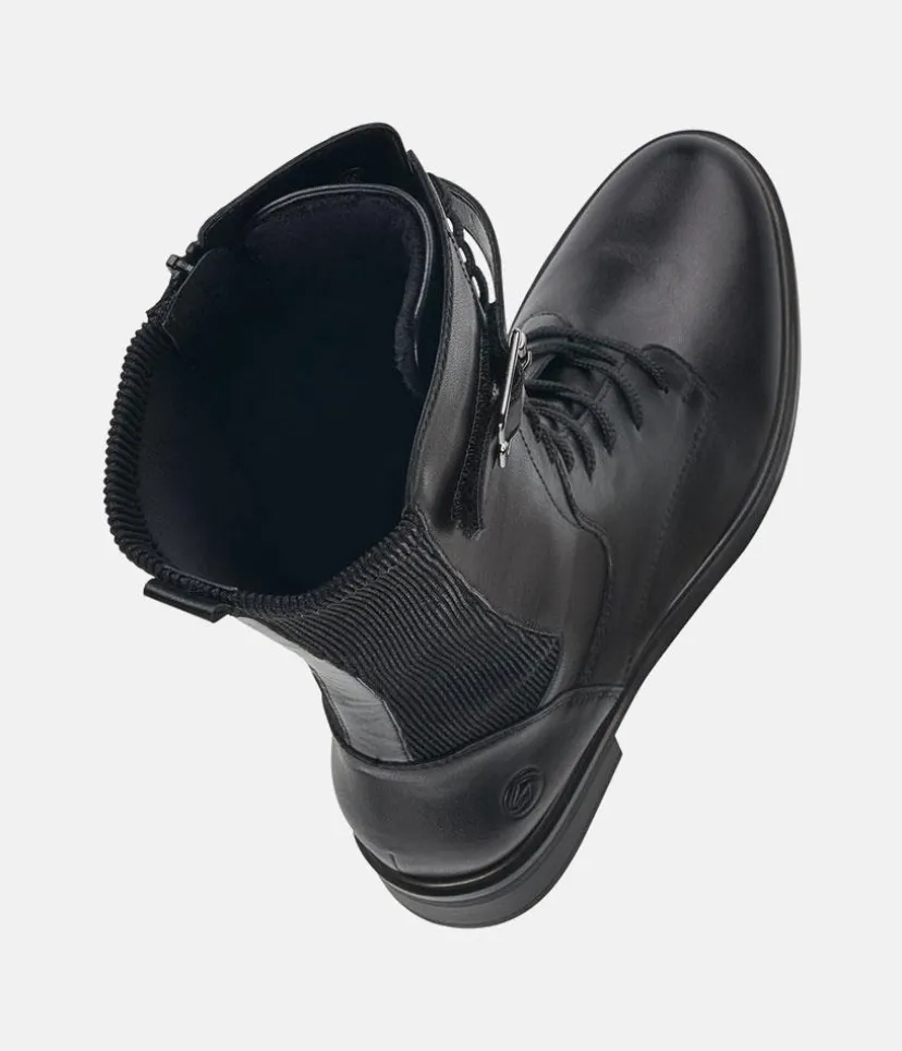 Black mid calf length winter boots from Remonte featuring a supple leather upper with lace up front and decorative buckle, and a full inside zip for easy on and off. These boots have a thick sole that provides a practical grip and traction with every step.