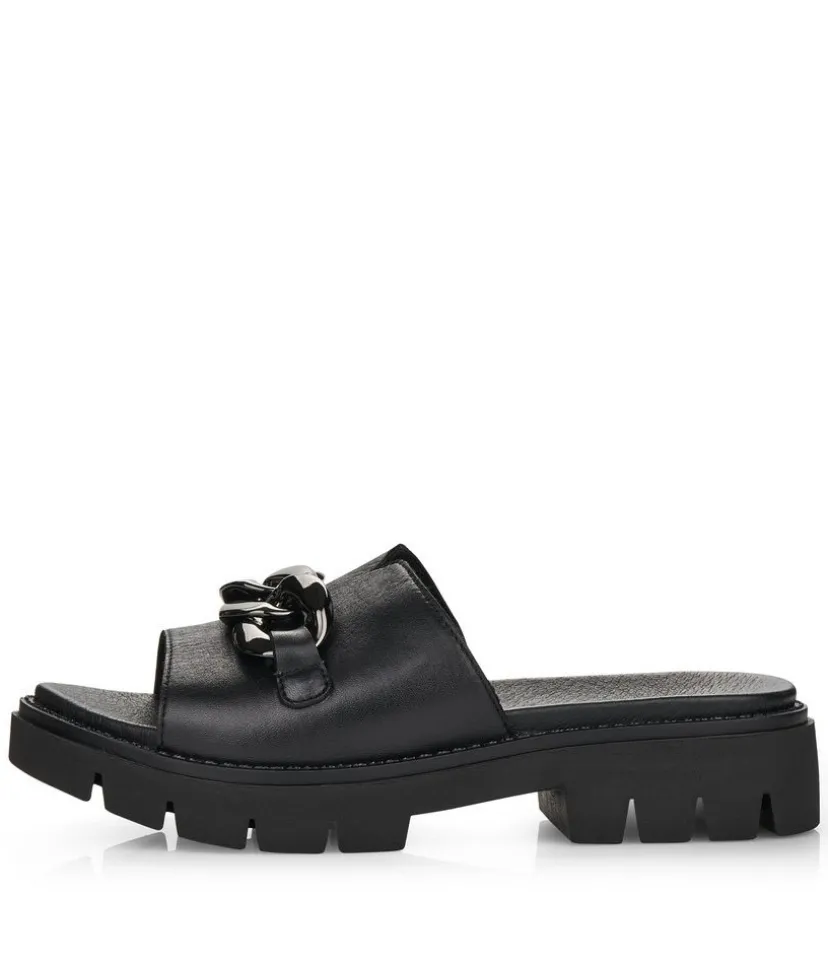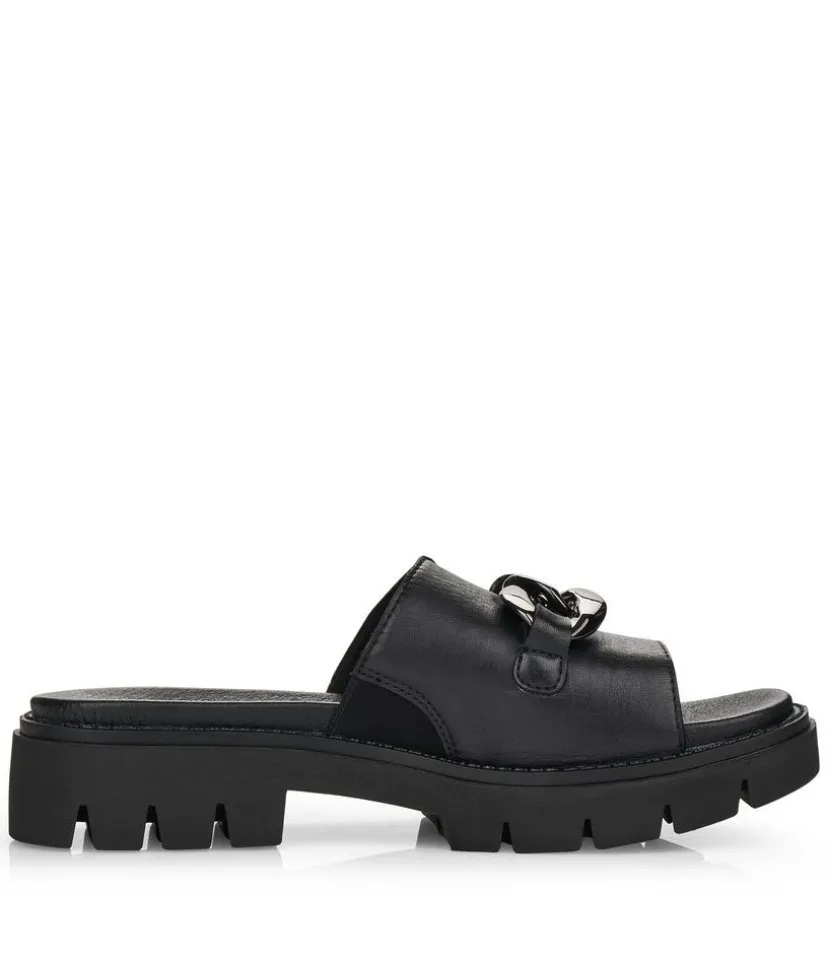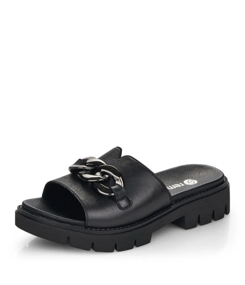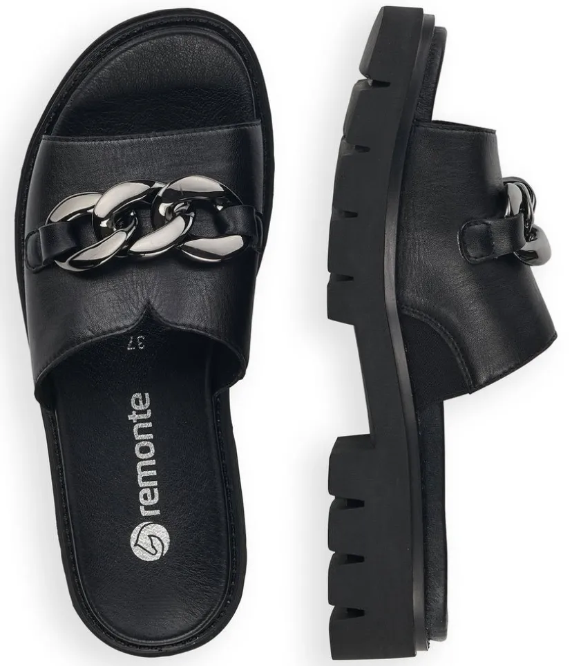 Elevate your look in every sense with these Trendy Slip on Sandals from Remonte. Simple in design, yet maximum on impact, these slides are a great choice for the warmer seasons. A wide strap crosses the instep ensures a secure comfortable fit, and the chain design is a real eye-catcher. The chunky black sole rounds off the shoe’s look of edgy sophistication. The Memosoft insole offers extra comfort and pampers your feet all day long.