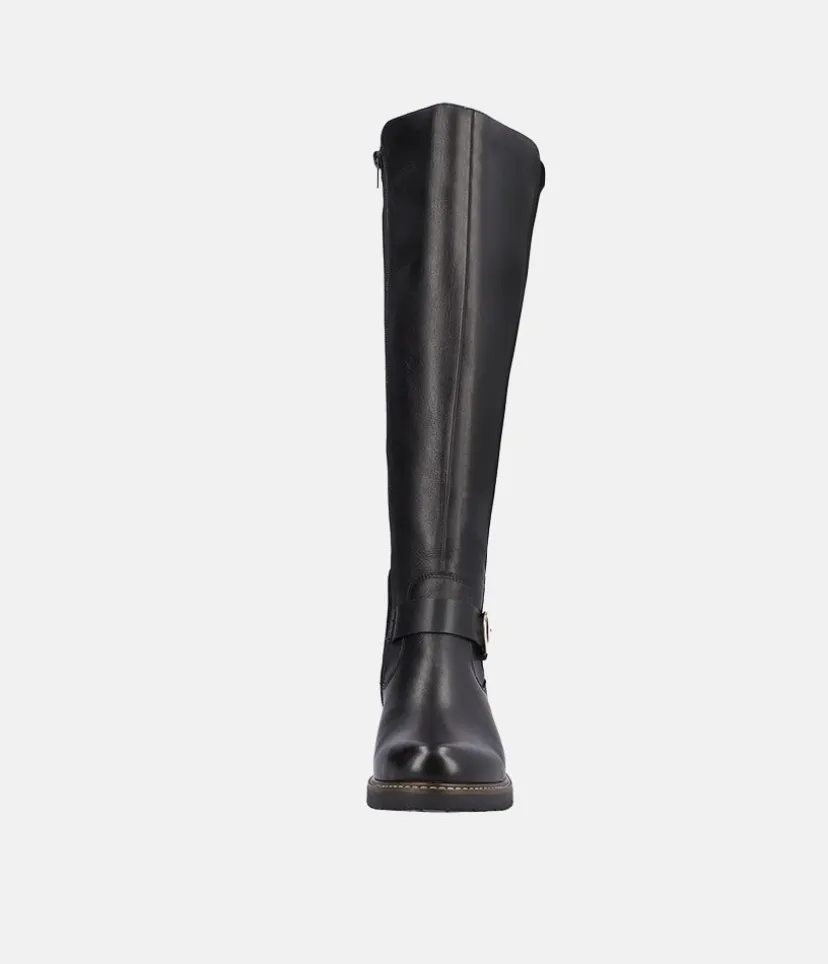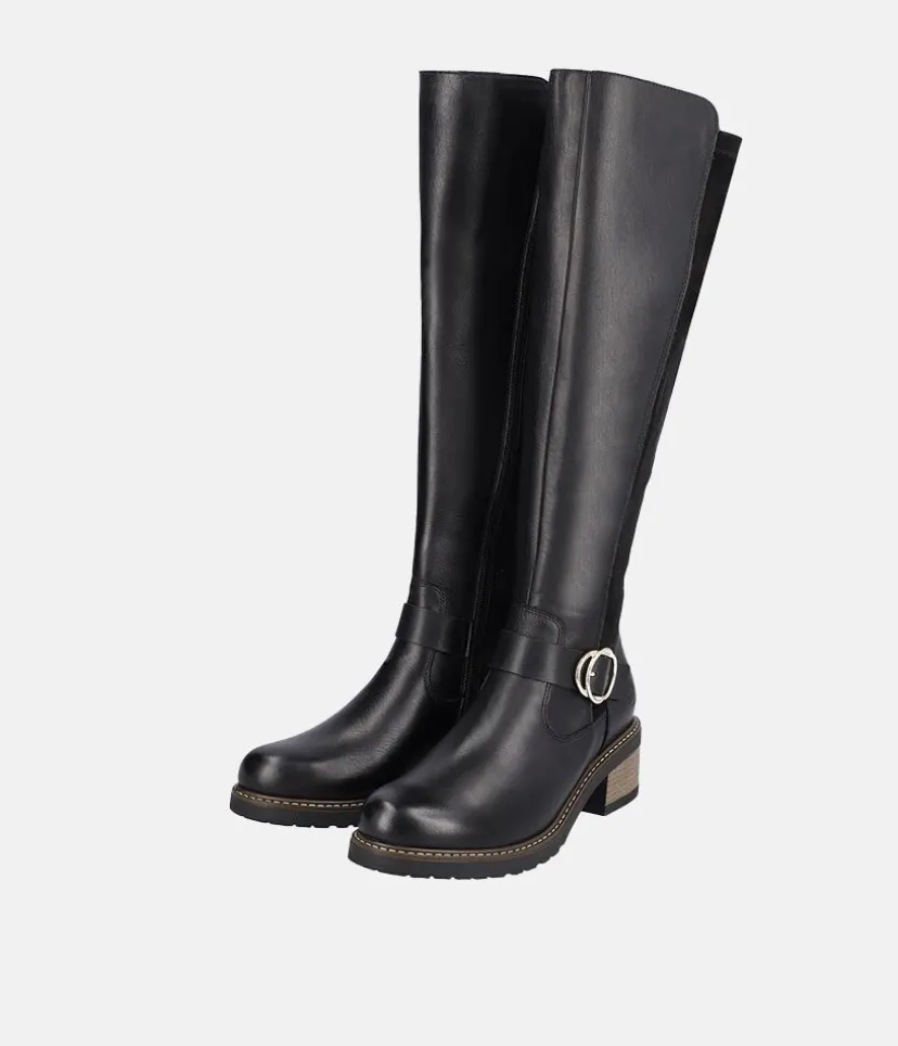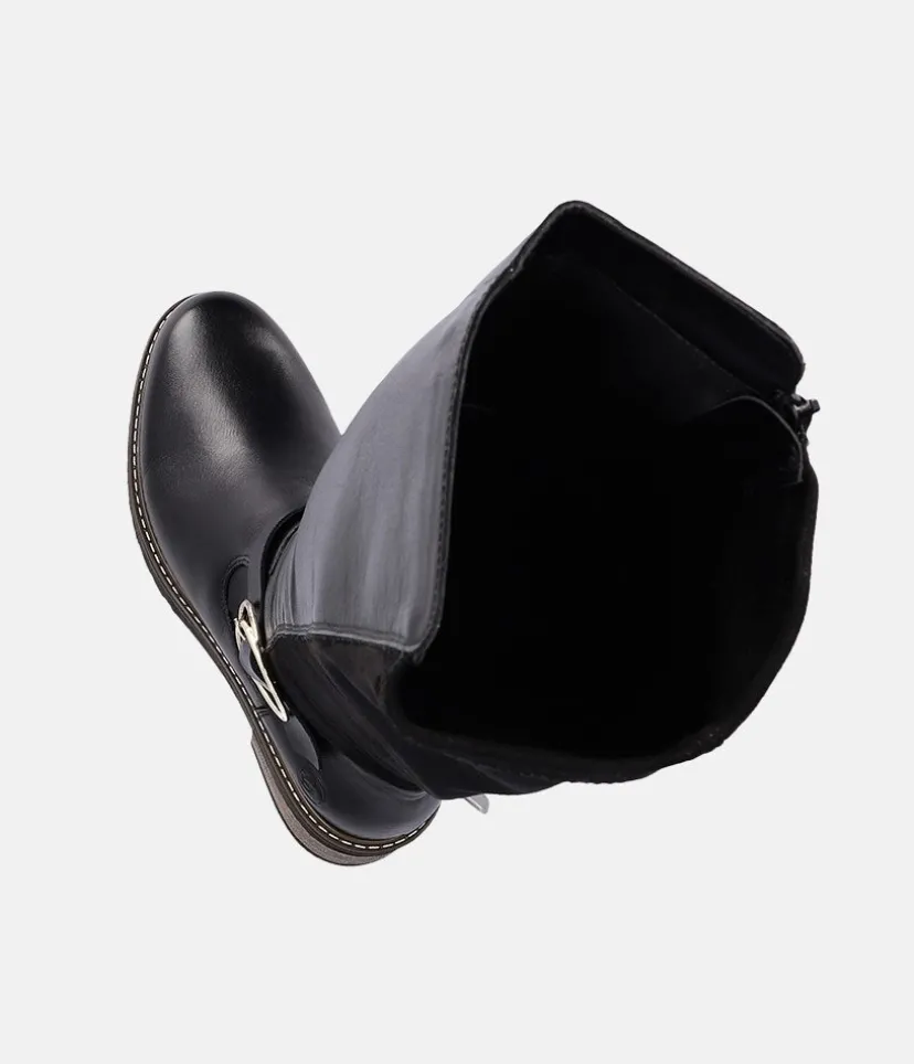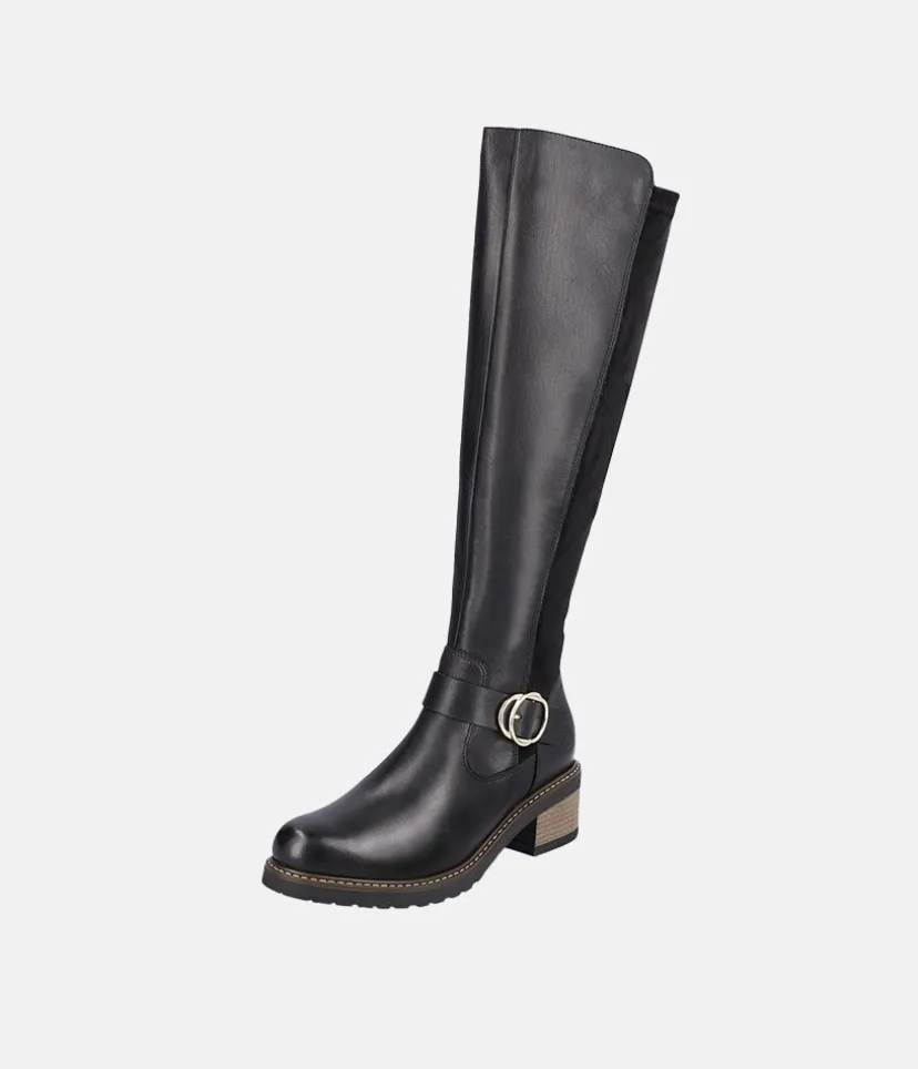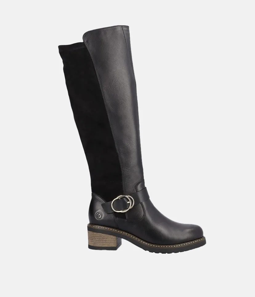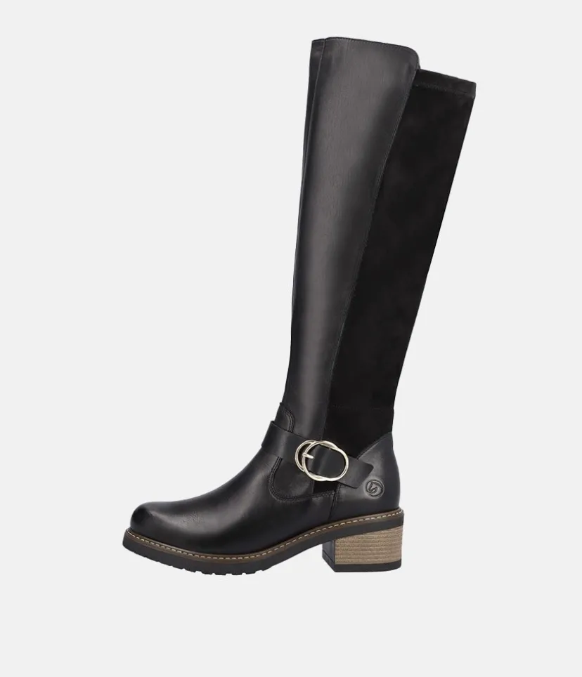 This is a Beautiful tall Leather and Suede Boot from Remonte with a full-length side zipper. Featuring plush suede on the upper in combination with a decorative buckle to finish the look. In addition, a flat block heel and a textile lining lends softness and warmth and the removable cushioned footbed absorbs shock and stress.