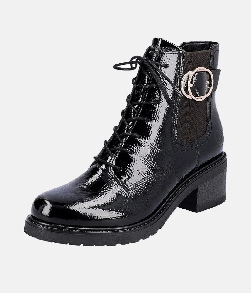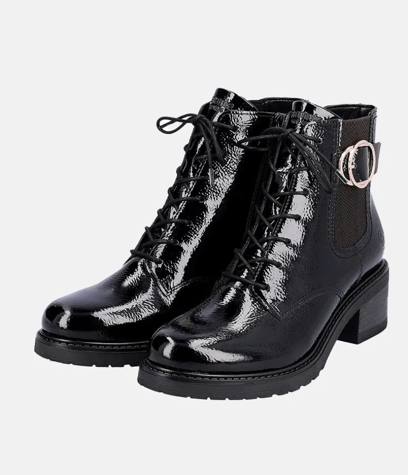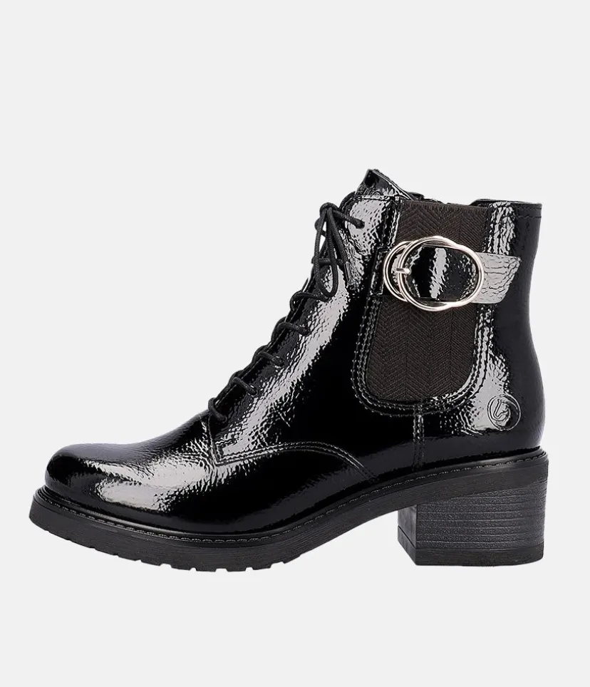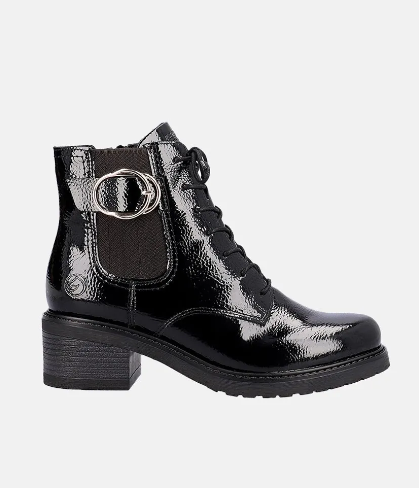 This New black patent lace up ankle boot from Remonte with it’s shiny finish will take you from desk to dinner. Featuring a block heel and a side buckle detail for added interest.