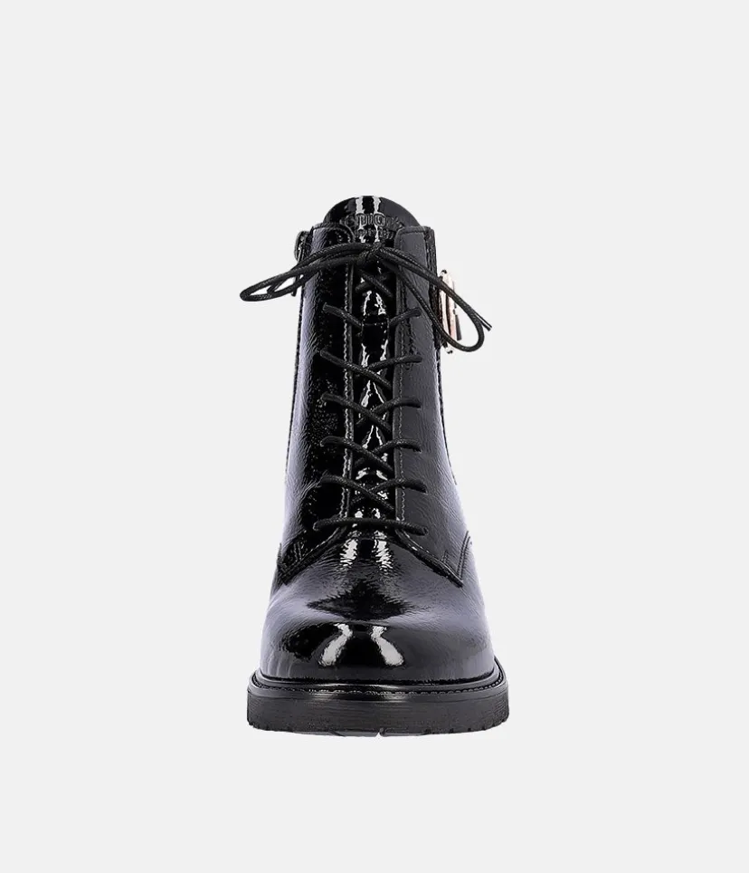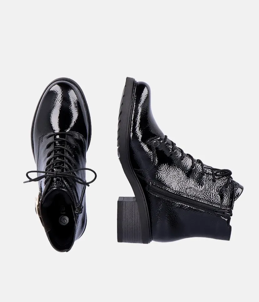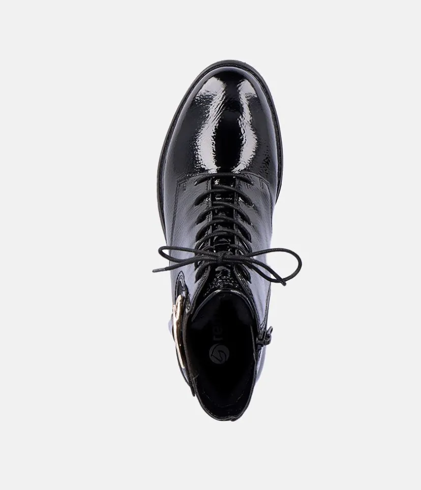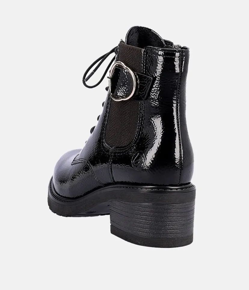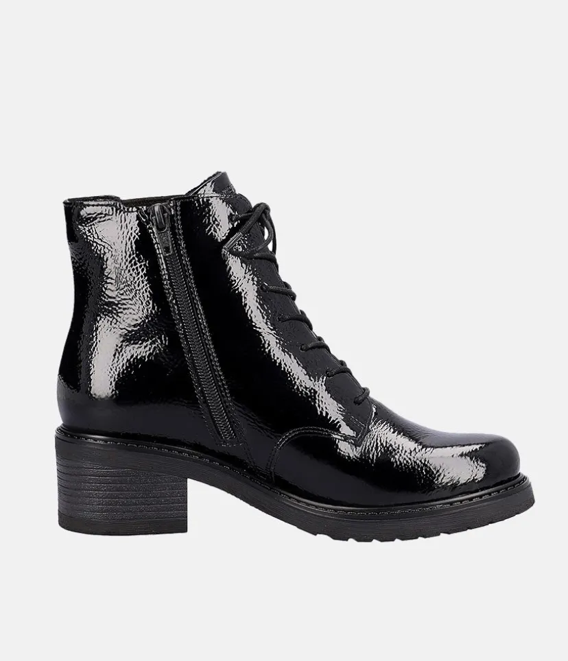 This New black patent lace up ankle boot from Remonte with it’s shiny finish will take you from desk to dinner. Featuring a block heel and a side buckle detail for added interest.