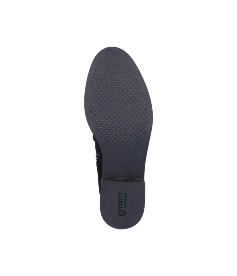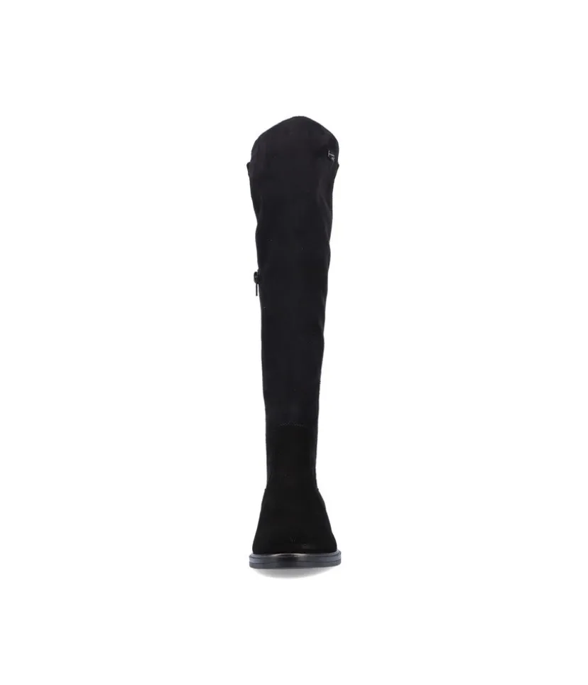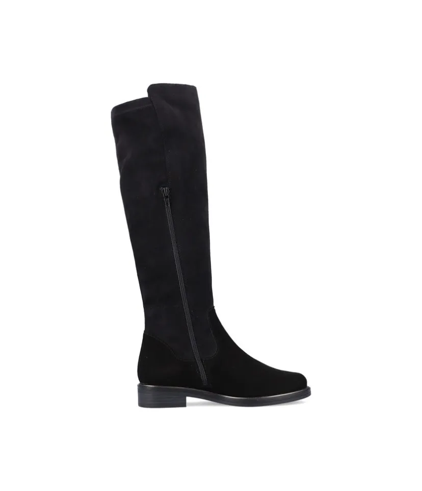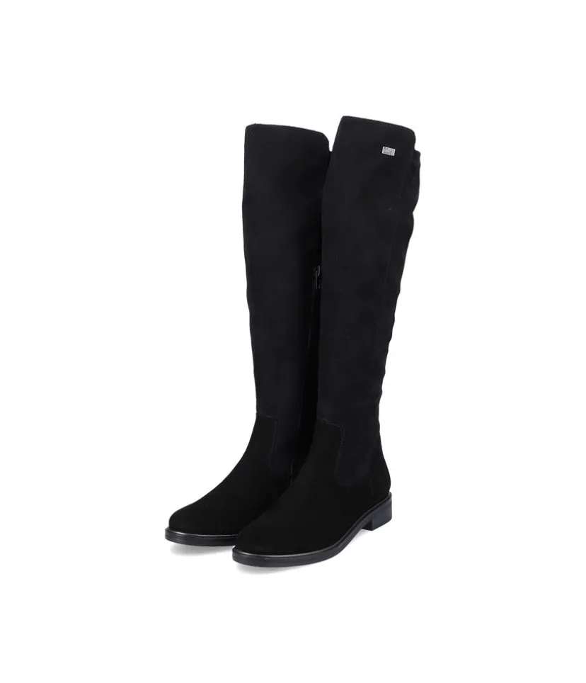 A Super stylish Long boot from Remonte, featuring a mix of black suede and synthetic leather uppers. Lined with a super soft velvet, complete with a cushioned removable insole RemonteTex water repellent membrane.