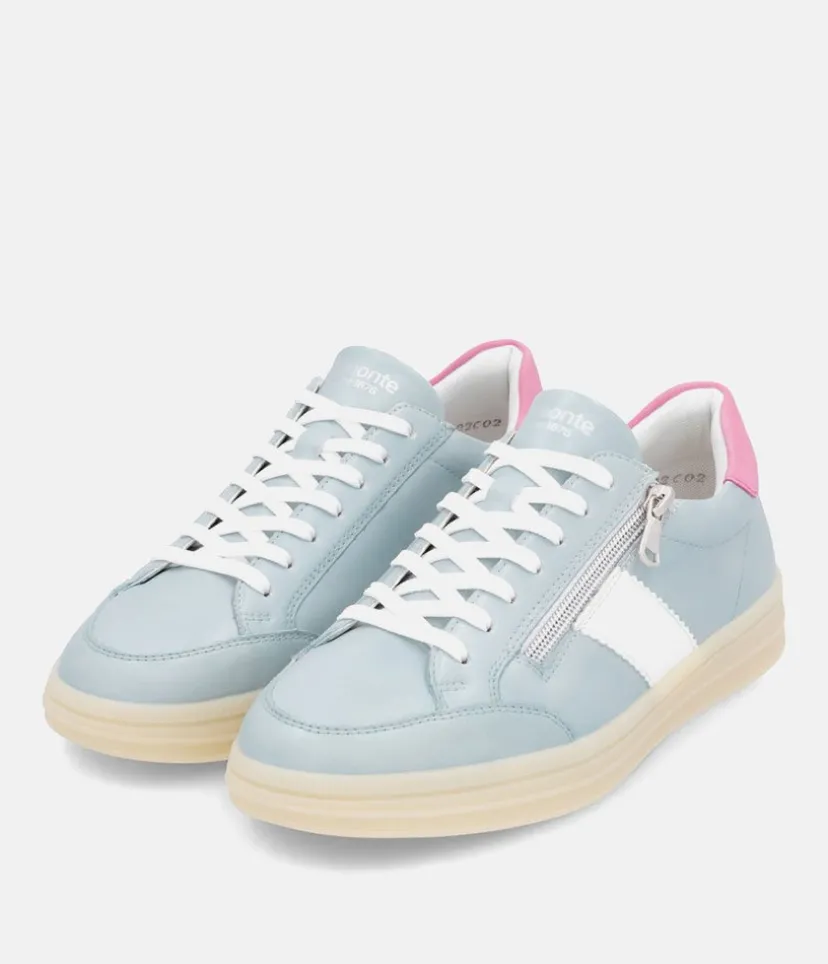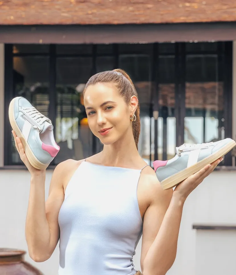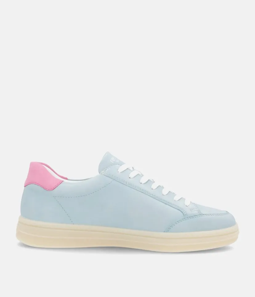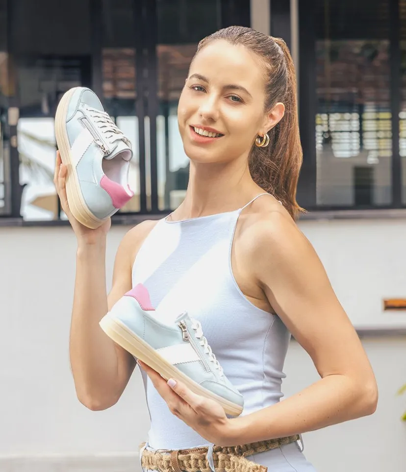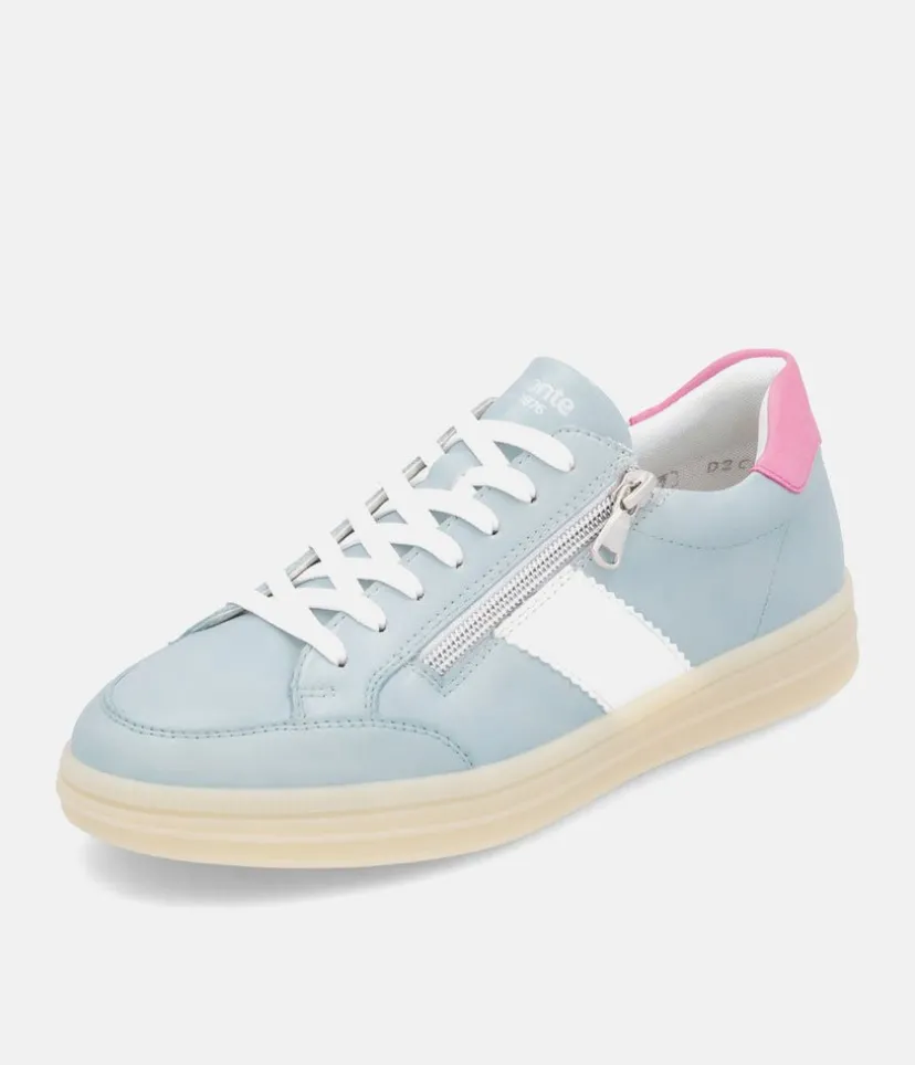 Introducing this New Style from Remonte; made in a beautiful combination of Blue, Pink cuff and White panel and laces. Crafted with a leather upper and textile lining, these trainers offer exceptional comfort and style. A cushioned and removable soft insole provides optimal comfort and moulds to the contours of your foot. The laces allow for an adjustable fit and the side zip makes it easy to slip on and off. This lightweight and stylish sneaker goes effortlessly with jeans and trousers for a versatile and fashionable look.