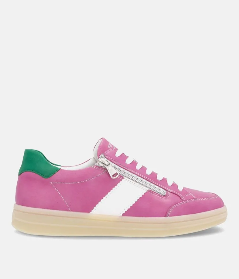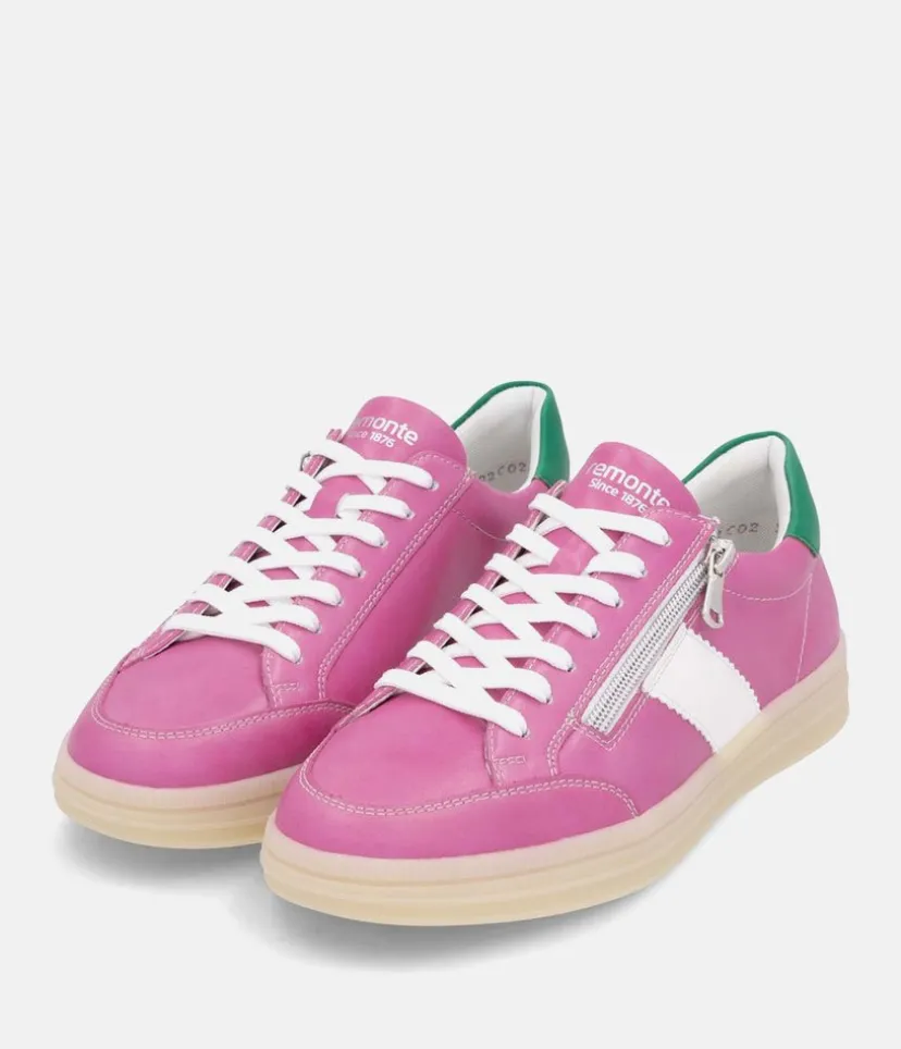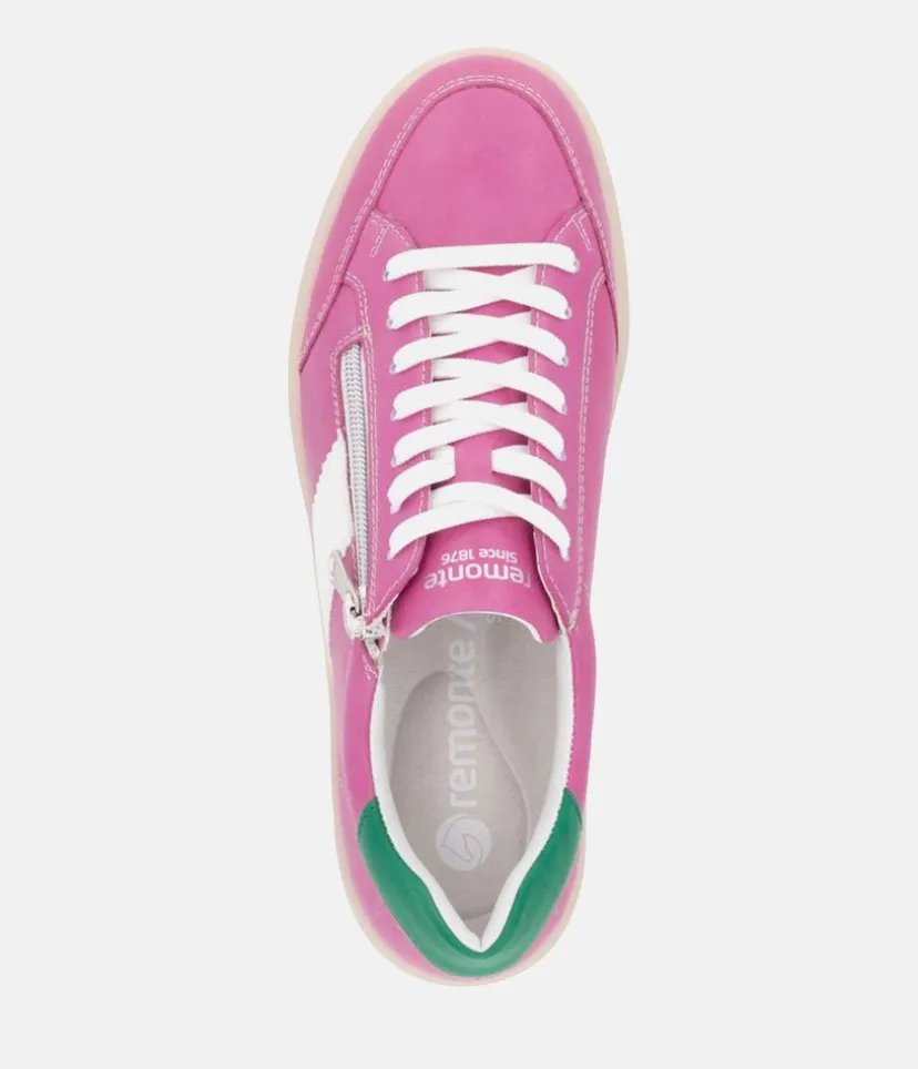 Introducing this New signature style from Liz Hurley; made in a beautiful combination of Pink, Green cuff and White panel and laces. Crafted with a leather upper and textile lining, these trainers offer exceptional comfort and style. A cushioned and removable soft insole provides optimal comfort and moulds to the contours of your foot. The laces allow for an adjustable fit and the side zip makes it easy to slip on and off. Whether you’re dressing up your favourite jeans or adding a pop of colour to a casual outfit, these shoes are sure to elevate your look effortlessly. Step out in style with this chic and versatile footwear!