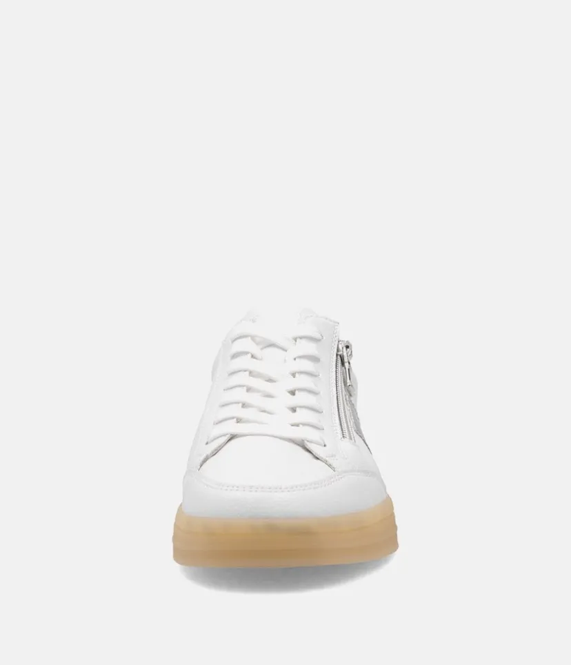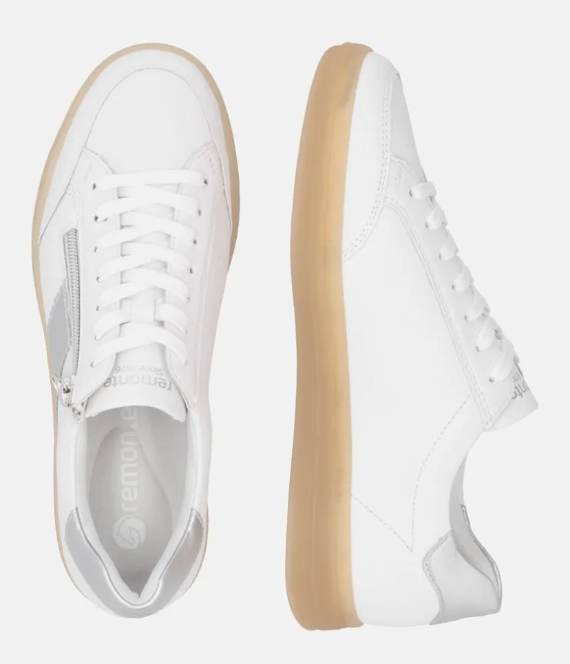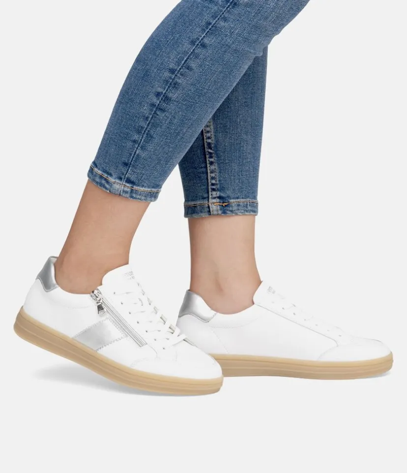 Introducing this New signature style from Liz Hurley; made in a striking combination of White with Silver. Crafted with a leather upper and textile lining, these trainers offer exceptional comfort and style. A cushioned and removable soft insole provides optimal comfort and moulds to the contours of your foot. The laces allow for an adjustable fit and the side zip makes it easy to slip on and off. Whether you’re dressing up your favourite jeans or adding a pop of colour to a casual outfit, these shoes are sure to elevate your look effortlessly. Step out in style with this chic and versatile footwear!