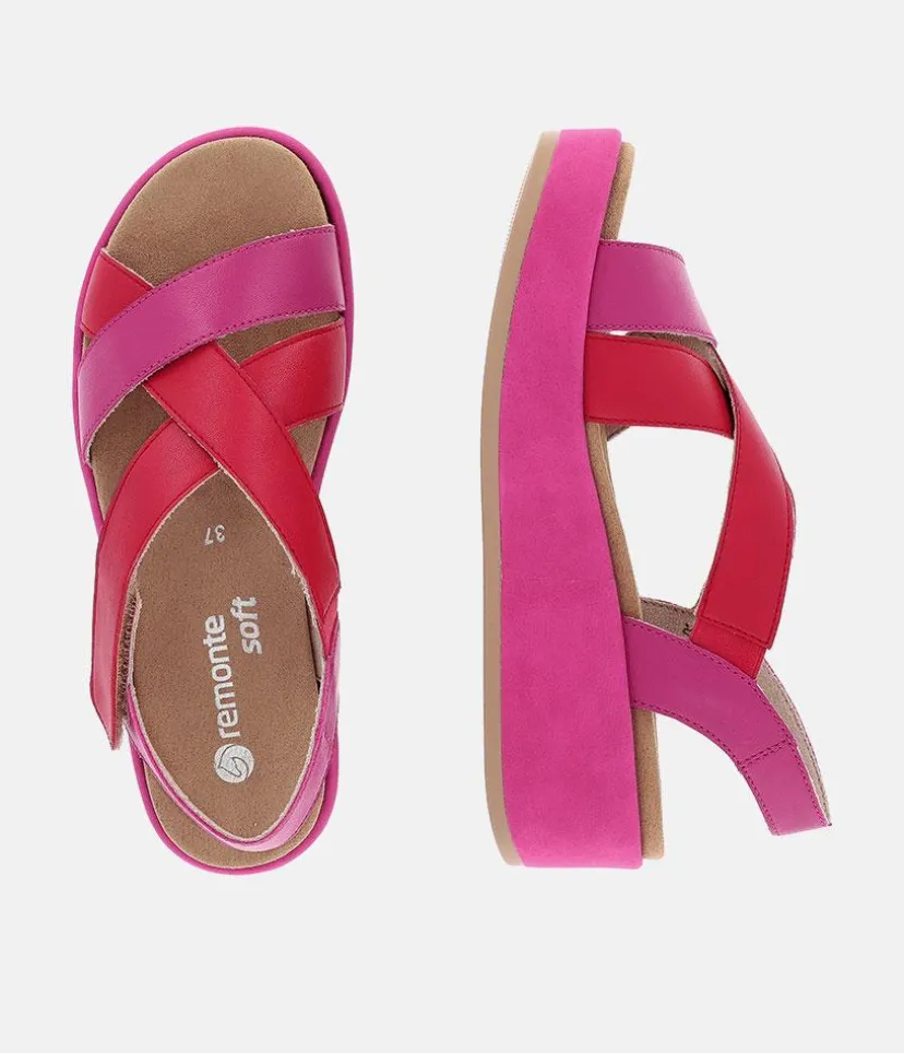 This is a Trendy new style from Remonte featuring a Red and Pink Leather upper and is designed with an ultra-light outsole and extra-soft removable footbed for maximum comfort. The individually adjustable velcro fastener and helps to provide a customized fit. Ideal to pack for a vacation to pair with just about any outfit from shorts to long dresses and Jeans.
