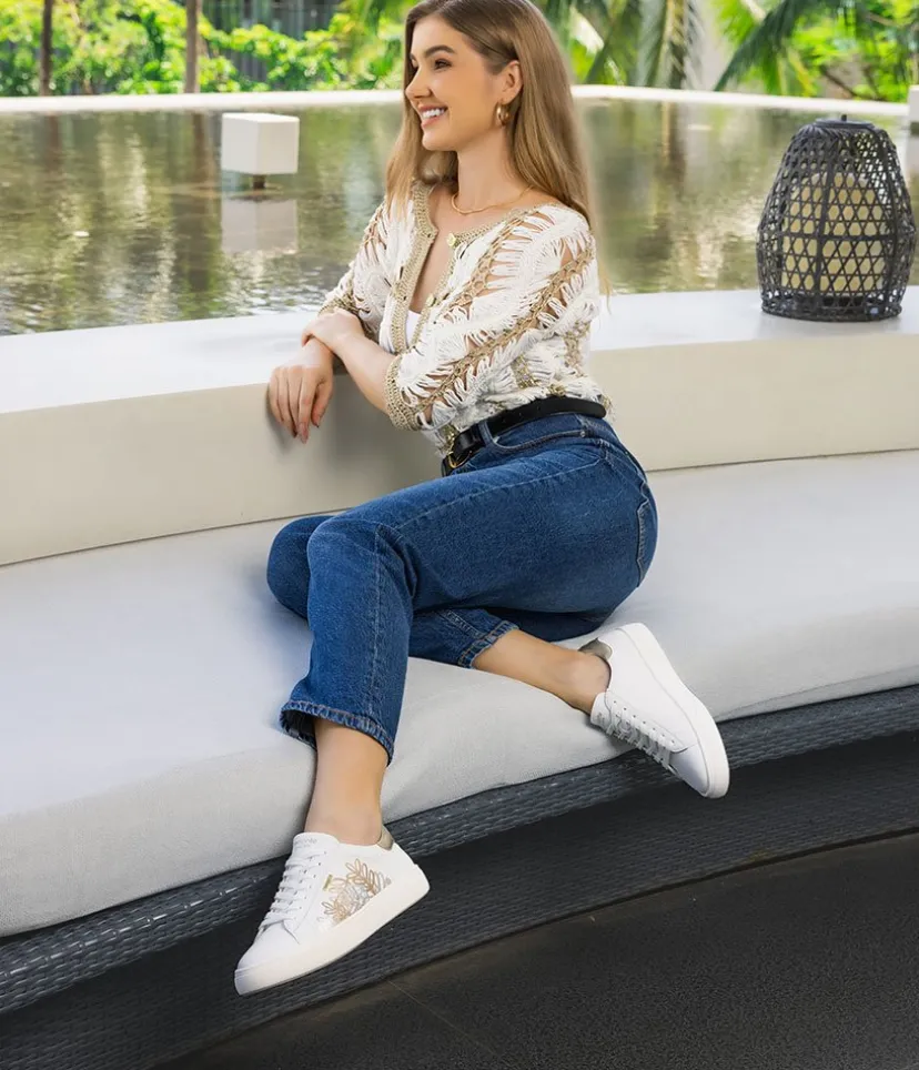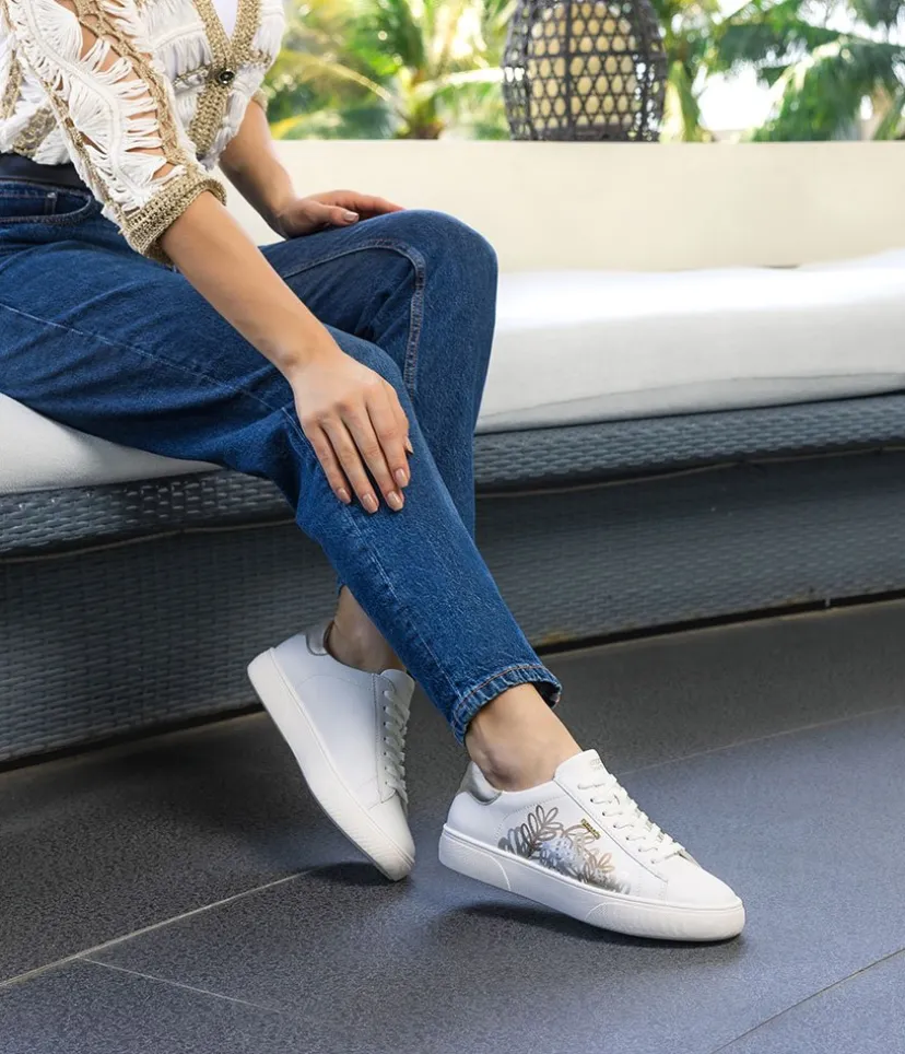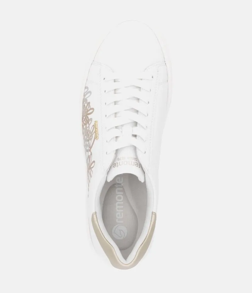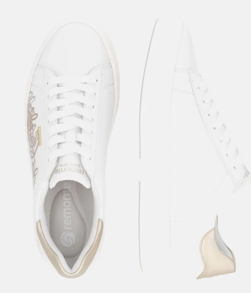 Introducing this Stunning New White Leather Trainer from Remonte with its gorgeous Gold and Silver Metallic finish on the upper. With cushioned and removable Remonte Lite ‘n Soft insole that provides optimal comfort and adapts to the contours of your foot., it’s perfect for everyday wear. Enjoy superior comfort and style with this must-have shoe for your new season wardrobe.
