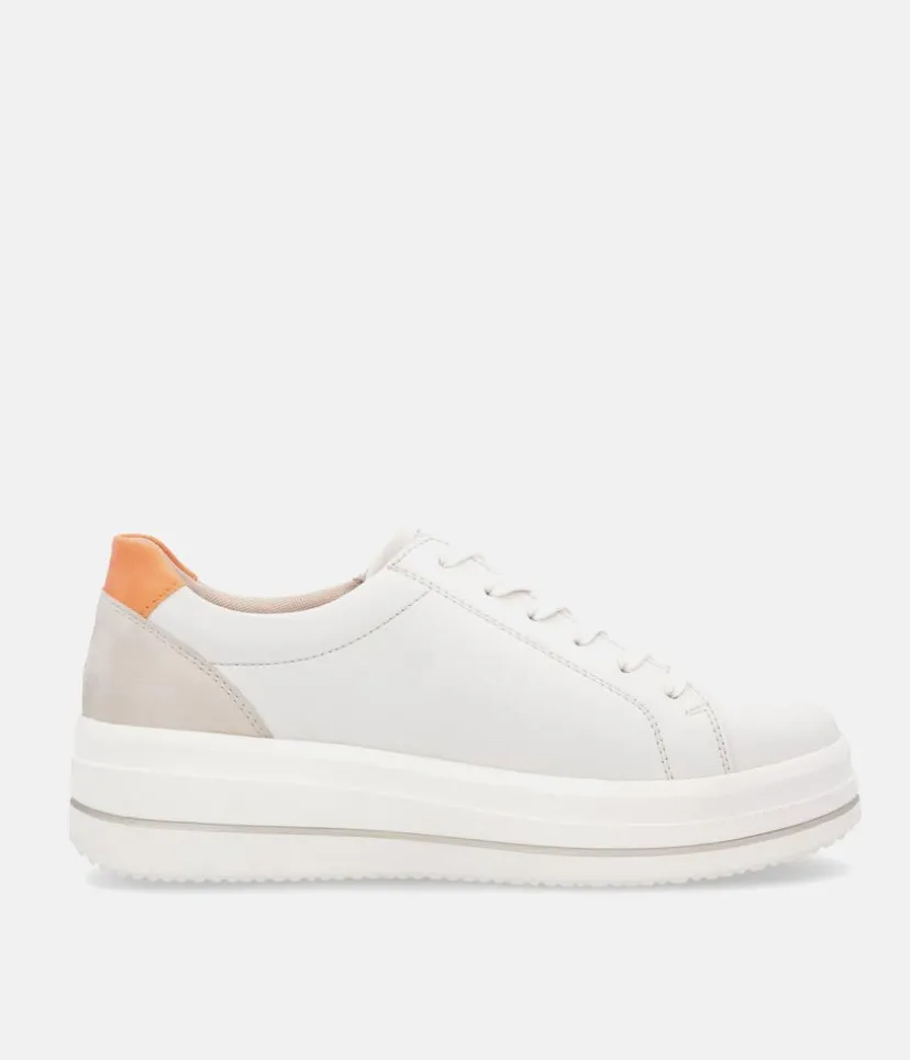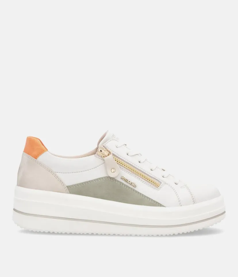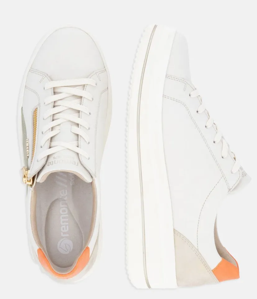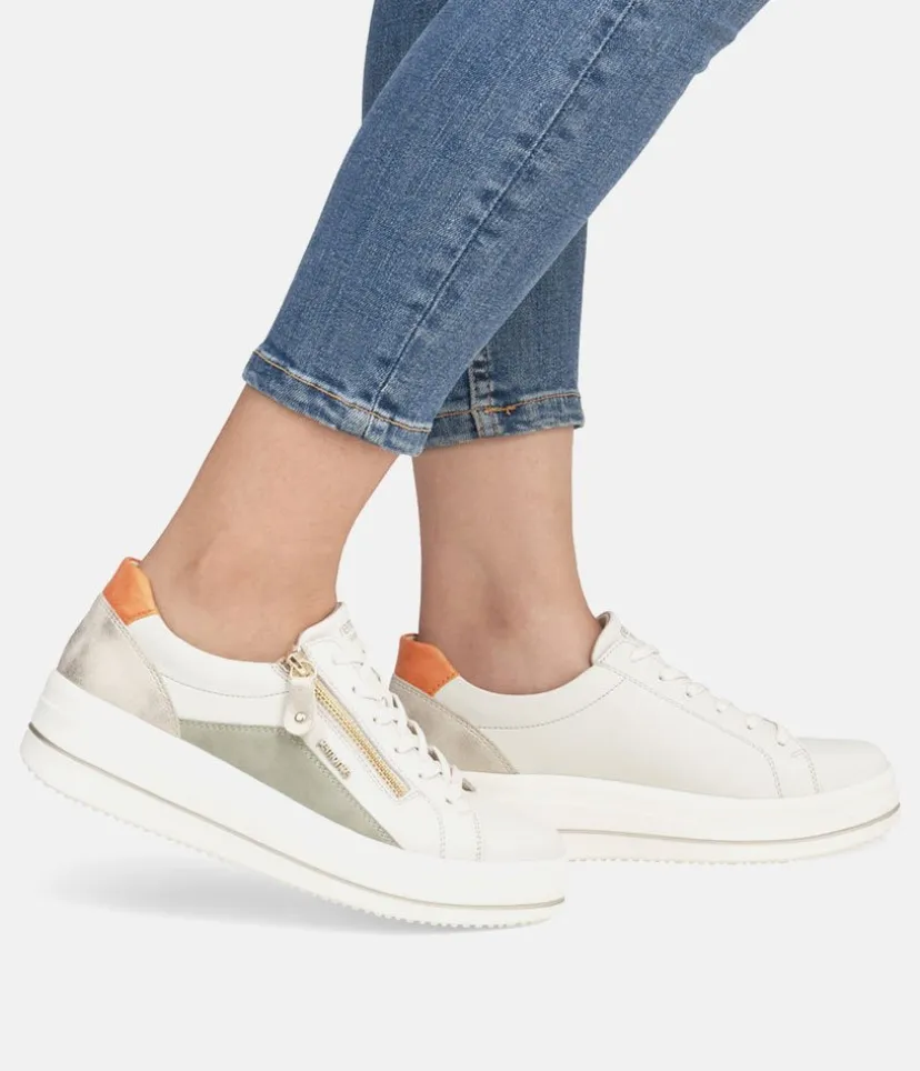 Elevate your style with these Remonte White Sneakerswith contrasting colour trim on the upper in Orange, Gold, and Beige; made of durable leather and synthetic materials for durability and longevity. The cushioned and removable soft insole provides optimal comfort and moulds to the contours of your foot. The laces allow for an adjustable fit and the side zip makes it easy to slip on and off. This lightweight and stylish sneaker goes effortlessly with jeans and trousers for a versatile and fashionable look.