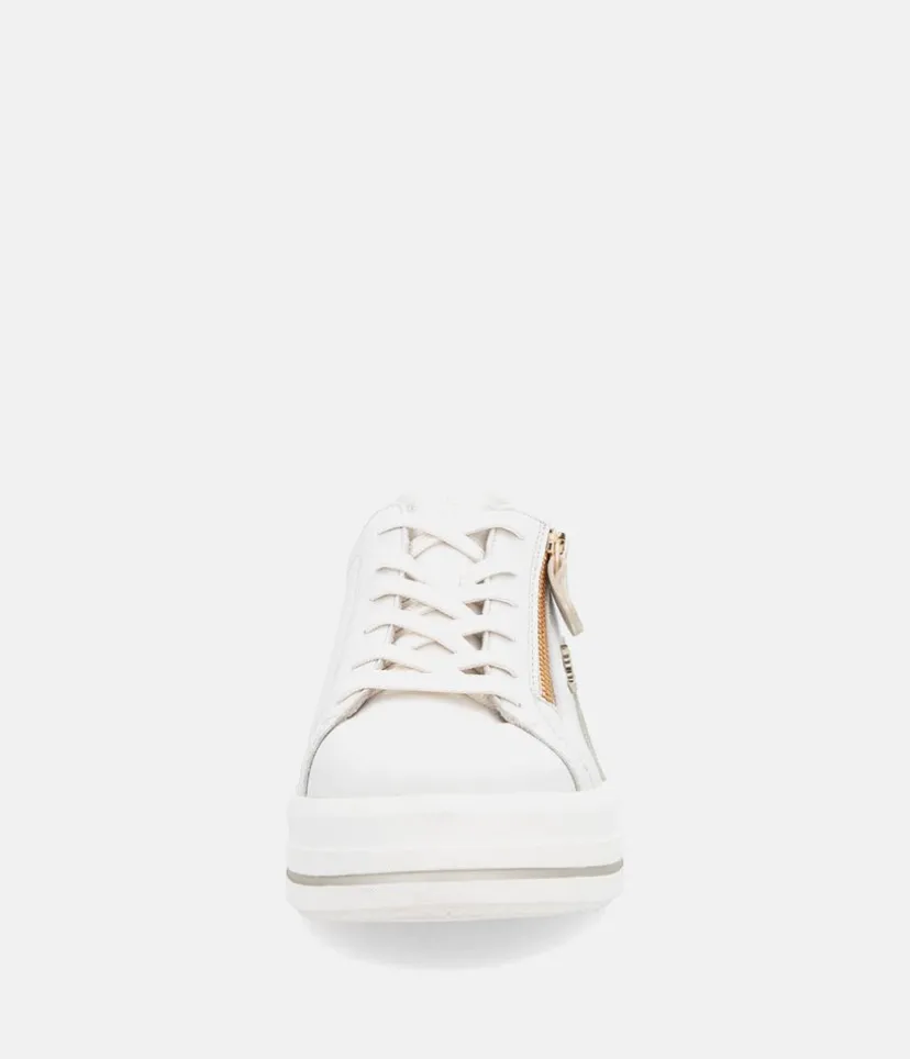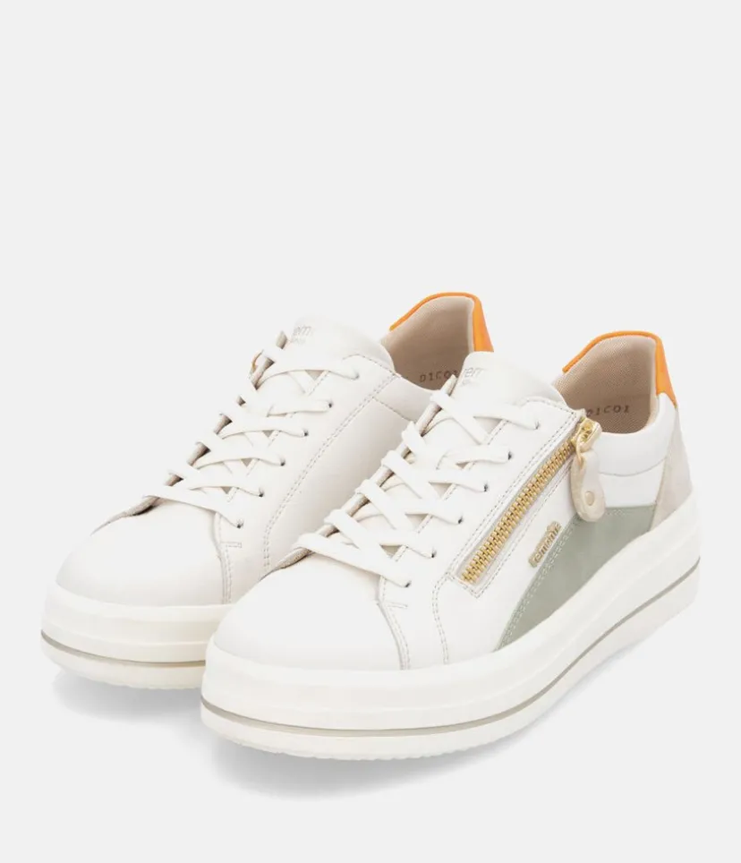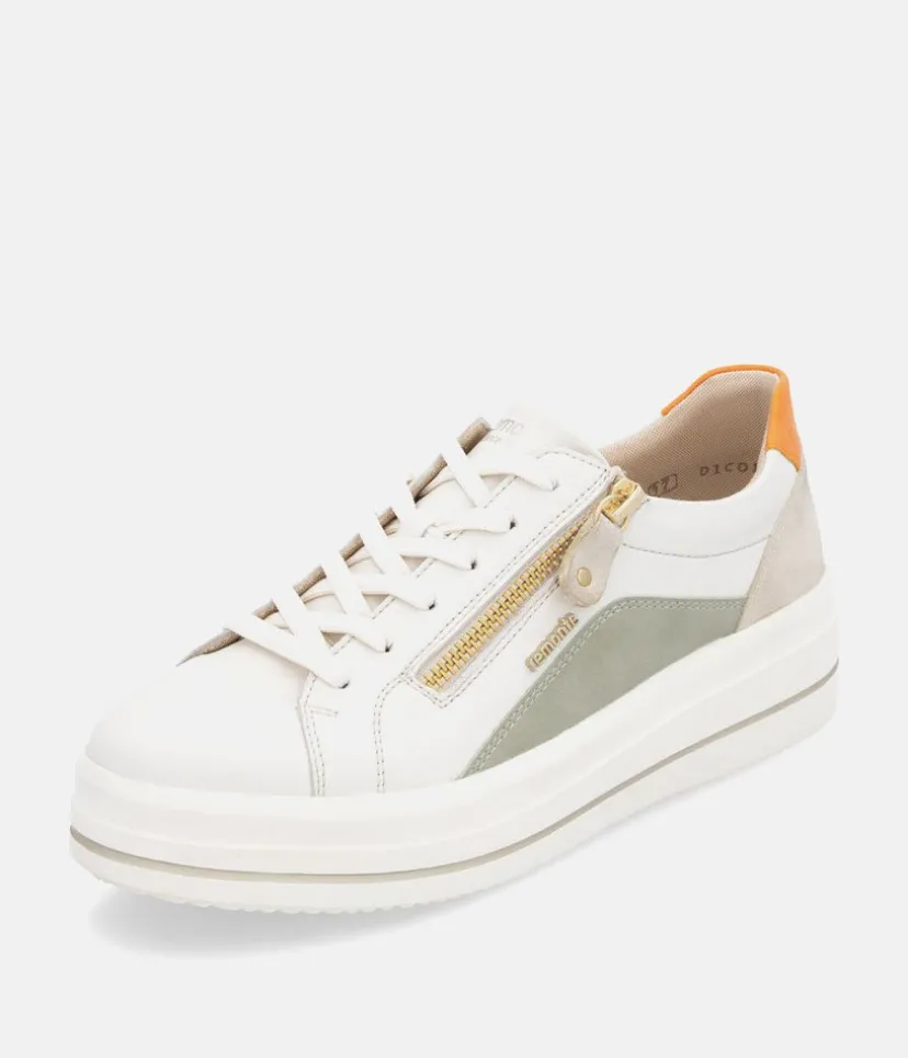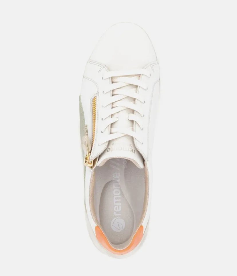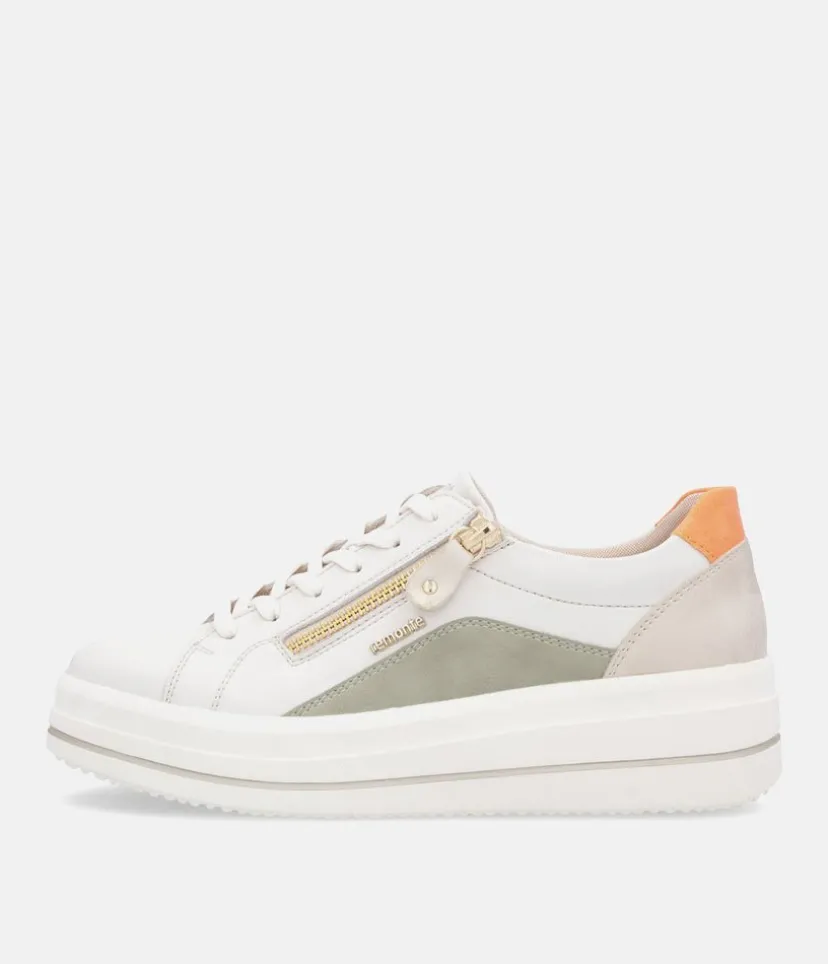 Elevate your style with these Remonte White Sneakerswith contrasting colour trim on the upper in Orange, Gold, and Beige; made of durable leather and synthetic materials for durability and longevity. The cushioned and removable soft insole provides optimal comfort and moulds to the contours of your foot. The laces allow for an adjustable fit and the side zip makes it easy to slip on and off. This lightweight and stylish sneaker goes effortlessly with jeans and trousers for a versatile and fashionable look.