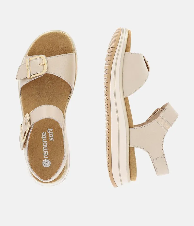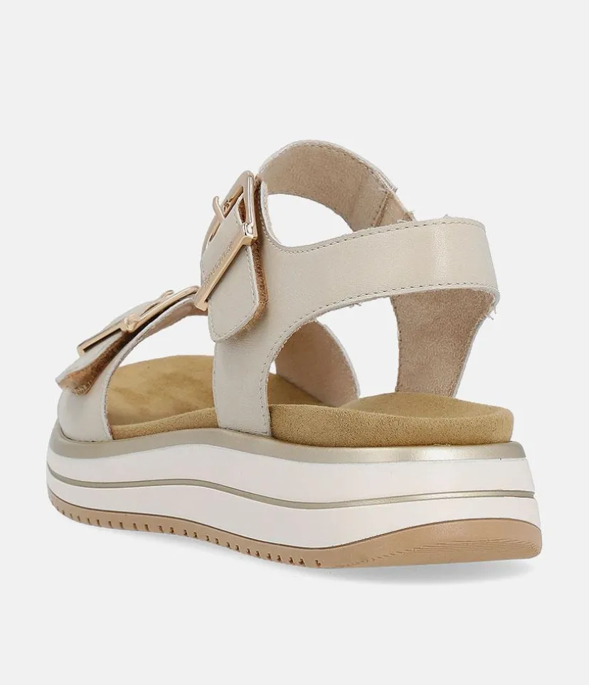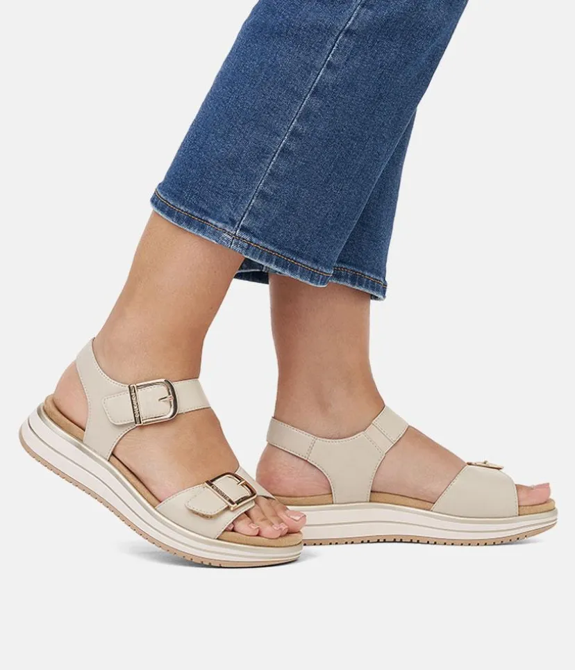 This is a super comfortable wedge sandal from Remonte which comes in a classic off white leather with contrasting gold buckles and metallic trim . The Velcro straps offer a secure and adjustable fit and these sandals a versatile style choice and will be great for those leisurely Summer Strolls,