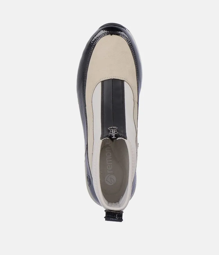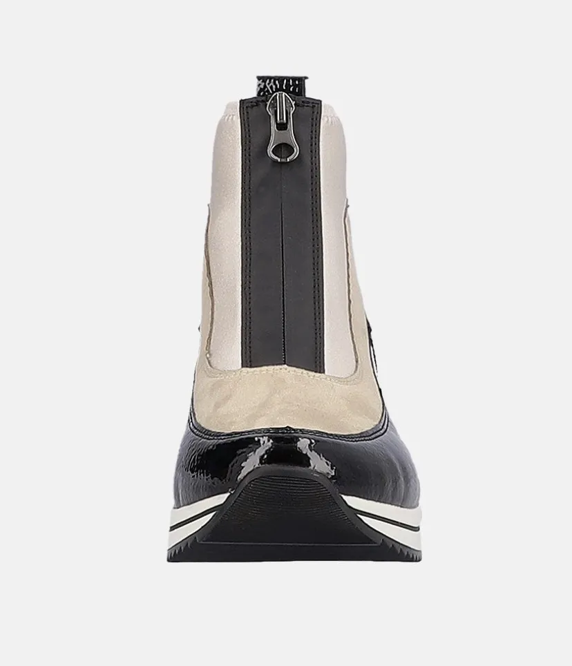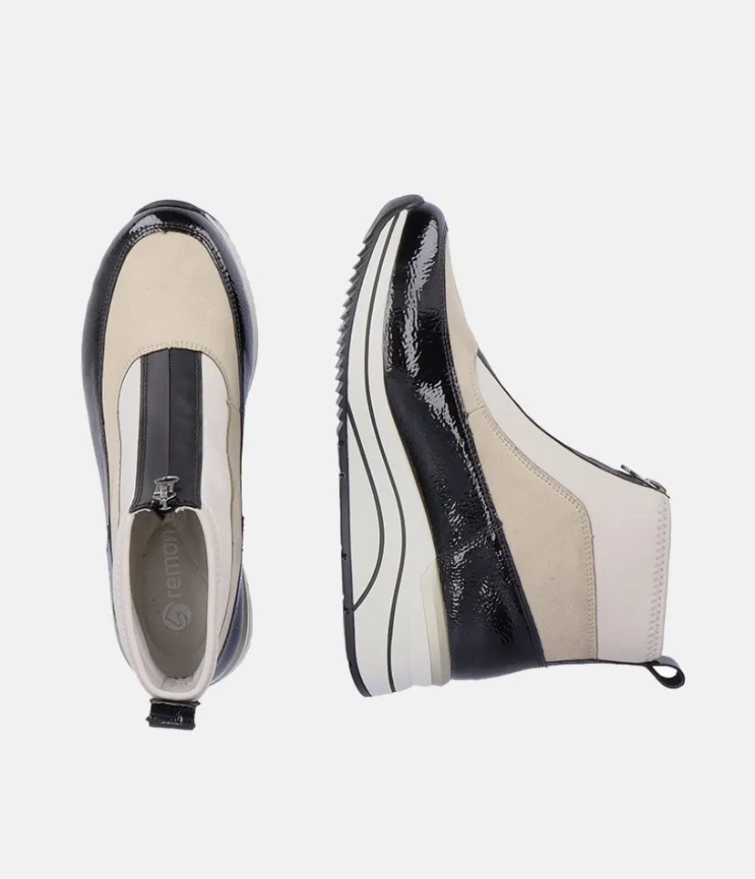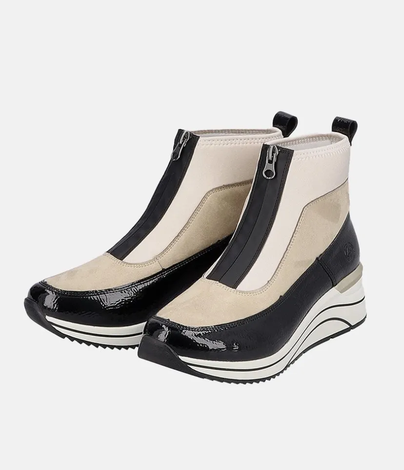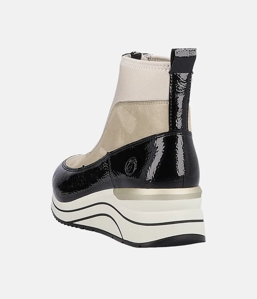 A Super comfortable and stylish ankle boot rocking that sock boot vibe with the feel of a trainer from Remonte. Featuring a combination upper in mix of patent, suedette and a scuba like textile to the vamp and collar. The scuba textile collar has an elasticated fit which hugs the skin like a sock and is fastened by a zip down the middle. Finished with a wedge heel for added height without losing on comfort. Complete with a soft lining with a cushioned Remonte Soft removable insole.