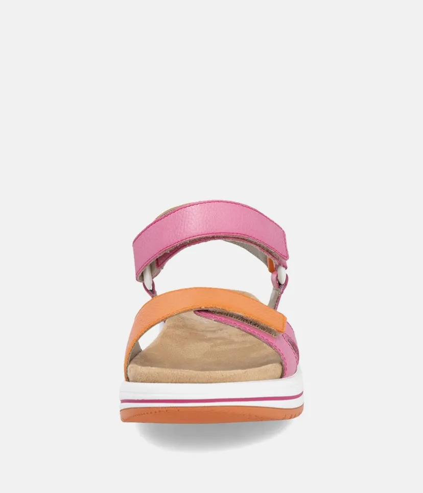 This is a Colourful new style from Remonte featuring Velcro straps in Pink and Orange and a contrasting white outsole. Featuring a shock absorbing insole which is light and flexible. They are not just stylish, but practical for everyday use.Ideal to pack for a vacation to pair with just about any outfit from shorts to long dresses and Jeans.
