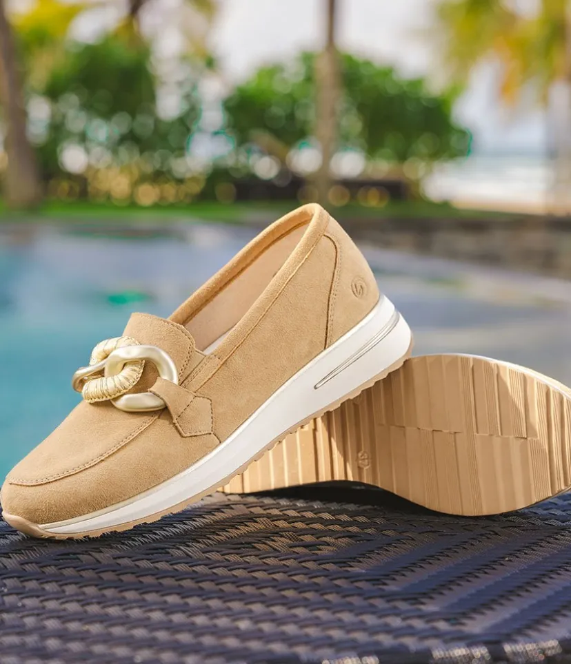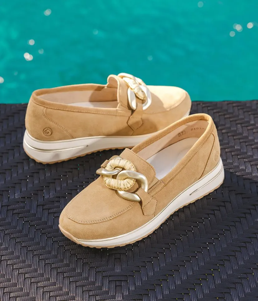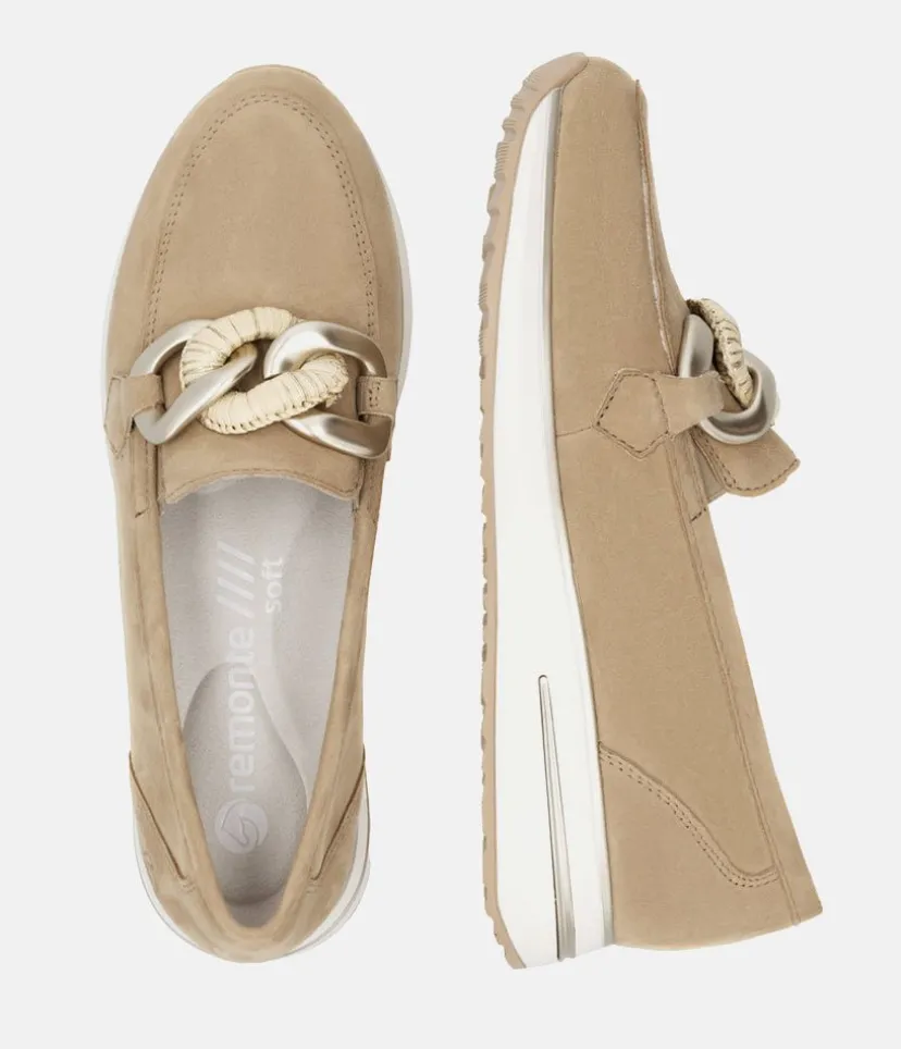 Elevate your style this season with this New Style from Remonte. These Beige Suede Loafers have a sporty design with a chain detail to finish them off perfectly. Crafted from leather, these loafers offer fabulous comfort with a removable insole and extra-soft footbed for a luxurious feel. The lightweight, slip-resistant sole provides stability.