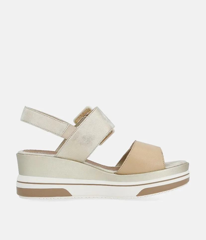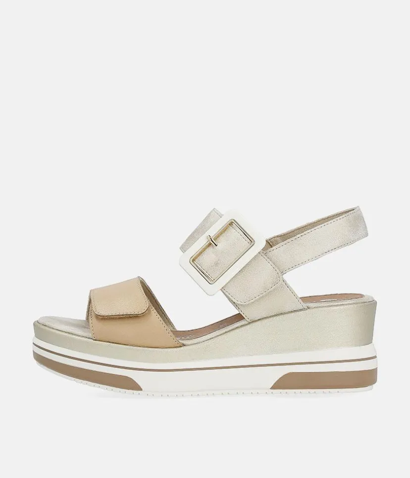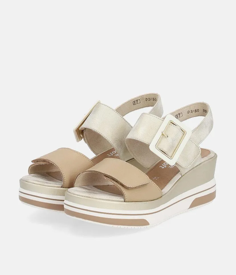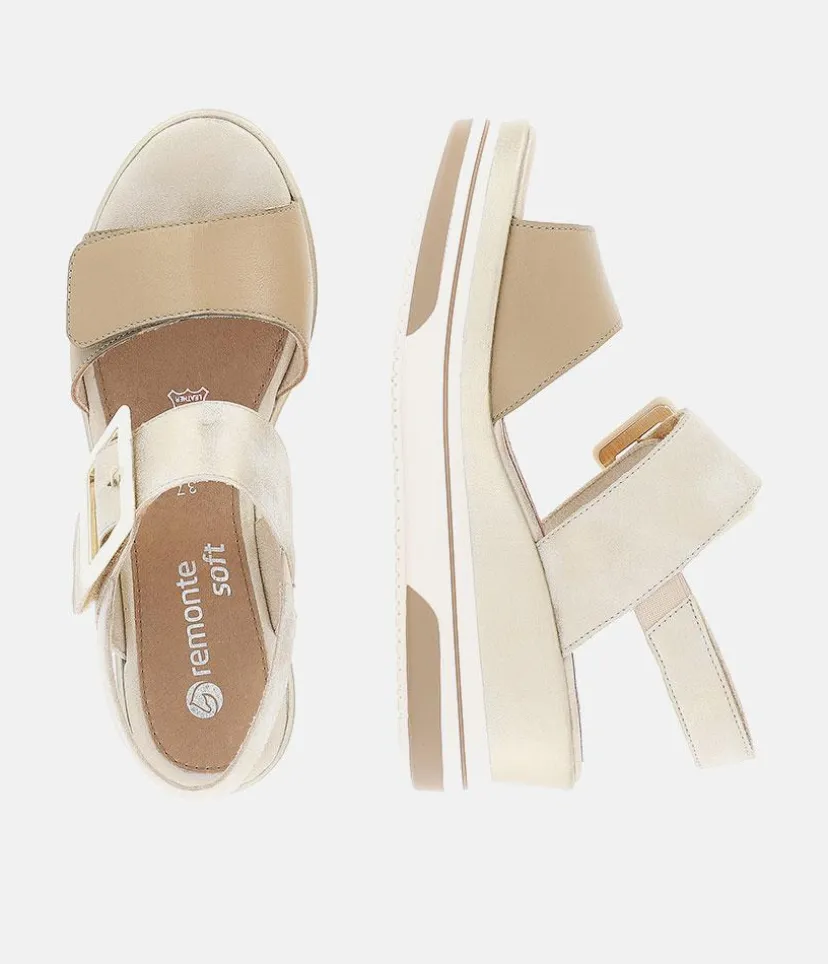 This is a Must have new style from Remonte; designed with a leather upper featuring two velcro straps over the foot, one of which showcasing an eye-catching rectangular resin buckle. This midwedge heel is adorned with a glamorous gold metallic midsole adding a touch of elegance to your look. The Remonte padded footbed offers maximum comfort for all-day wear. Perfect for summer holidays and warm weather, this stylish sandal is a must-have, pair it with your favourite summer dresses for the ultimate summer ensemble.