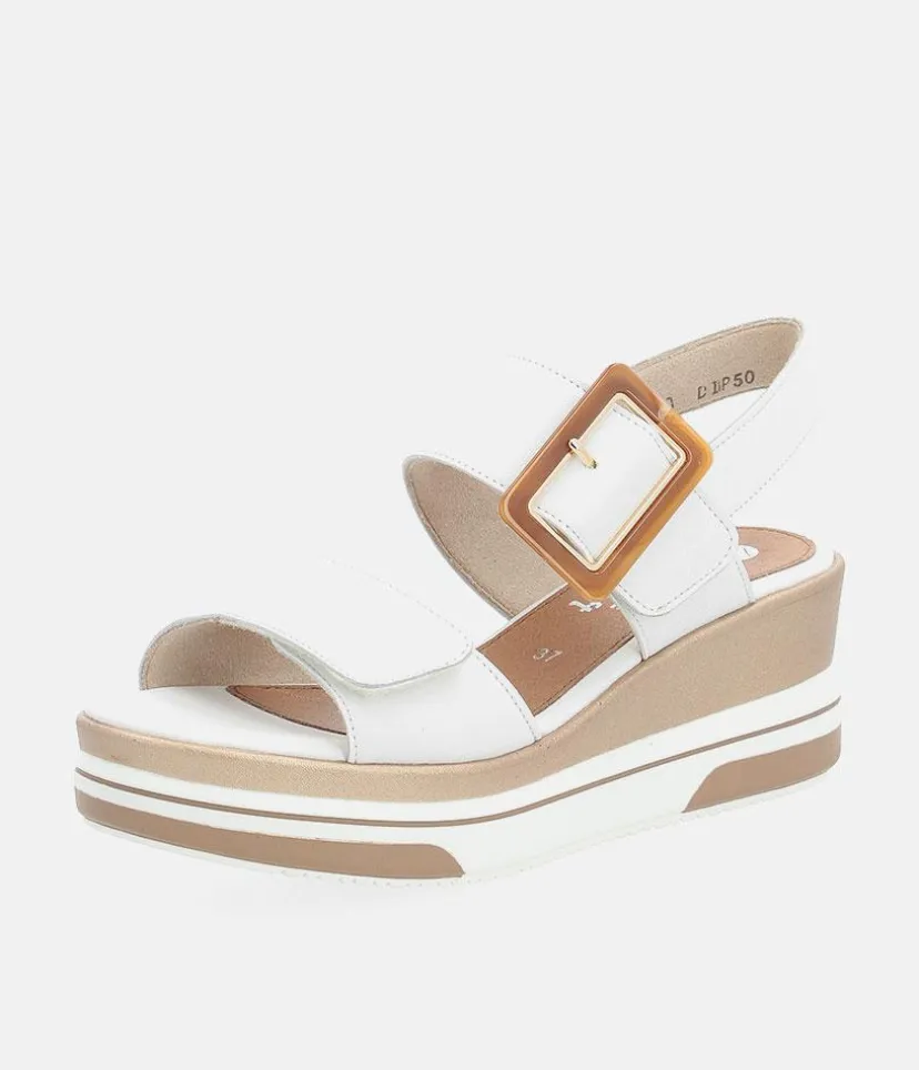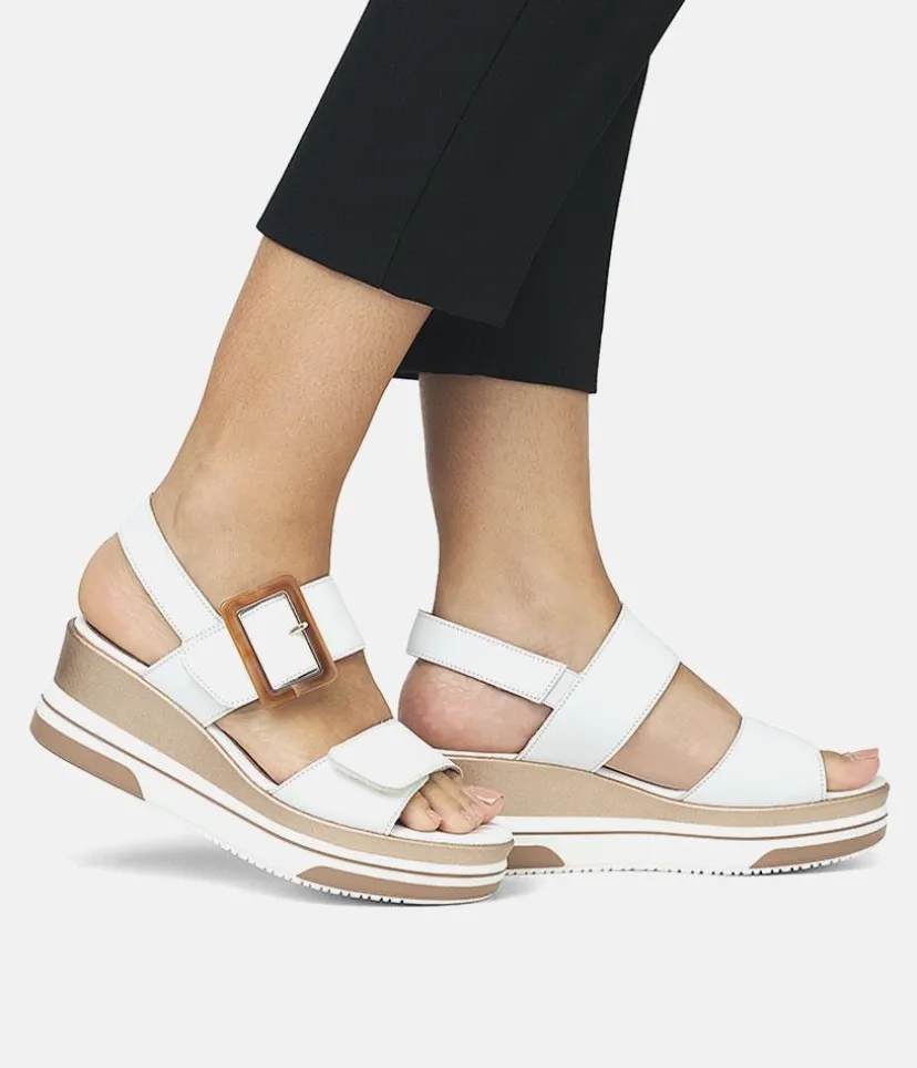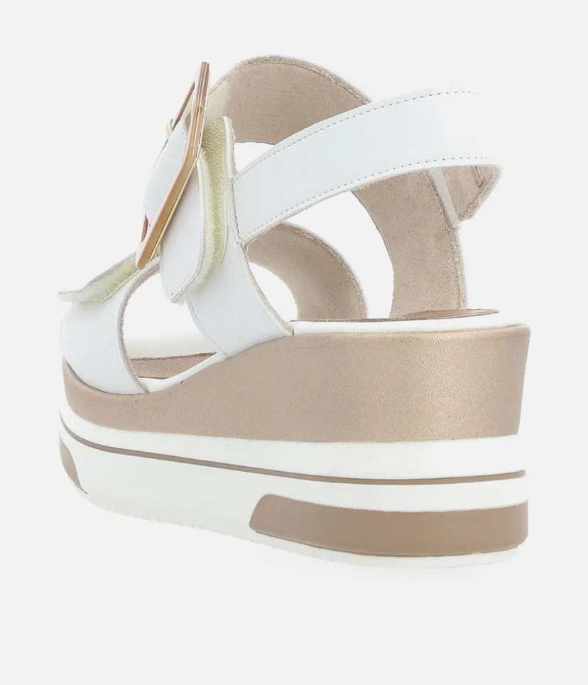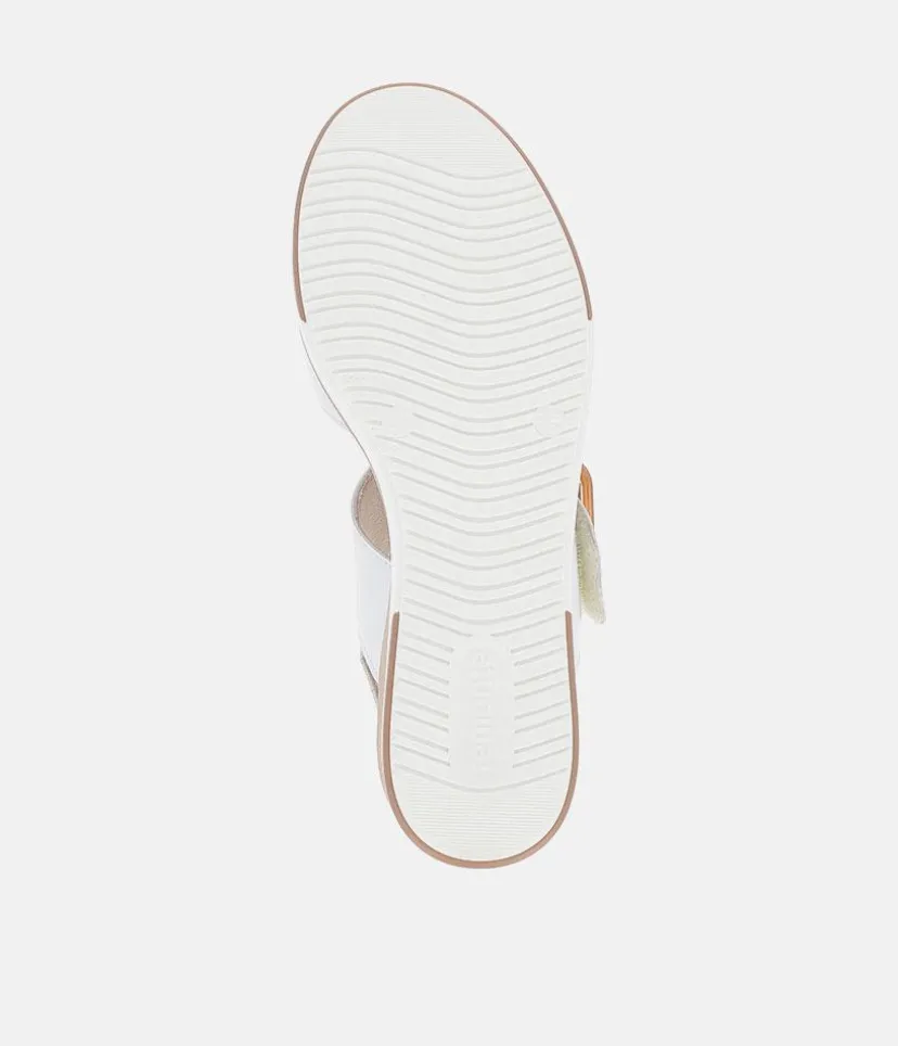 This is a Must have new style from Remonte; designed with a leather upper featuring two velcro straps over the foot, one of which showcasing an eye-catching rectangular resin buckle. This midwedge heel is adorned with a glamorous gold metallic midsole adding a touch of elegance to your look. The Remonte padded footbed offers maximum comfort for all-day wear. Perfect for summer holidays and warm weather, this stylish sandal is a must-have, pair it with your favourite summer dresses for the ultimate summer ensemble.