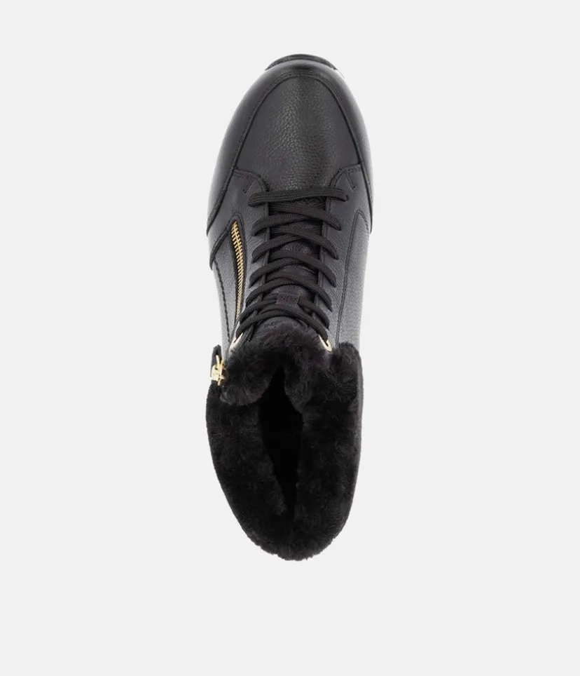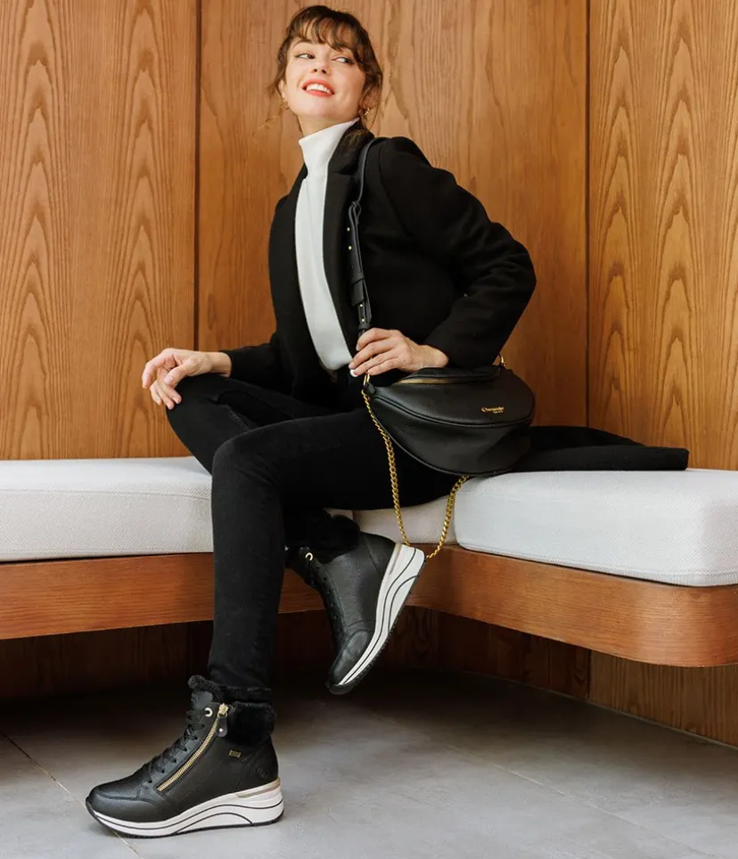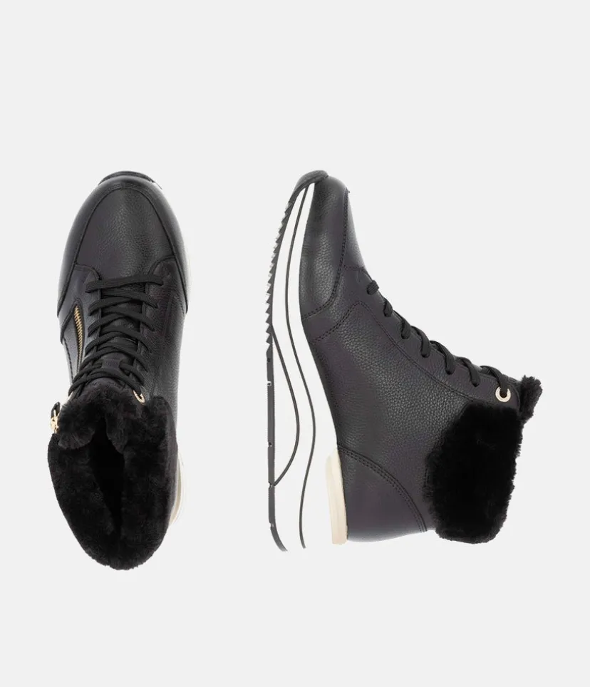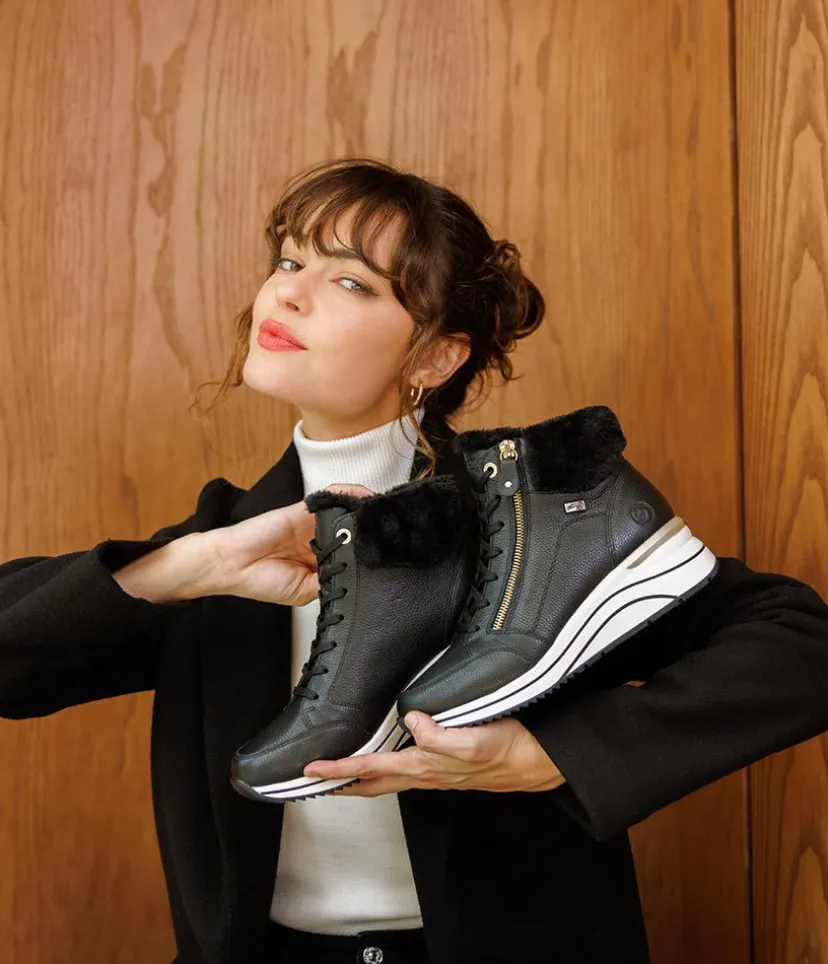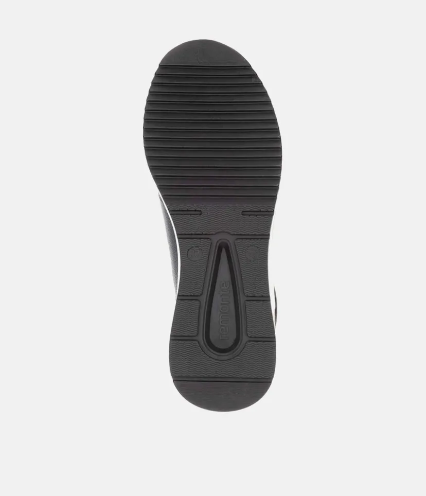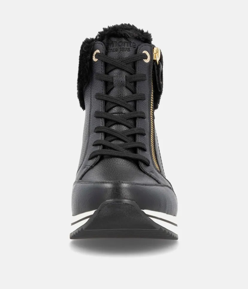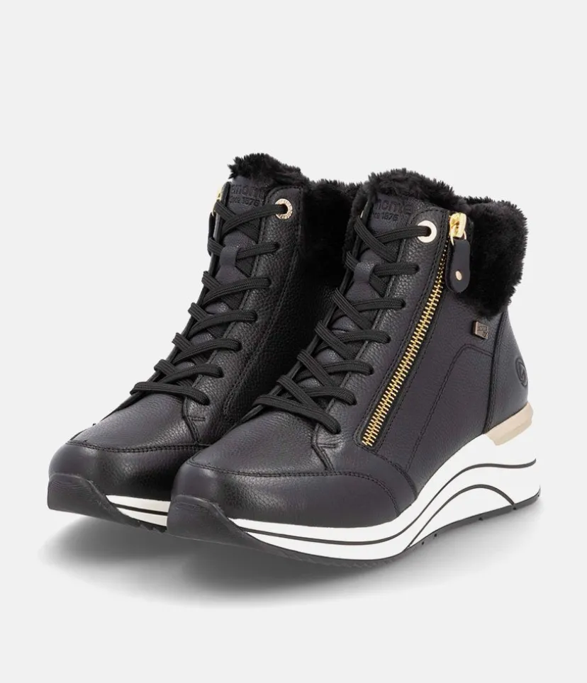 A Super comfortable and stylish sporty wedge ankle boot from Remonte. Featuring a leather upper with cpmtrasting white sole, gold zip and eyelets and cosy warm collar. and collar. The wedge heel adds some height without losing on comfort. Complete with a soft lining with a cushioned Remonte Soft removable insole.