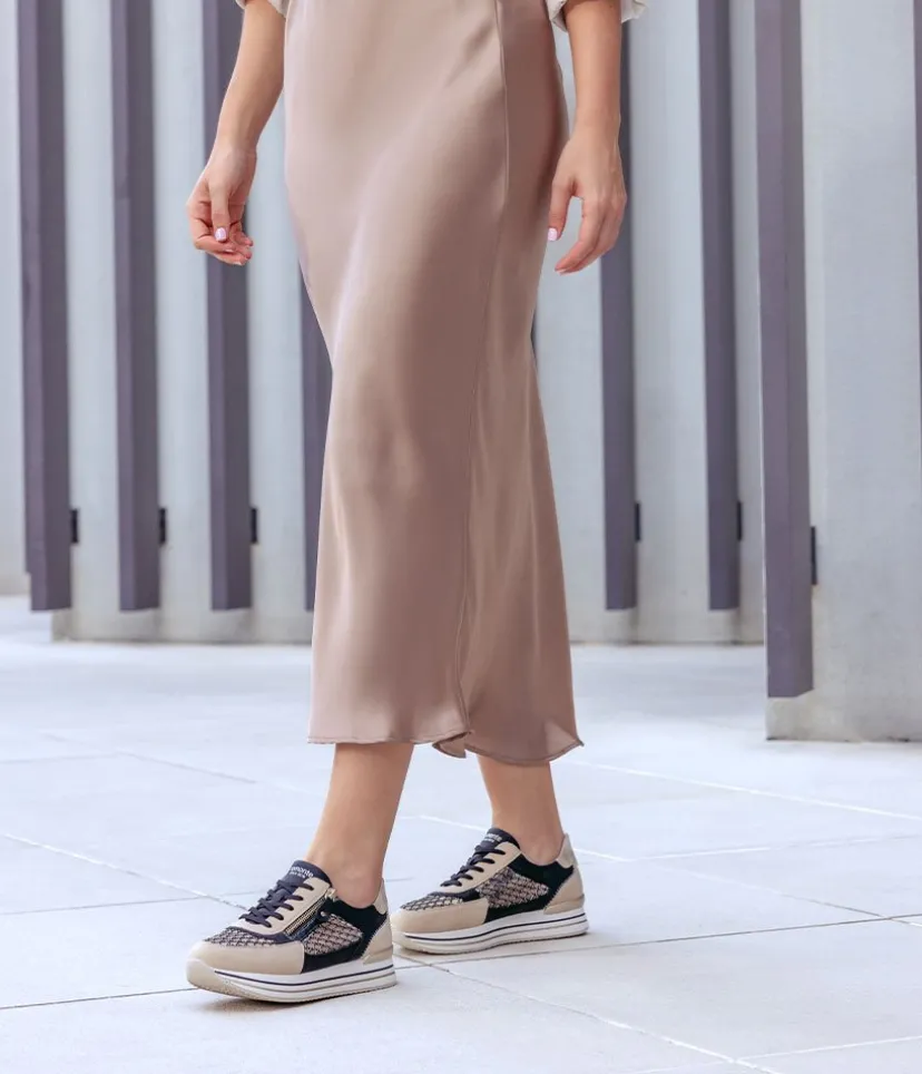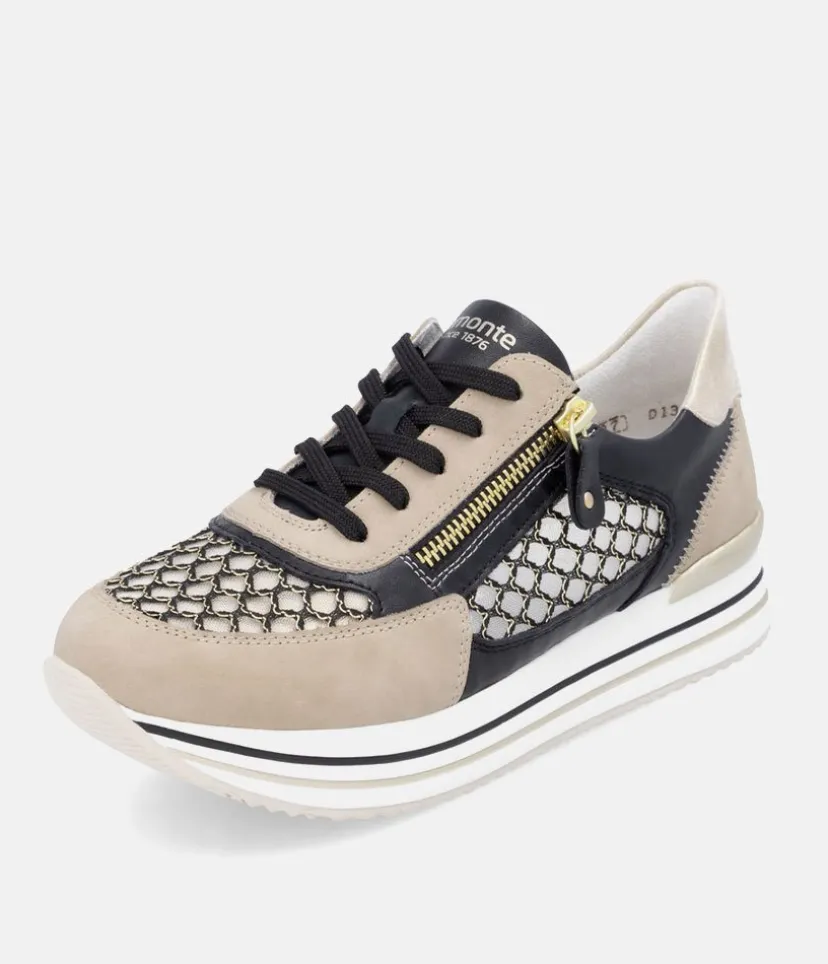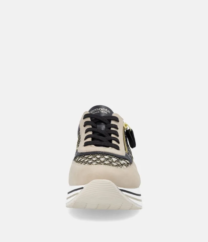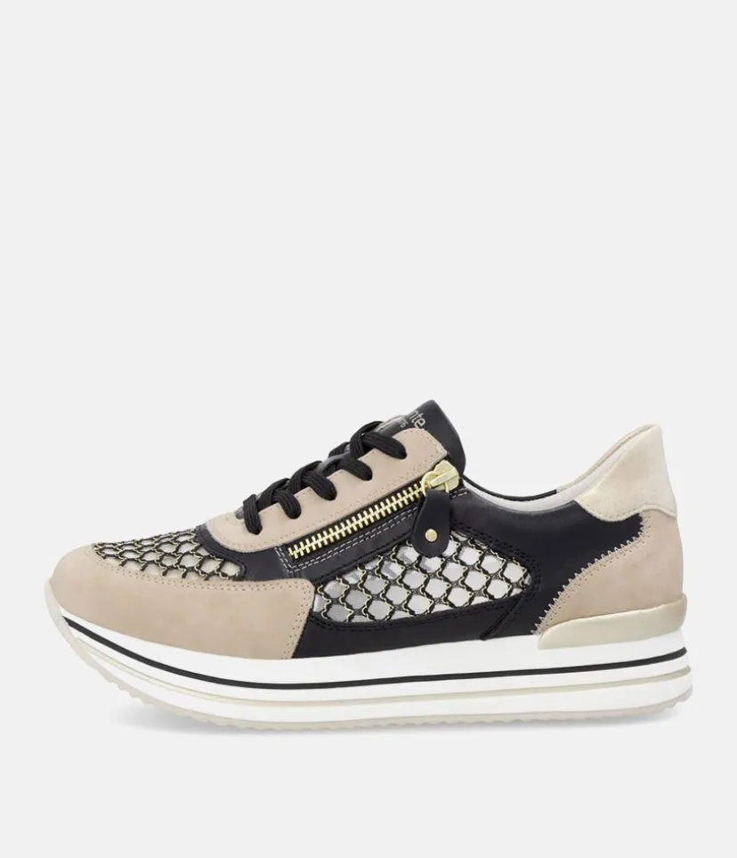 This is a comfortable and stylish black combination sneaker from Remonte. It features a lace-up closure with a side zip, a removable cushioned insole, a flexible sole with a slight wedge, and incorporates interesting textures and subtle accents for a fashionable look, making it a great option for everyday wear.