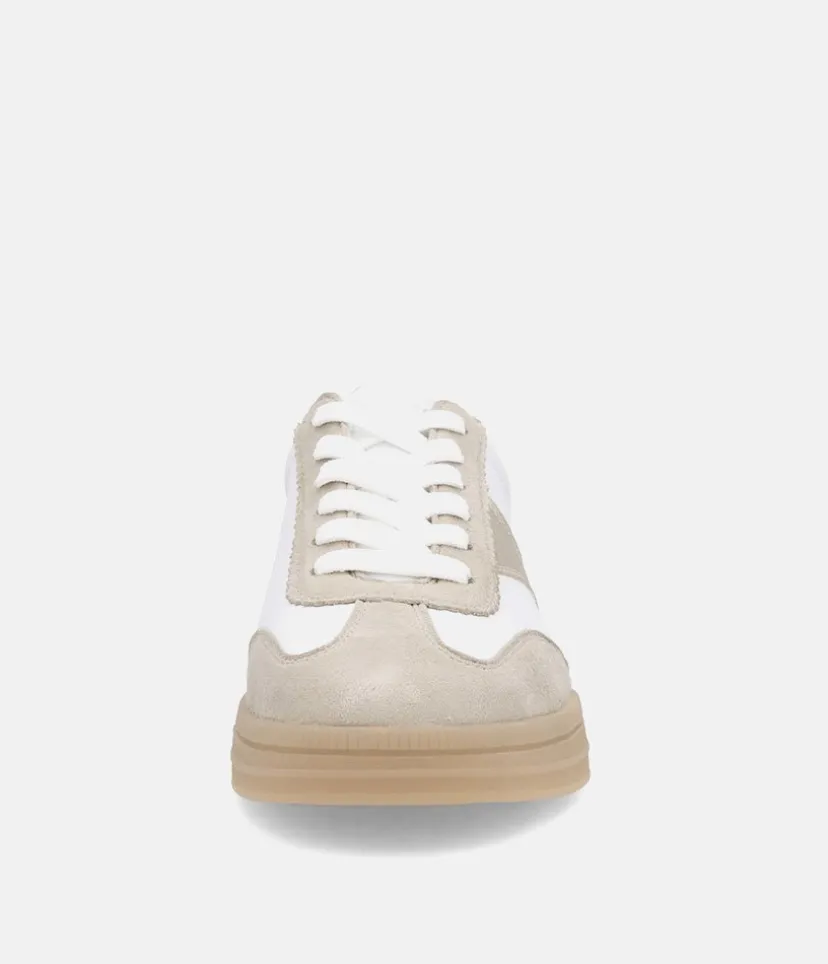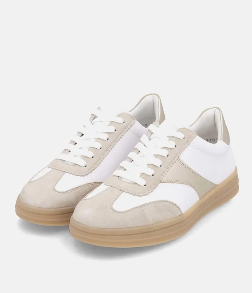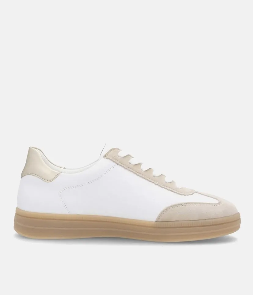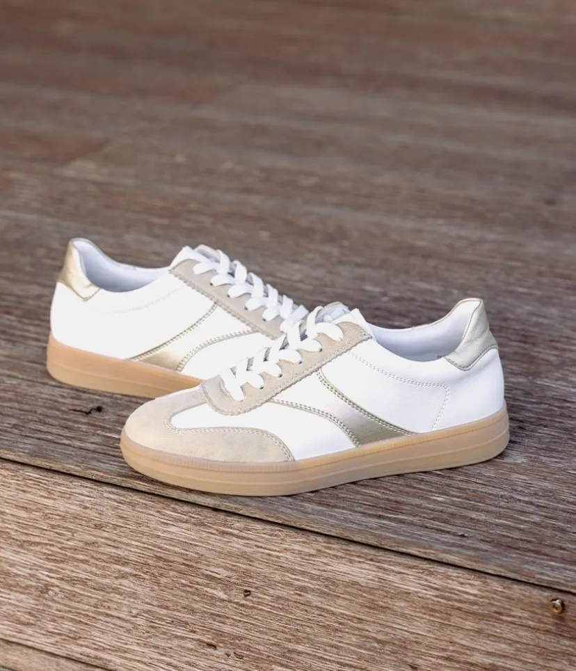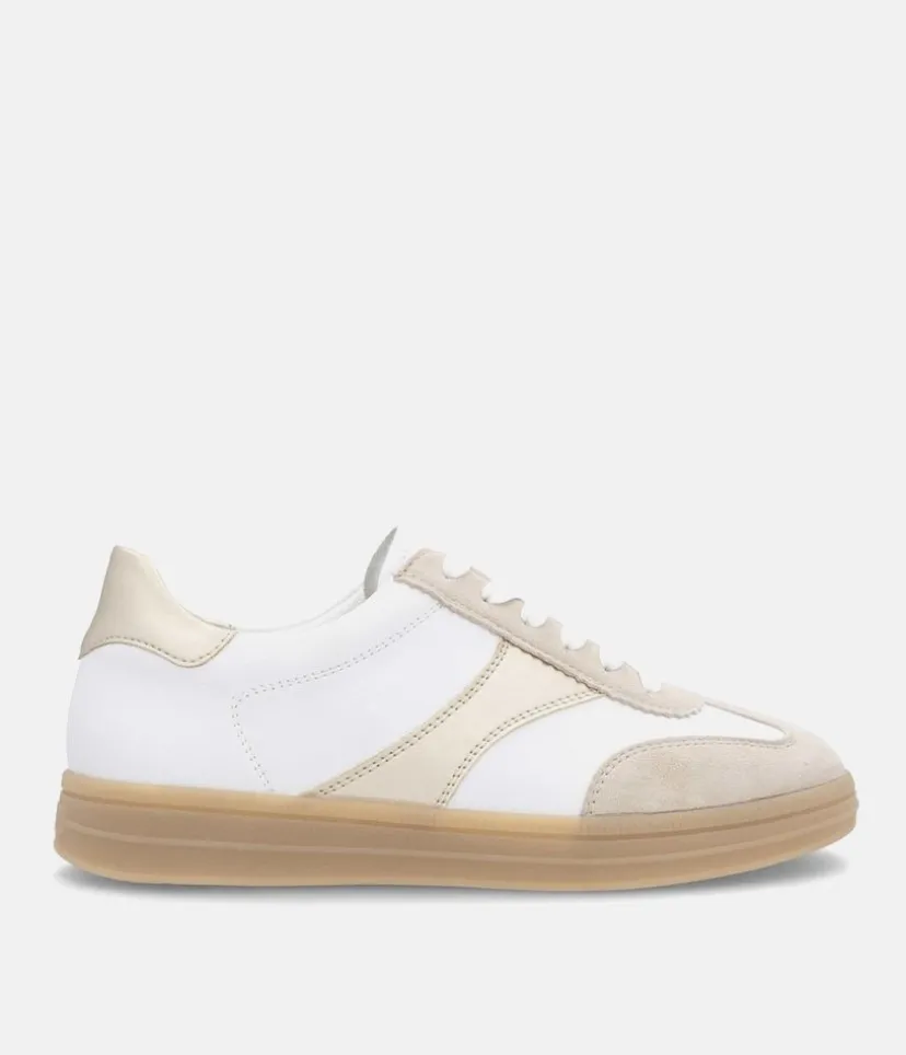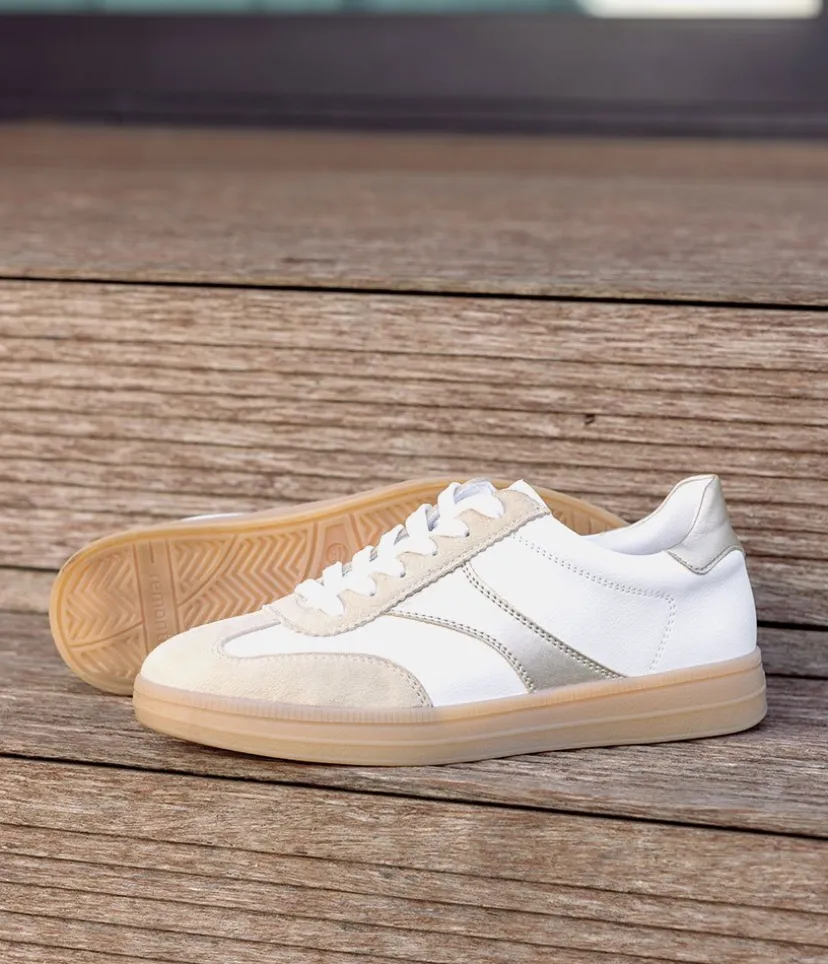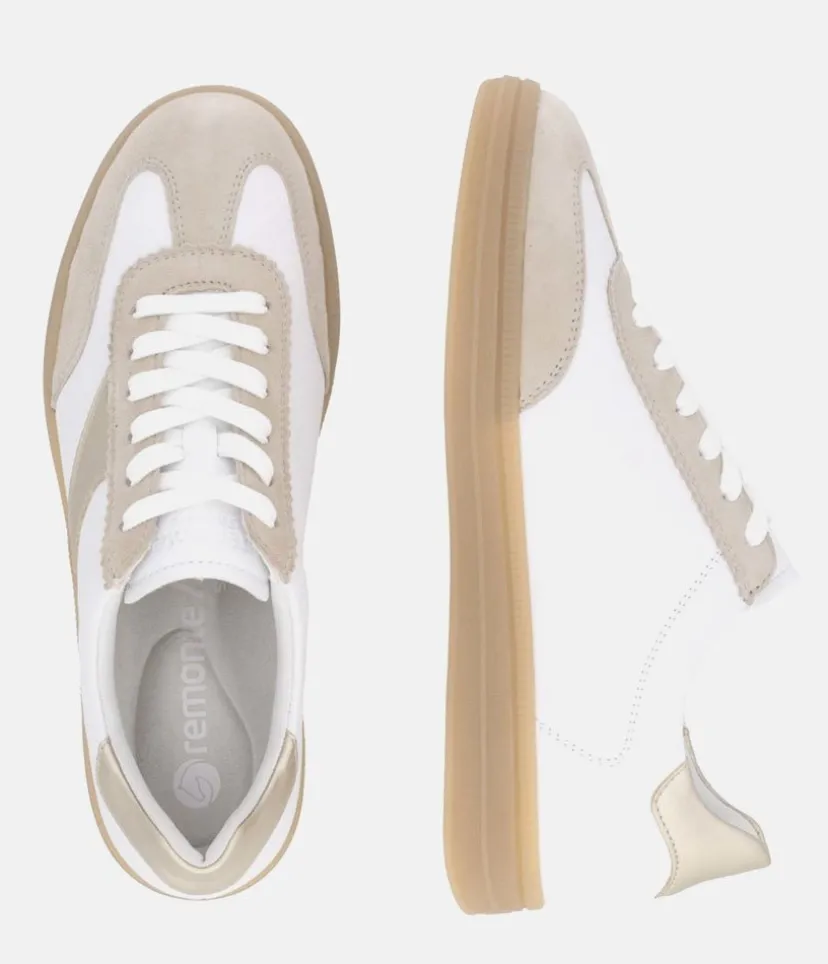 Introducing this New Style from Remonte; made in a beautiful combionation of white, beige and gold leather for durability and longevity. Crafted with a leather upper and textile lining, these trainers offer exceptional comfort and style. A cushioned and removable soft insole provides optimal comfort and moulds to the contours of your foot. The laces allow for an adjustable fit and the side zip makes it easy to slip on and off. This lightweight and stylish sneaker goes effortlessly with jeans and trousers for a versatile and fashionable look.