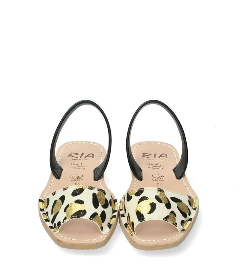 You can’t go wrong with these Leopard Print Abarca Style Sandals from RIA. This model combines the traditional shoe shape with a stunning Gold Leopard Print colour and contrasts with the sand-coloured insole and caramel sole to perfection.