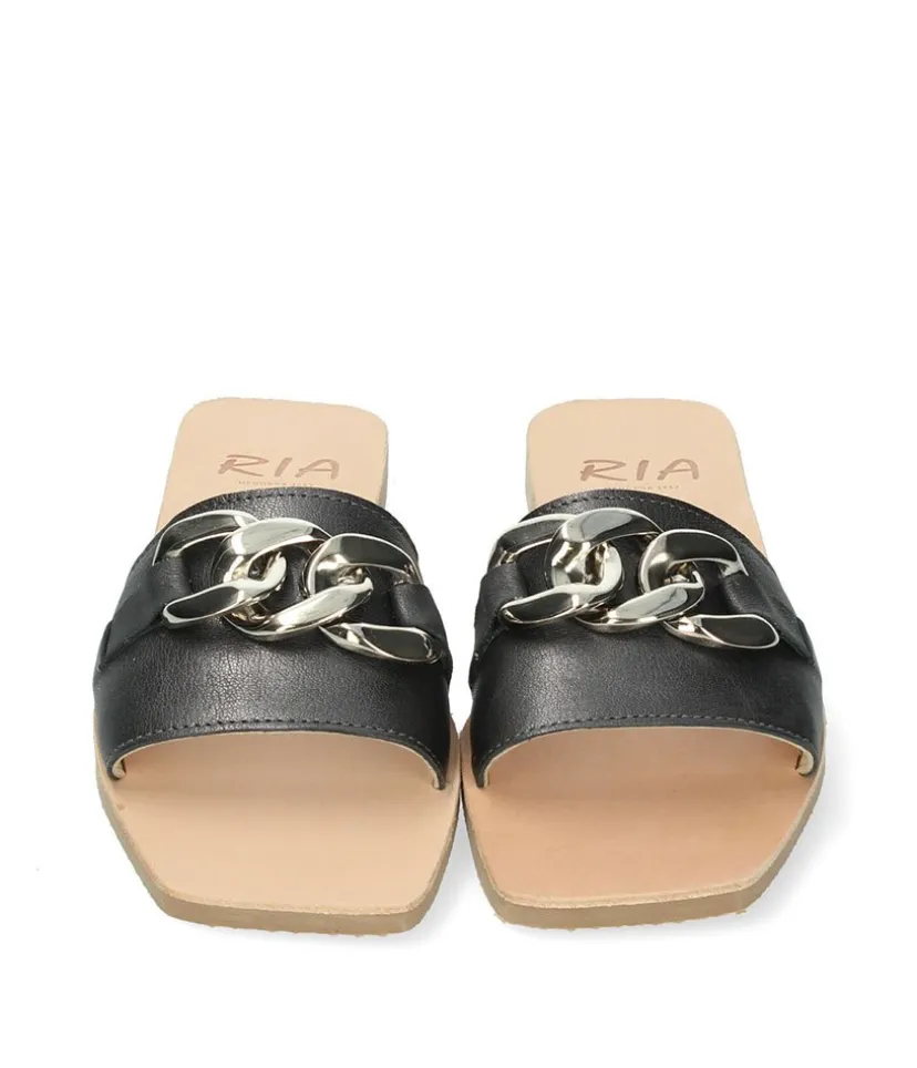 This is a Fashionable Style from RIA with a Leather upper and fabulous contrasting Chain detail on the upper. This model combines a fashionable square toe shape and the black leather contrasts with the sand-coloured insole and caramel sole to perfection.