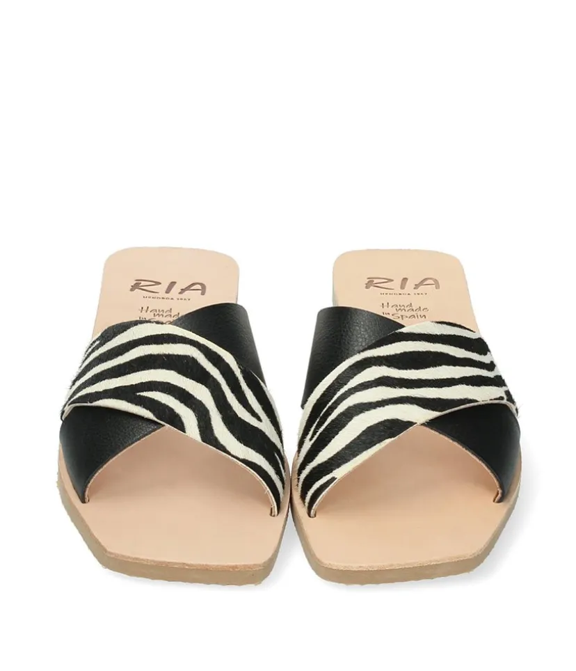 This is a Fashionable Style from RIA with cross over uppers and the contrasting Black and Zebra Leather upper gives a stunning finish to this sandal. This model combines a fashionable square toe shape and the leather upper contrasts with the sand-coloured insole and caramel sole to perfection.