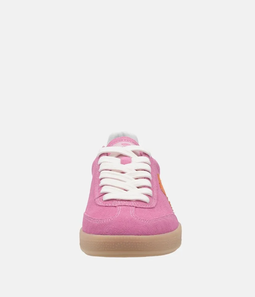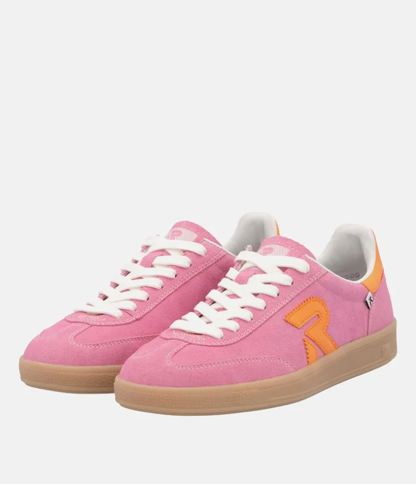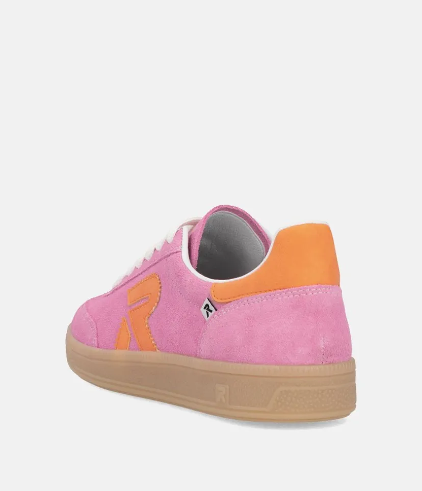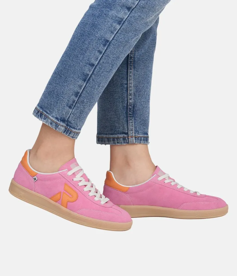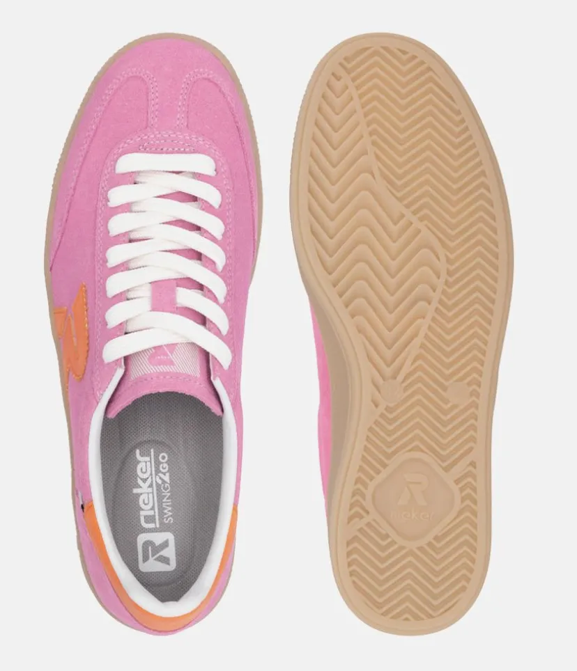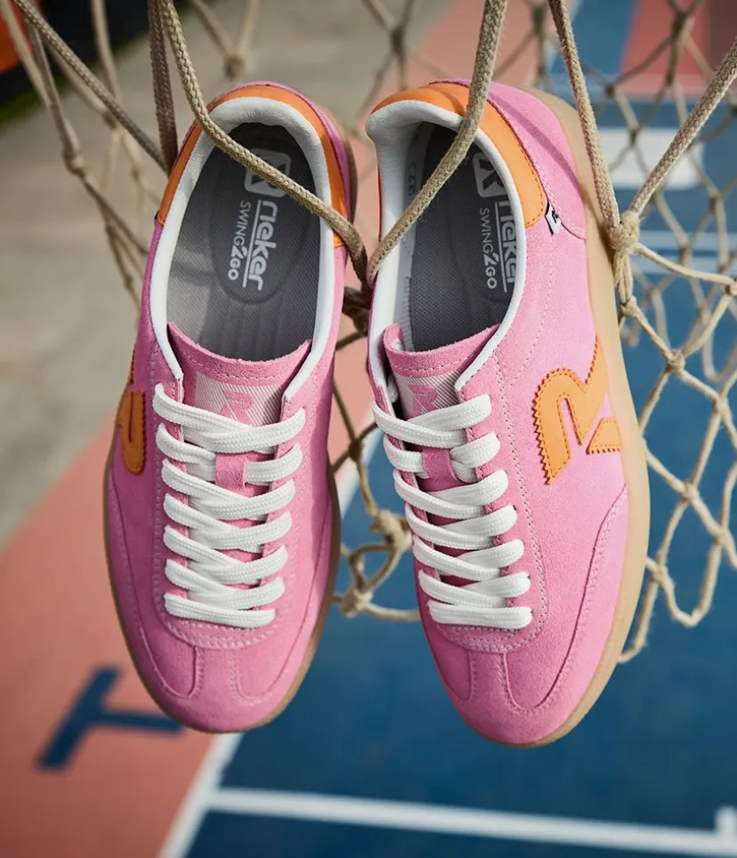 This is a Fabulous New Sporty low top Trainer from Rieker this season. Update your look and add a pop of colour to your wardrobe with these high quality Pink leather trainers, featuring contrasting orange panels. Fastened with white laces this New style offers comfort with the Swing2GO insole with arch support that provides shock absorption and energy at each step.The lightweight, wear-resistant and durable outsole provides good traction and stability. These pink Rieker low-top sneakers are made from high-quality suede leather.