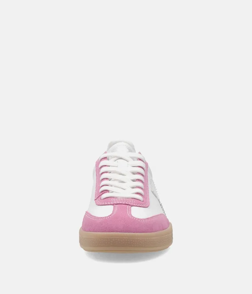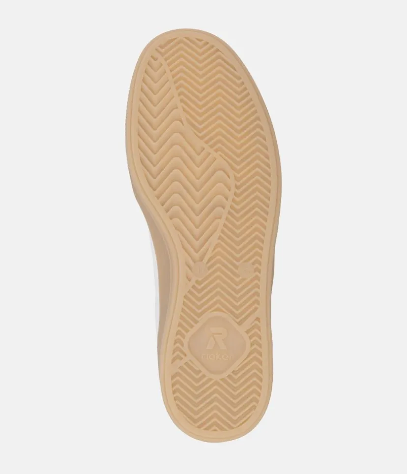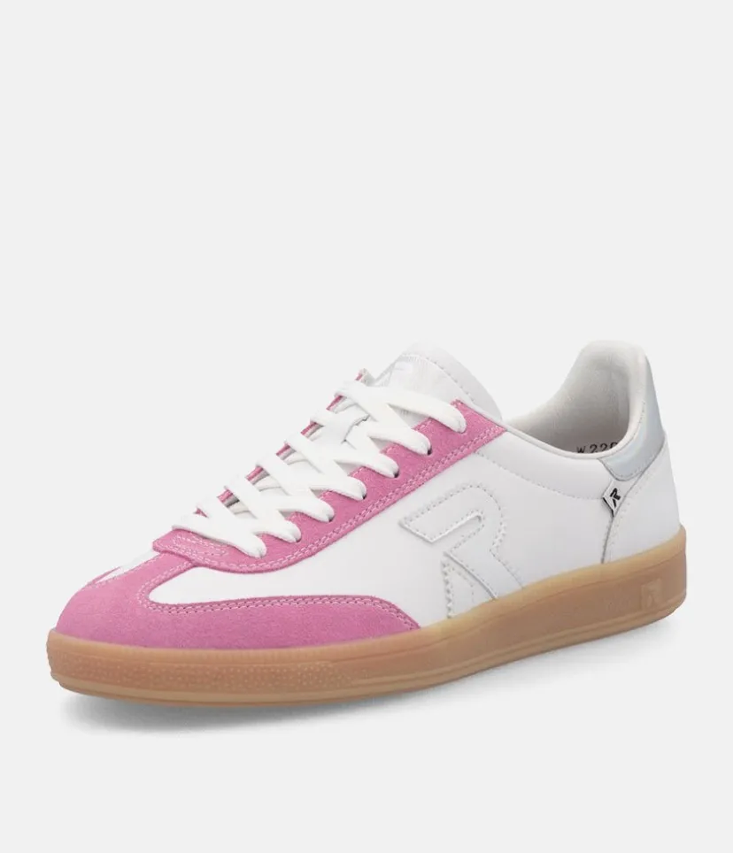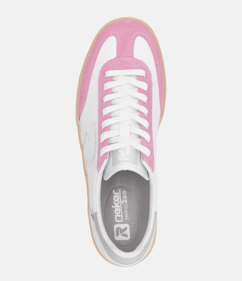 This is a Fabulous New Sporty low top Trainer from Rieker this season. Elevate your look and add these high quality leather trainers to your wardrobe. Featuring a White leather upper with Pink and Silver Trim. Fastened with white laces this New style offers comfort with the Swing2GO insole with arch support that provides shock absorption and energy at each step.The lightweight, wear-resistant and durable outsole provides good traction and stability. These Silver Rieker low-top sneakers are made from high-quality leather.