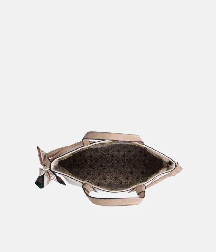 A practical cross body bag from Rieker in Cream with tan accents with a decorative tie on scarf. With handles and infinitely adjustable strap it can be worn over the shoulder or across the body.