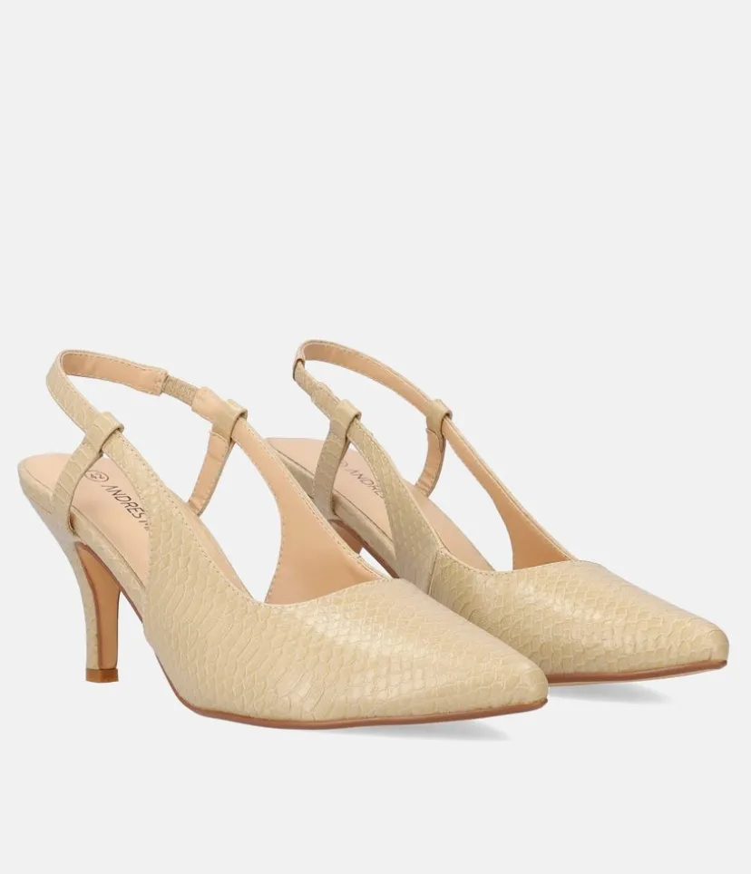 Classic elegant high heeled slingback shoes in a soft beige snake print with an elastic back strap for the perfect fit.