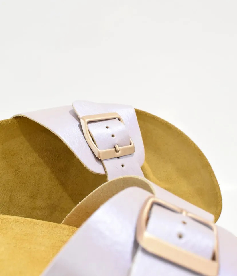 A Modern sandal with a strap, buckle and a contoured cork footbed combine to create a simple everyday chic look. This versatile slide will be a favourite in your wardrobe this season.