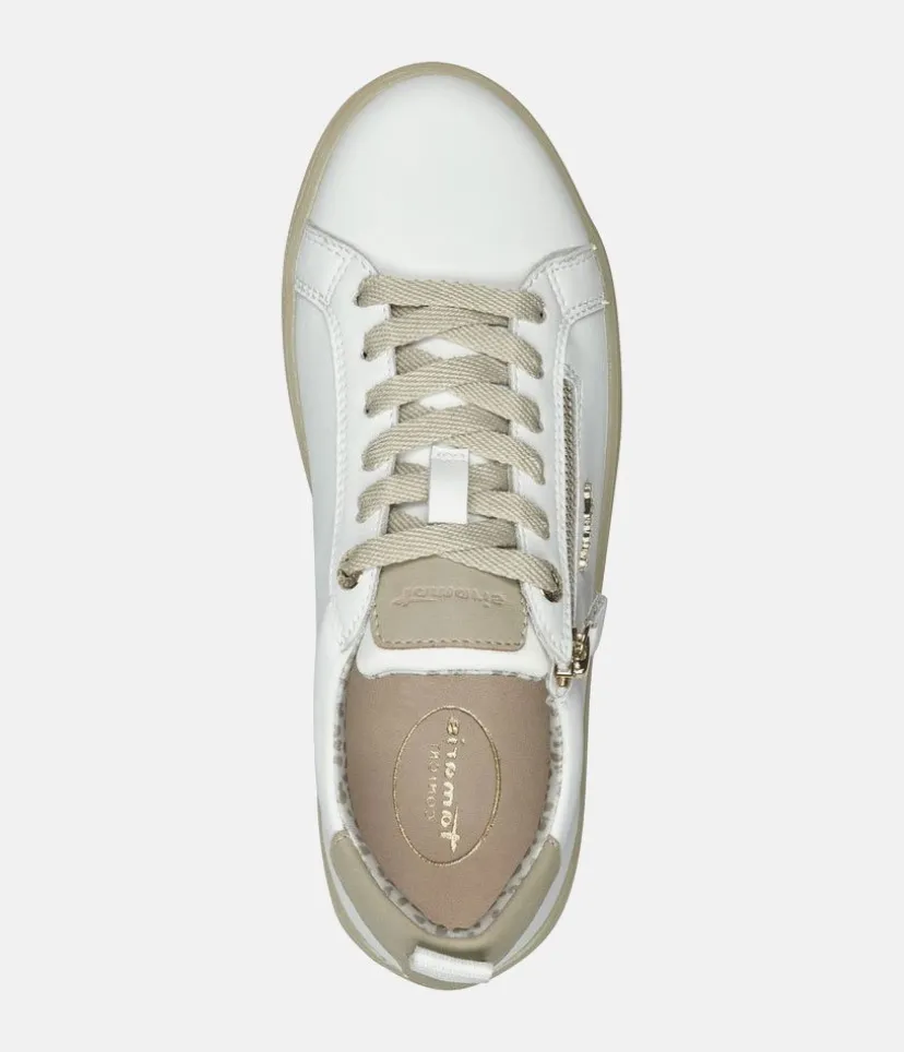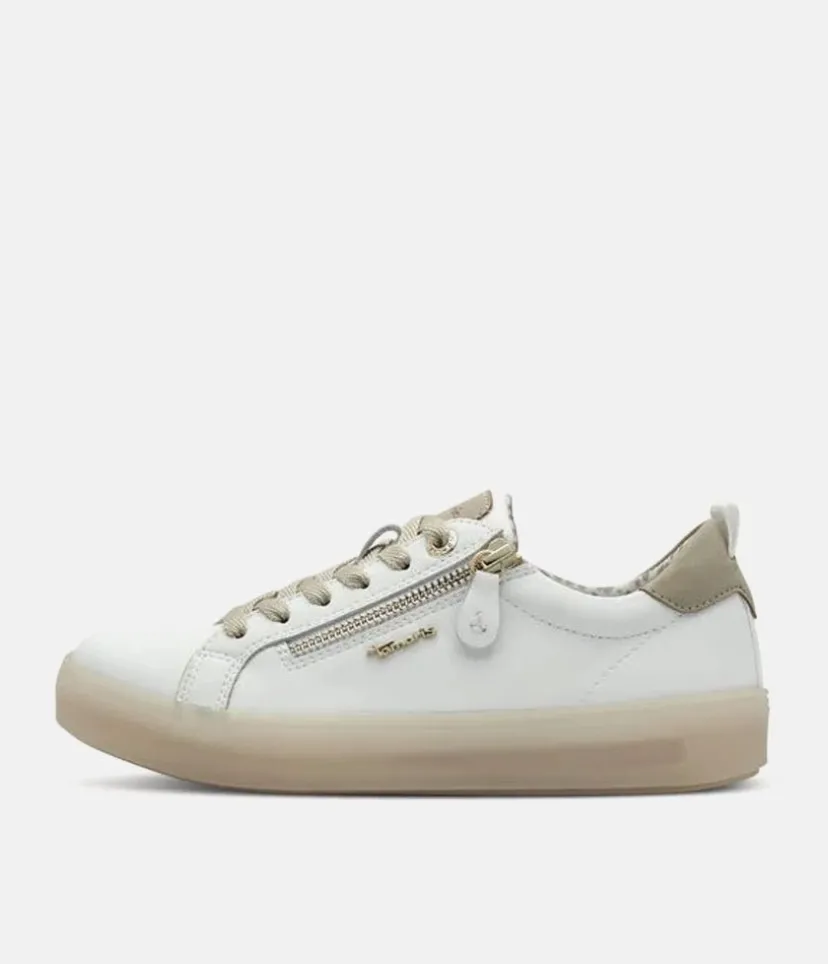 You will love this TAMARIS women’s sneaker from their COMFORT collection in White with Beige trim. This is a Fashionable Trainer but also is a Comfortable fit with superior cushioning. Featuring a handstitched Leather upper, removable insole and with lacing and zipper for easy on and off.