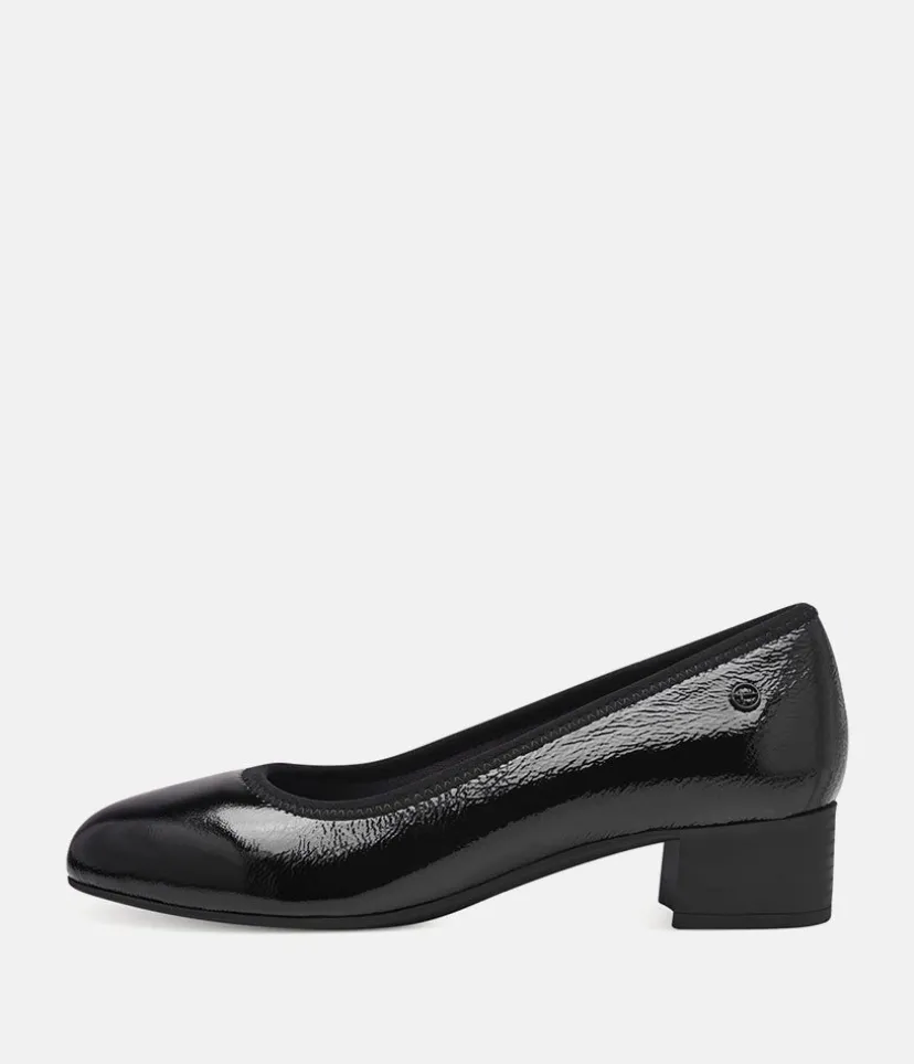 A Classic Block Heel Court shoe style from Tamaris crafted in Patent Leather with leather lining. The sleek elegant design ensures these shoes are easy to style with many outfits for a number of occasions. The low block heel is practical yet stylish and is perfect if you are wearing heels for longer periods of time. The block heel aids with stability and helps to absorb pressure on your foot. This classic style is definitely a wardrobe staple.