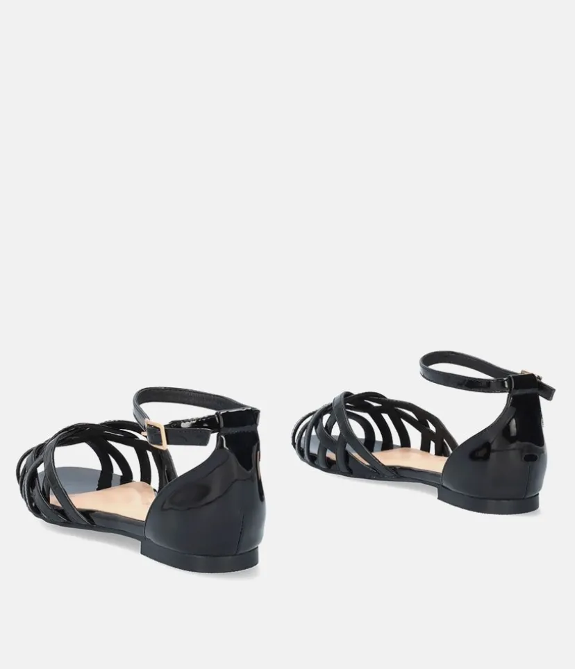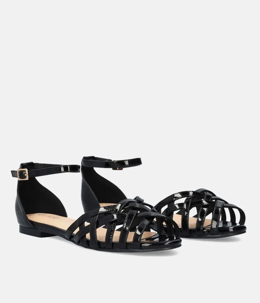 A classic patent finish in these black sandals make this a versatile pick this season. Featuring a closed flat heel, open rounded toe and an ankle strap to give your look a touch of chic. Great to pair with Jeans or dresses.