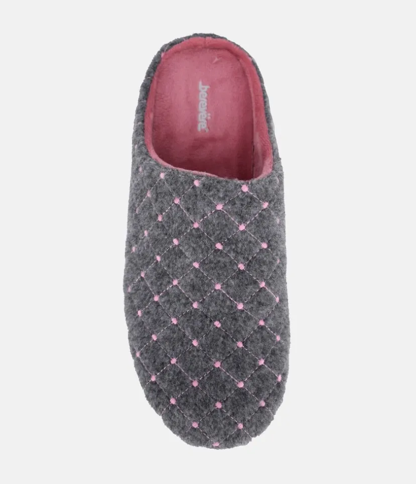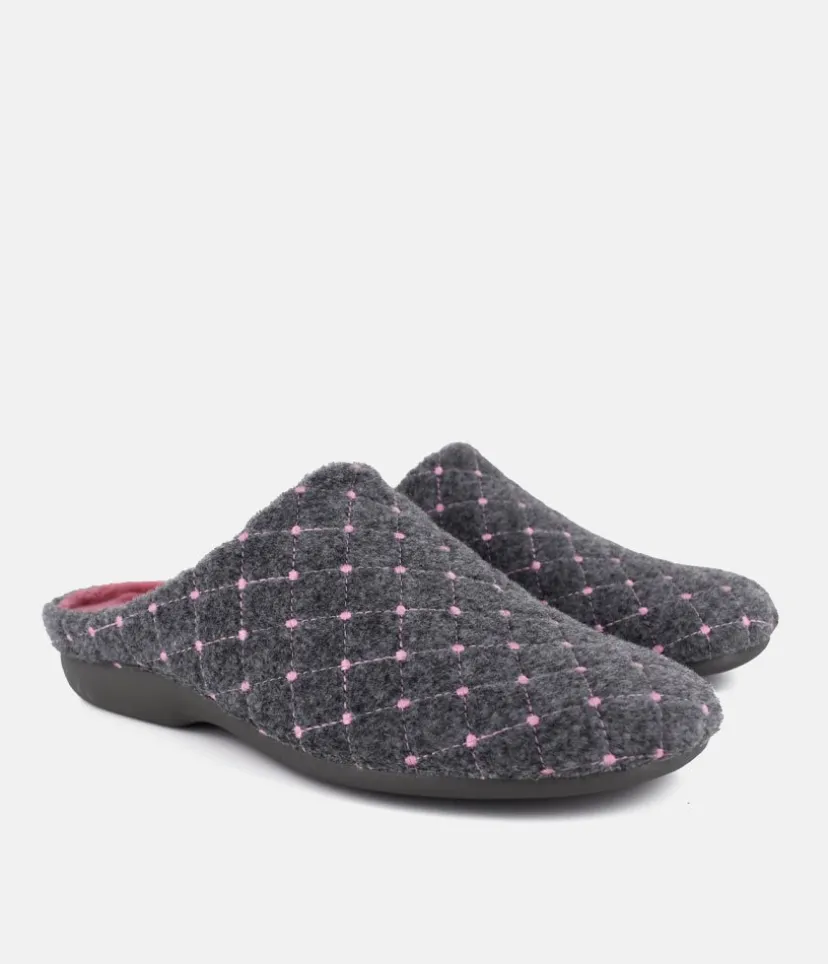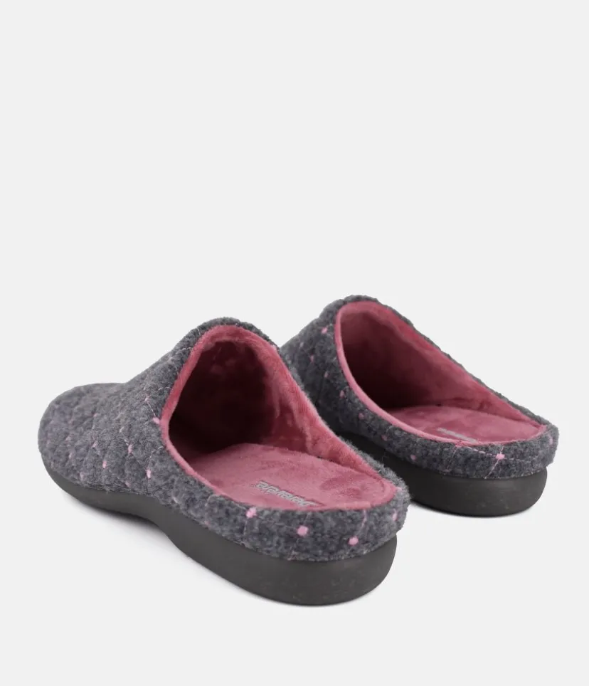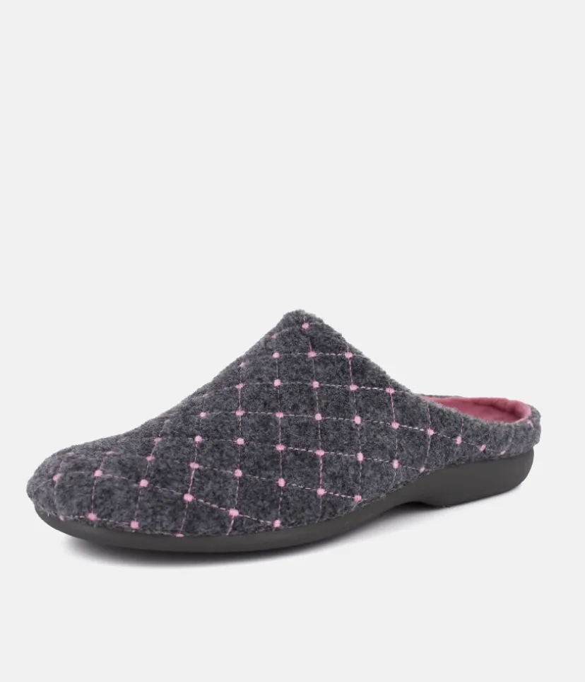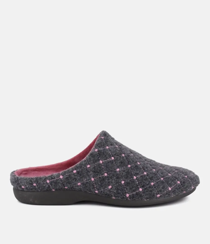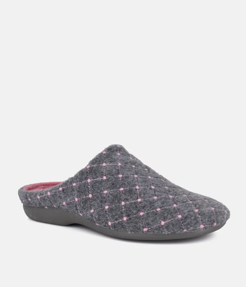 These are lovely cosy slippers and are very comfortable to wear with a pretty Grey and Pink pattern on the upper and pink footbed. Resistant and easy to maintain natural vulcanised rubber sole. A vulcanised sole is where the rubber has been made stronger and more durable.