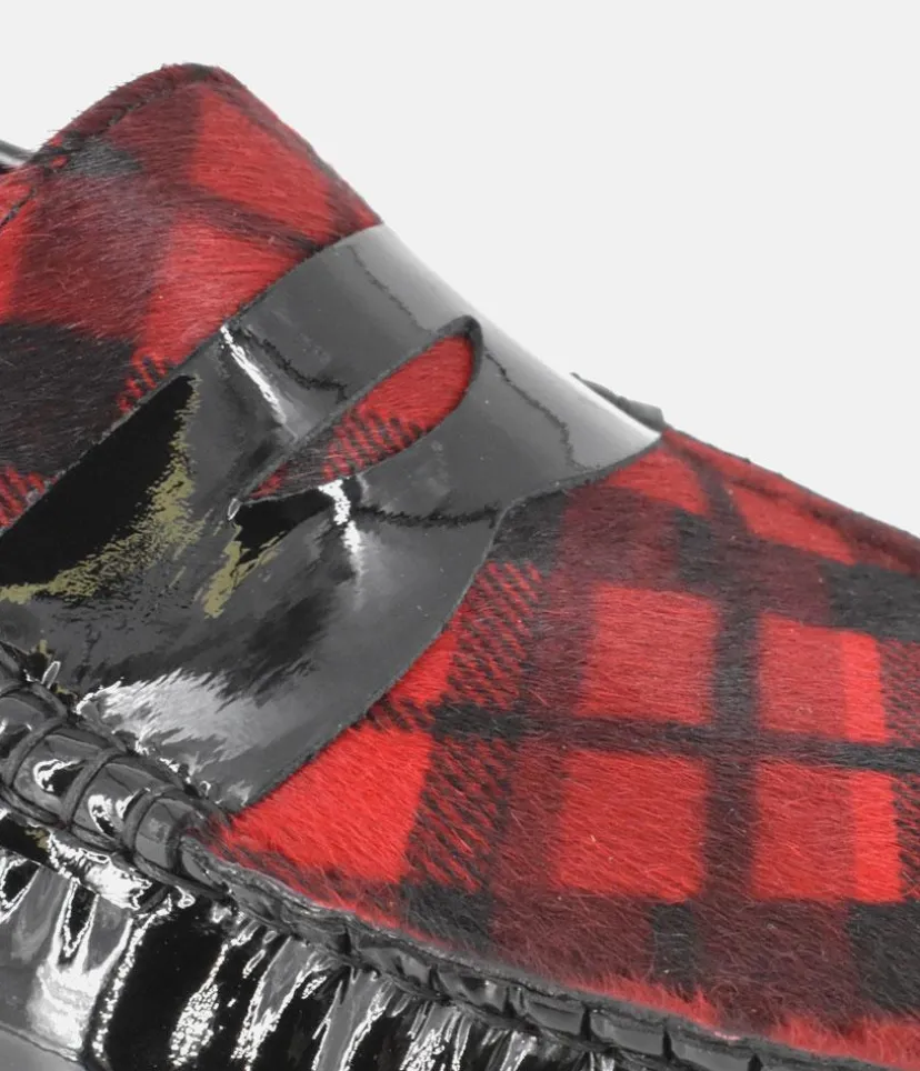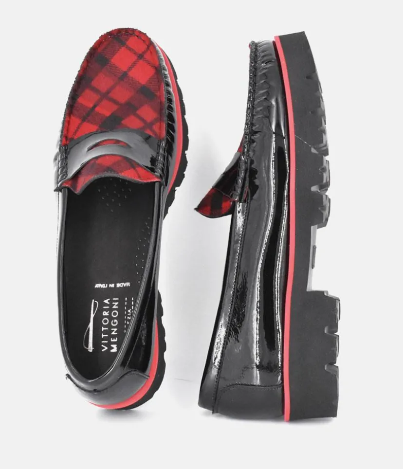 This style features a chunky sole with a beautiful combination of Patent leather upper and finished to perfection with a contrasting red tartan design. These loafers by VITTORIA MENGONI are exquisitely handmade by Italian Craftsman, using only top quality Italian leathers and hand adorned accessories. Super comfortable to wear, with their super soft leather and padded insole which ensure all day comfort.