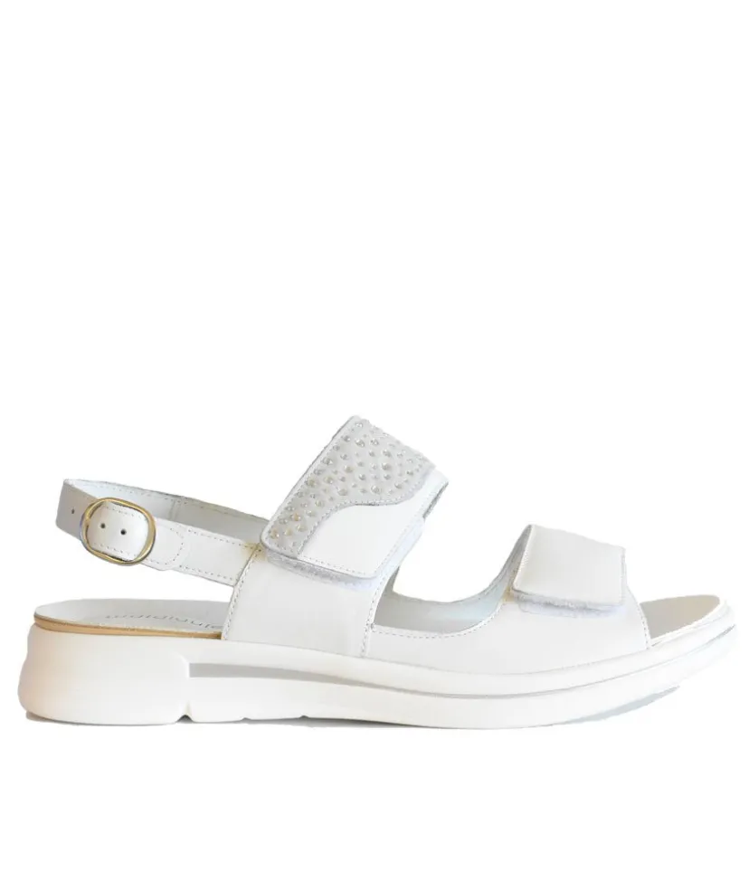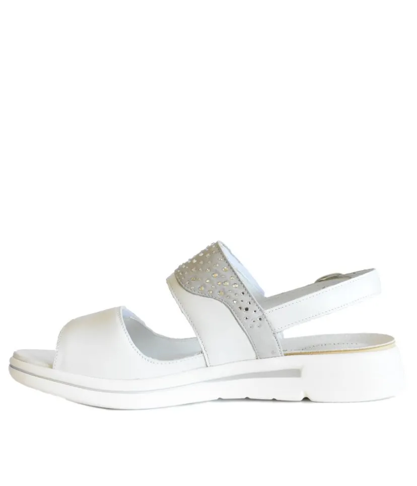Part of our German Orthopedic wide fitting Collection. This is a pretty White sandal with Grey Trim and beading on the front strap. Velcro toe and ankle straps allows for easy on and off and enables this to fit all widths. This sandal is so versatile with leather upper, leather lining and rubber sole with removable footbed.