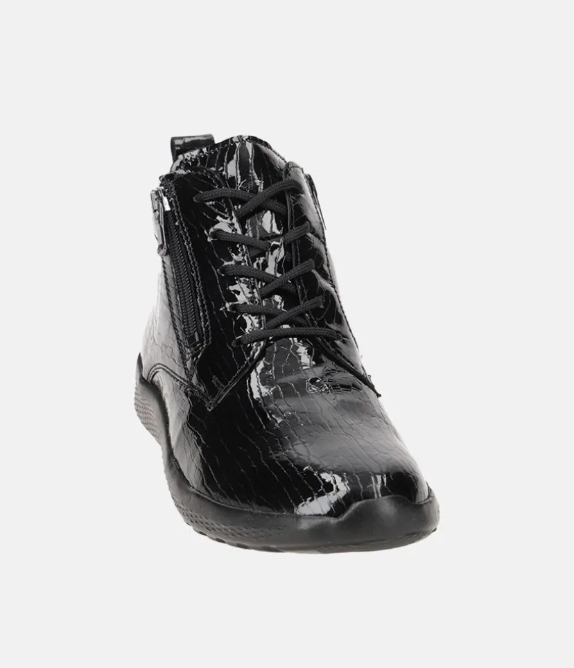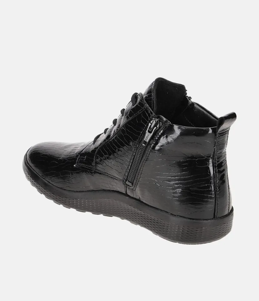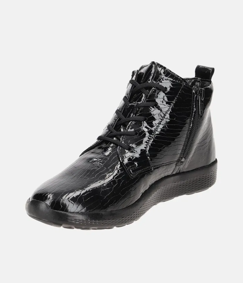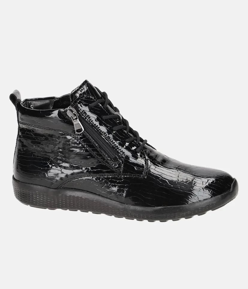 Make a statement with these Versatile Patent leather ankle boots. A slight wedge heel, cushioned insole and full leather lining ensure all-day comfort. A versatile style, great to pair with almost any outfit.
