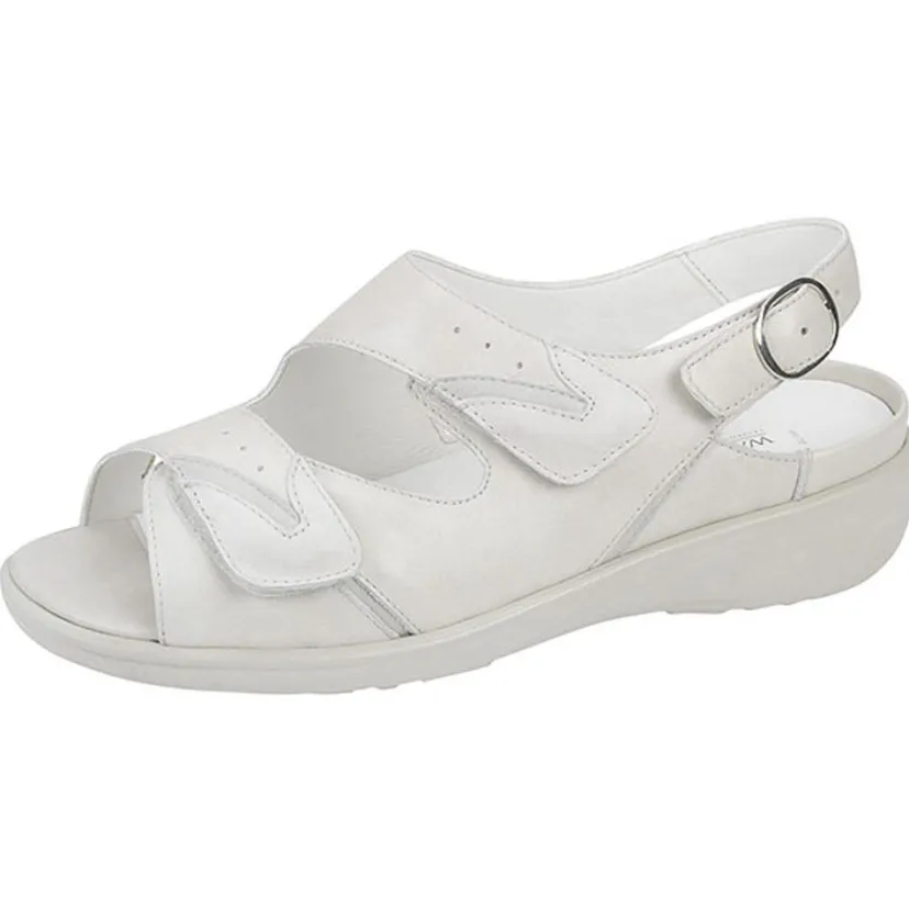 Part of our German Orthopedic wide fitting Collection. This white slingback sandal with open toe and velcro straps,which enables this to fit all widths.This sandal will compliment any outfit. Leather upper, leather lining and rubber sole. M or EEE fit.
